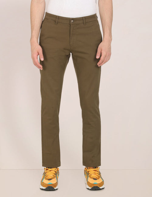 Men Dark Khaki Denver Slim Fit Solid Casual Trousers