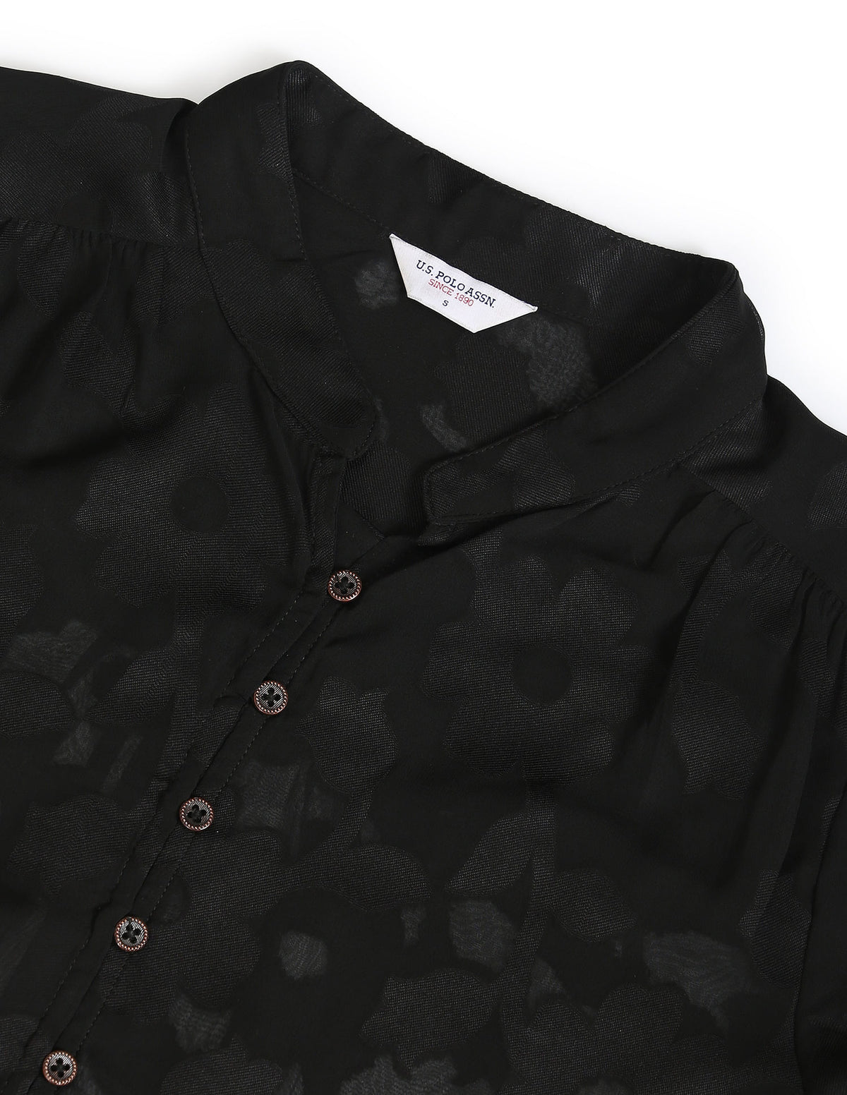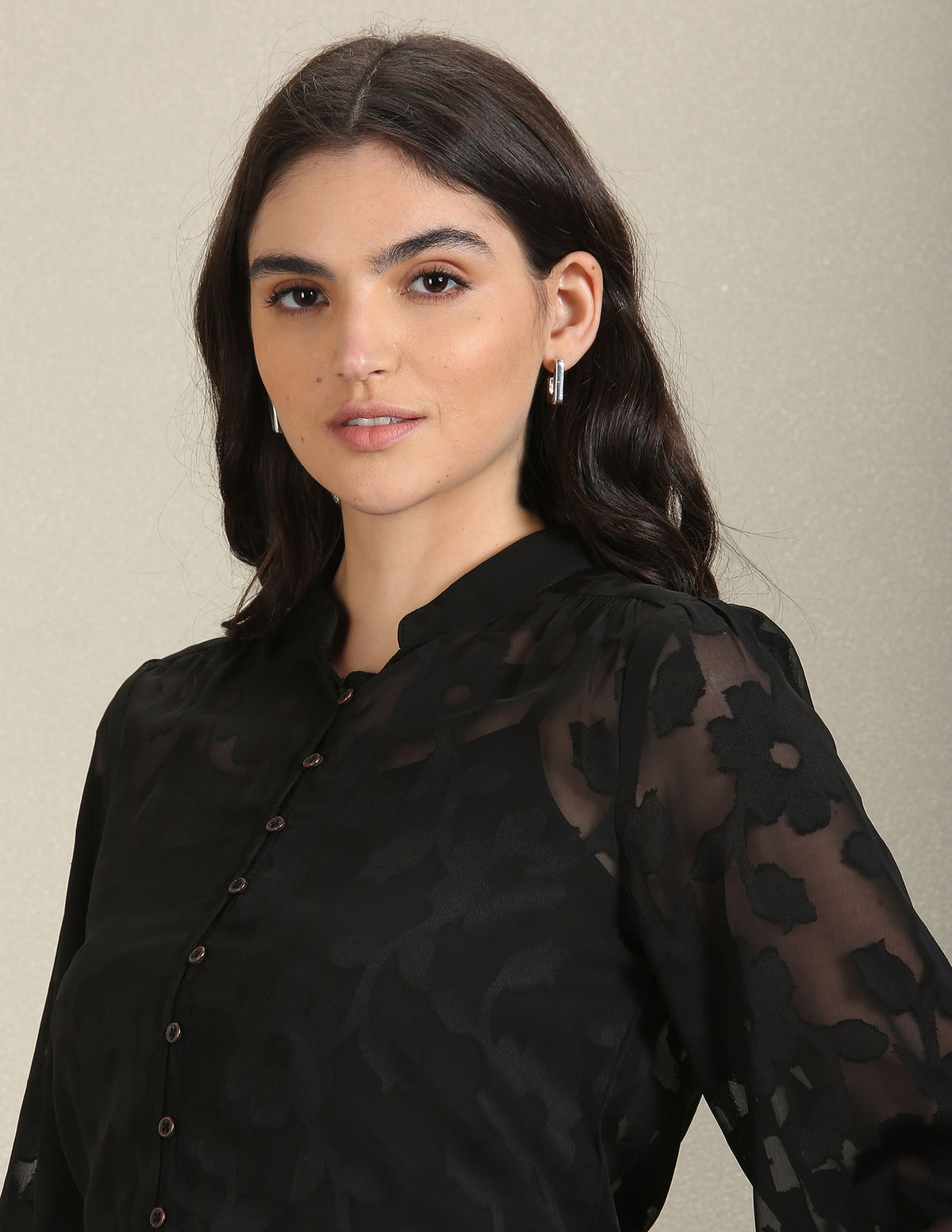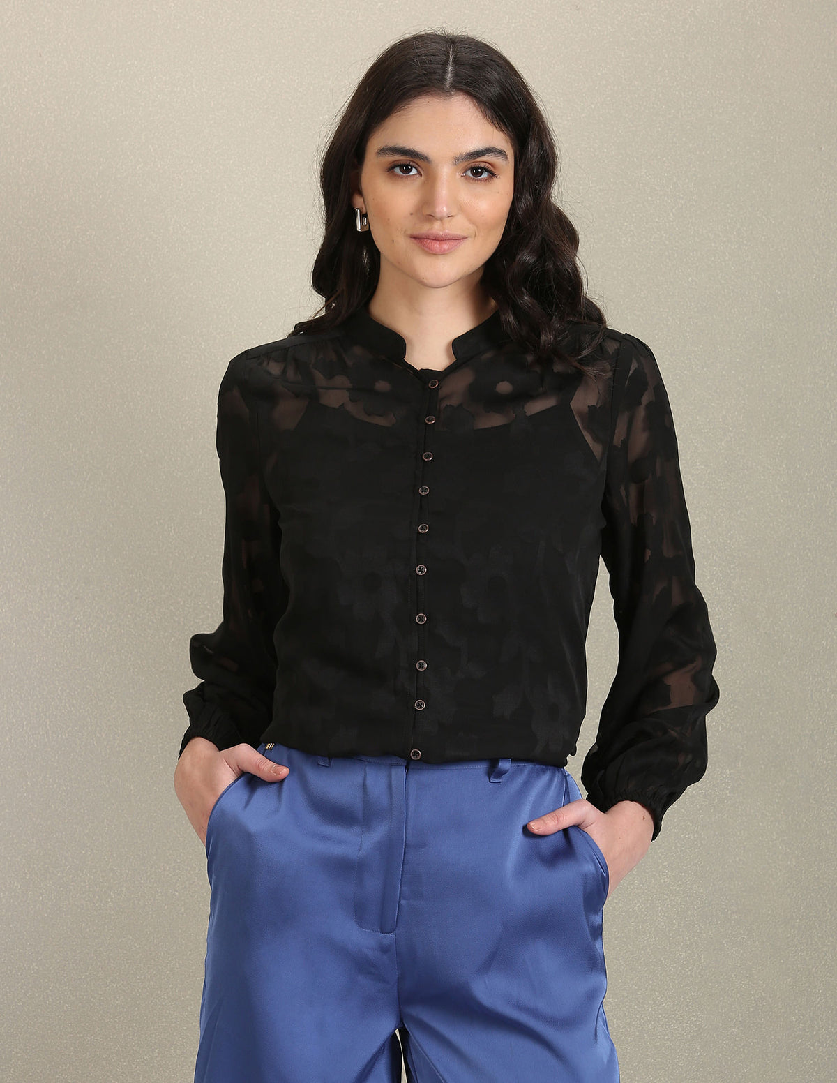Story: This long-sleeve shirt is accented with a mandarin collar, straight hemline and all-over lace detail.