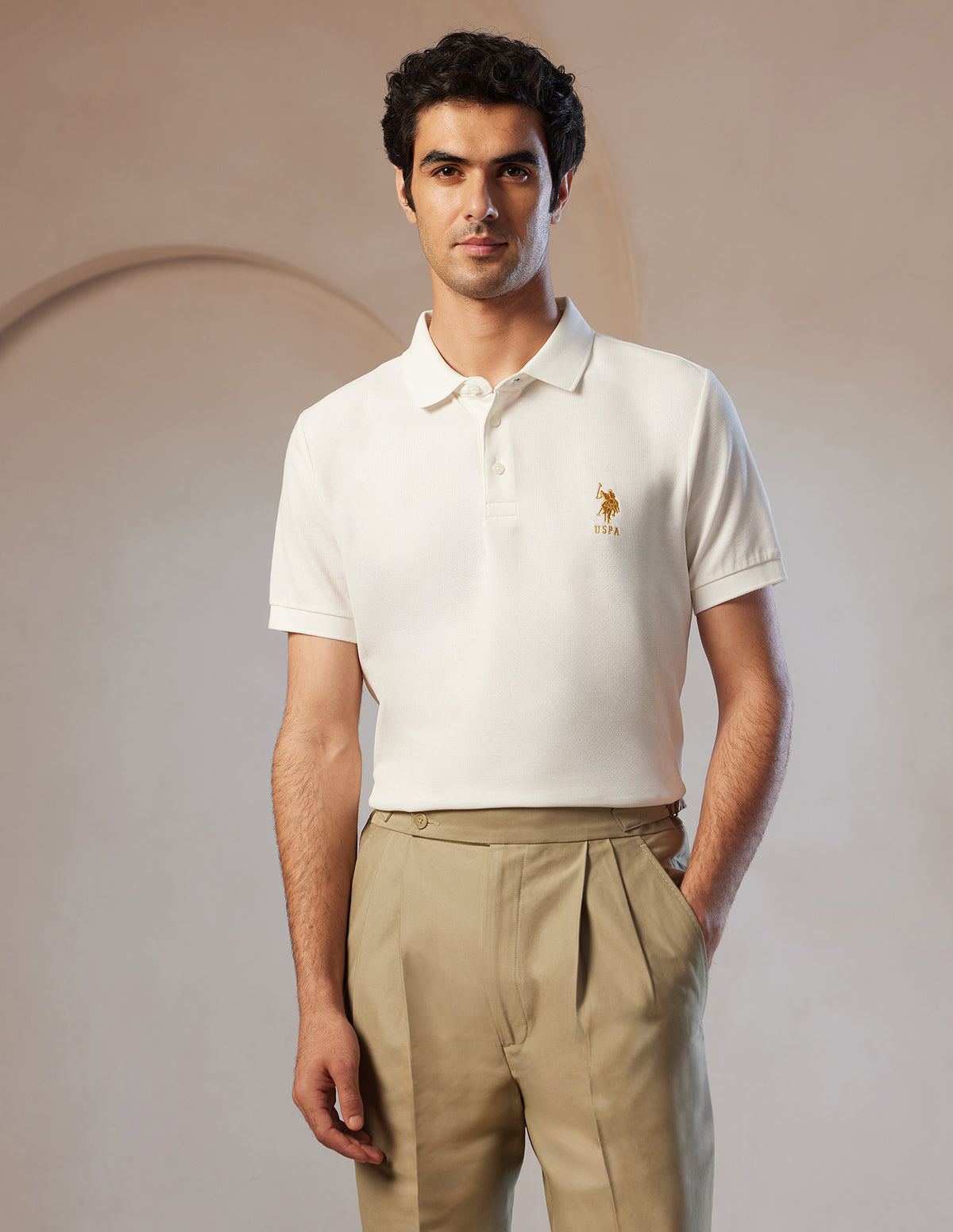 Story: Immerse yourself in the captivating charm of Jaipur's majestic elegance with our newest fashion collection. Enhance your wardrobe with a variety of exclusive styles that are inspired by Sawai Padmanabh Singh Ji, and add the exquisite new Pacho collection to your seasonal closet. Featuring an intricatly embroidered logo. This polo shirt is knitted with fine quality cotton and cutinto slim fit to give you that classic look.