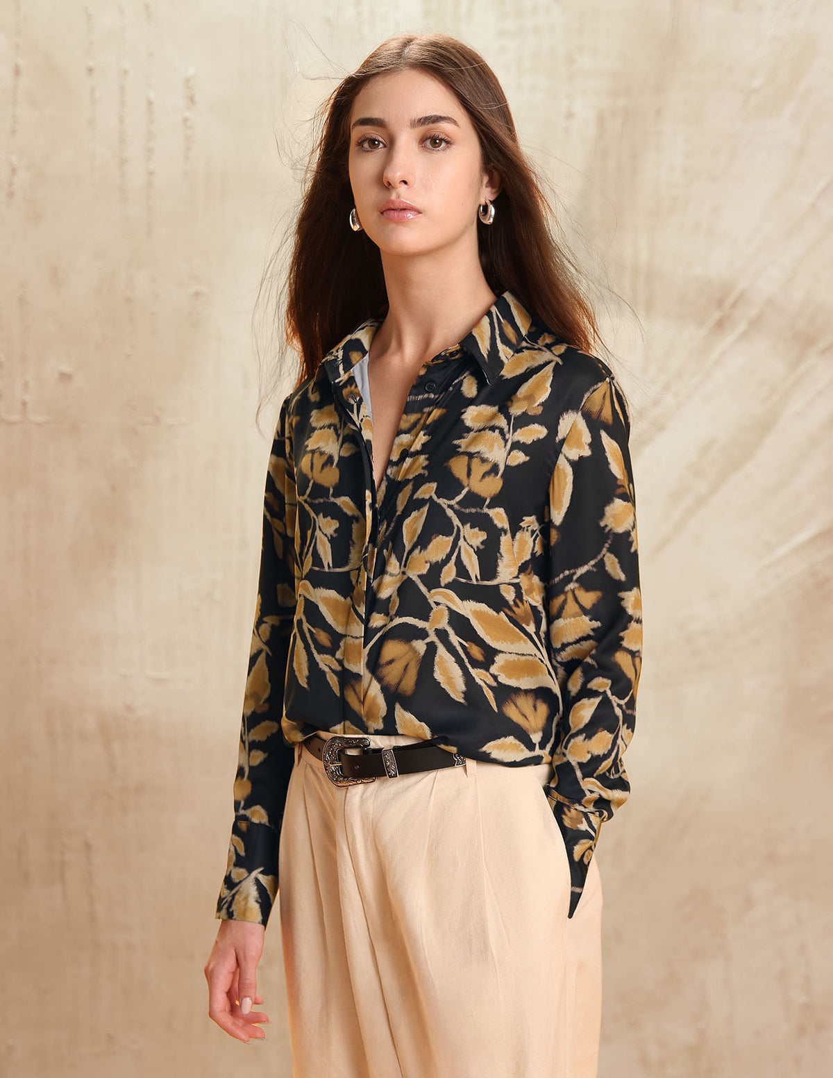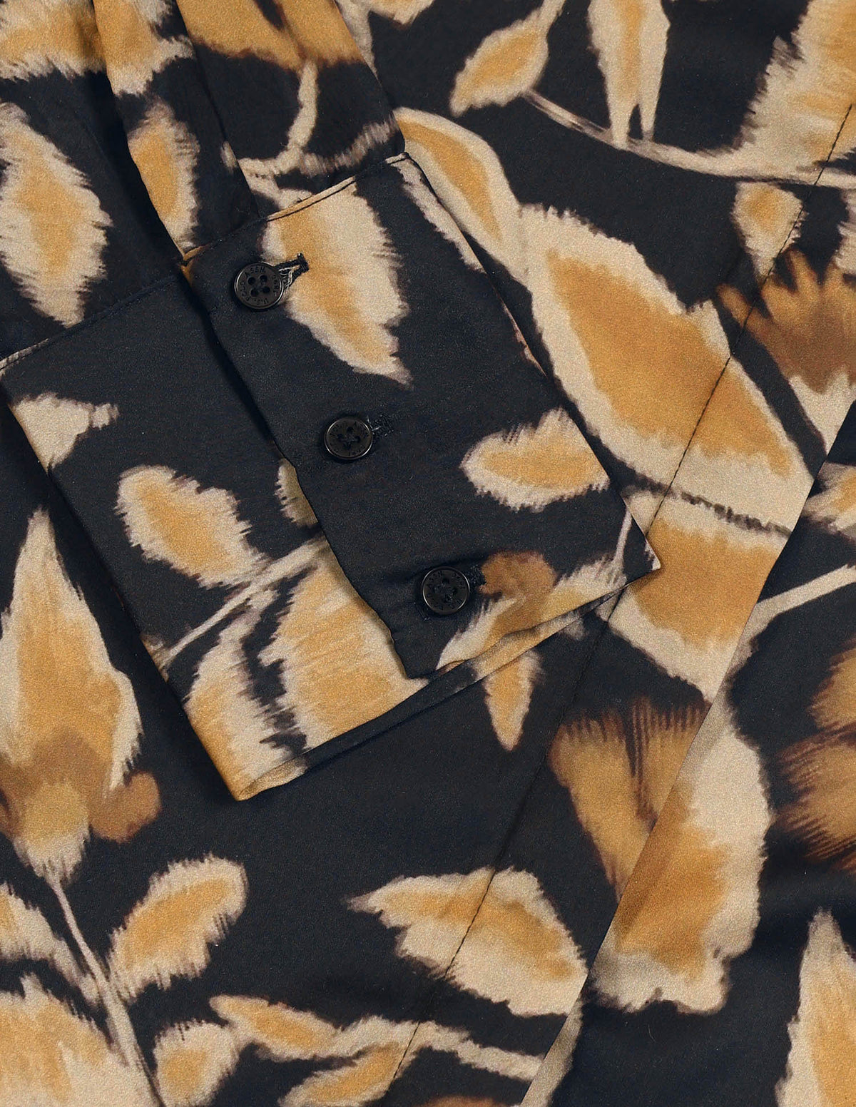 | Spread collar | Full button placket | Long sleeves with barrel cuffs | Curved hemline | Floral printed pattern | Satin weave | Regular fit |