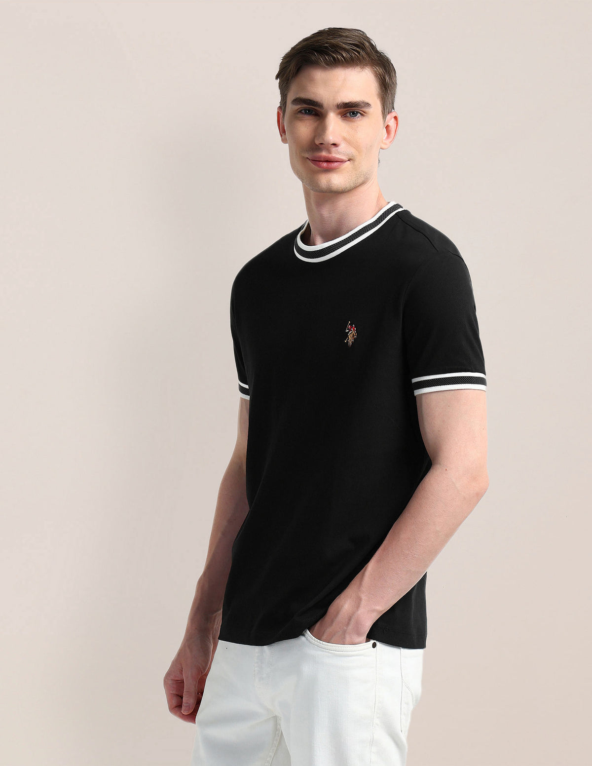 | Ribbed crew neck | Short sleeves | Straight hemline | Solid pattern | Knitted | Muscle fit |
