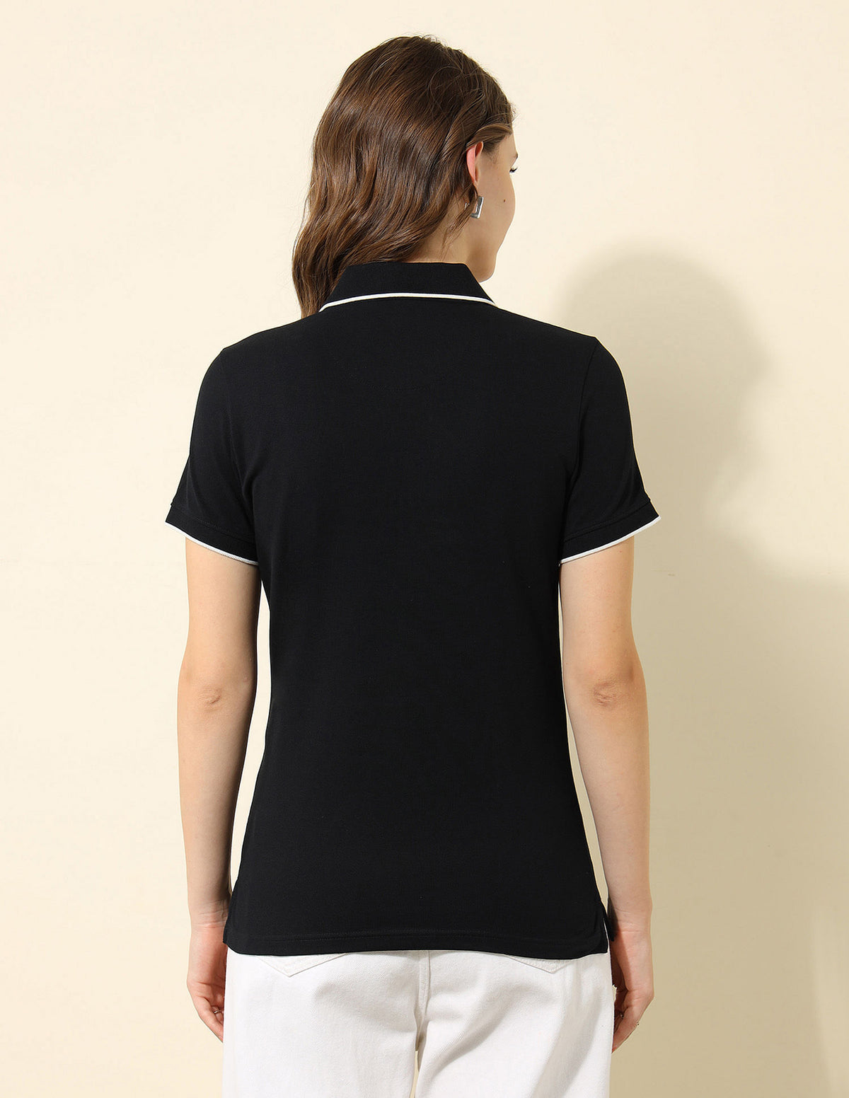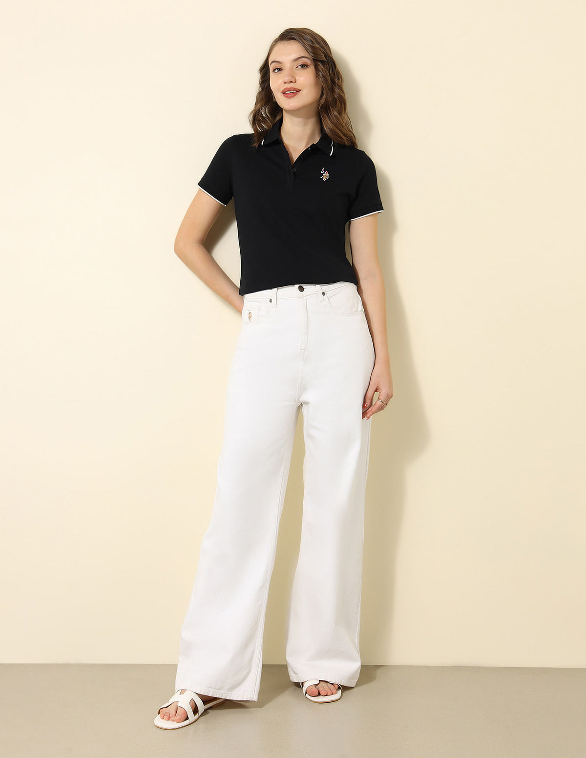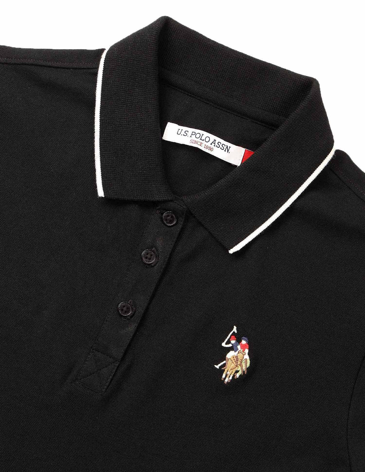 | Polo collar | Logo at chest | Short button placket | Short sleeves | Ribbed collar and sleeve hems | Uneven vented hem | Solid pattern | Pique knit | Regular fit |