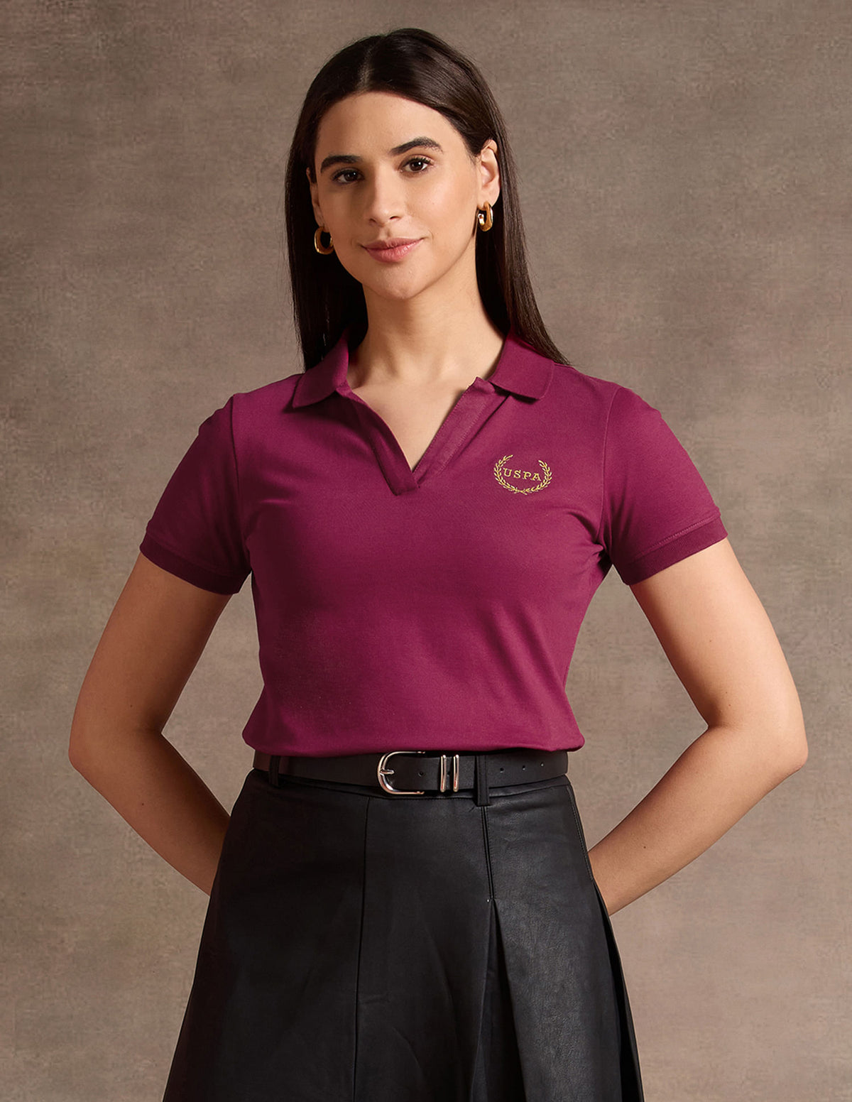 | Polo collar | V-neck | Logo at chest | Short sleeves | Ribbed collar and sleeve hems | Vented hemline | Solid pattern | Pique knit | Regular fit