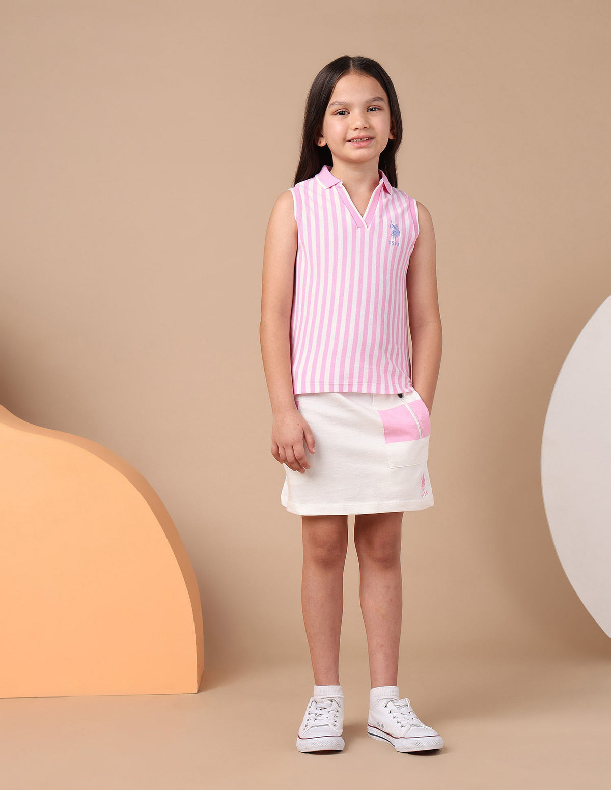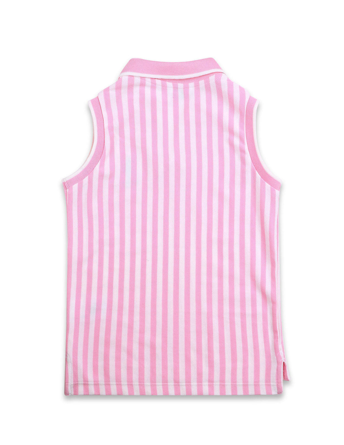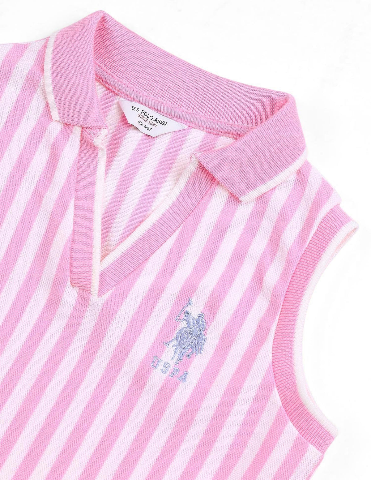 | Polo collar | Logo at chest | Short open placket | Short sleeves | Ribbed collar and sleeve hems | Uneven vented hem | Vertical striped pattern | Pique knit | Regular fit |
