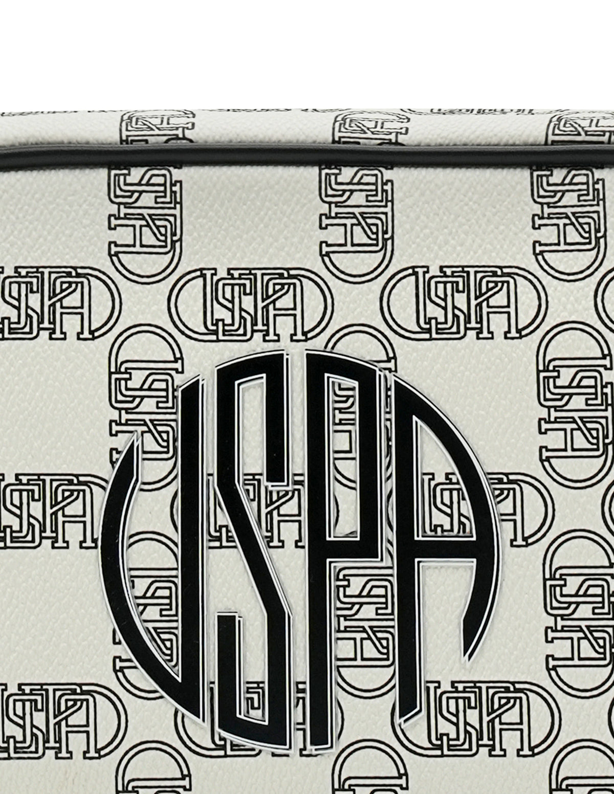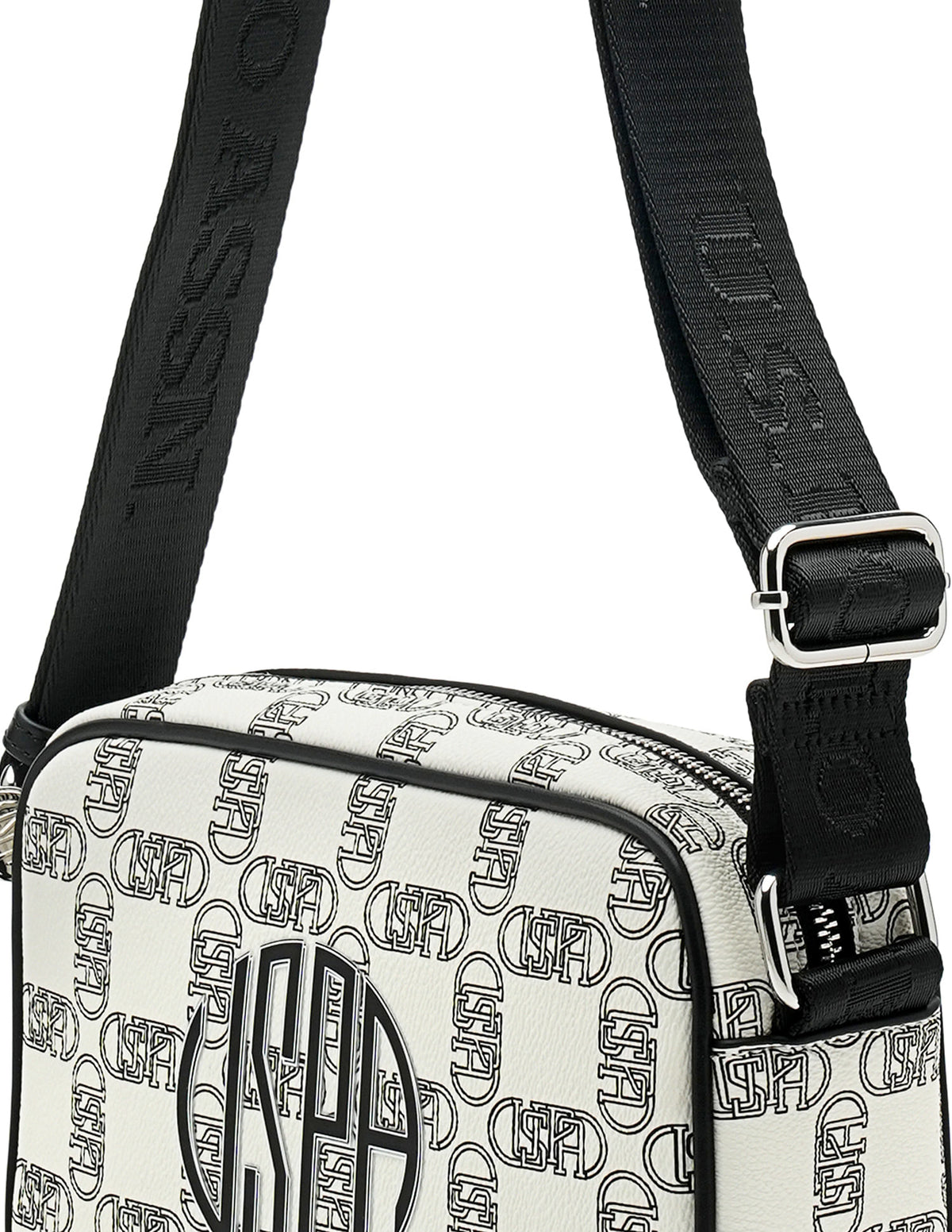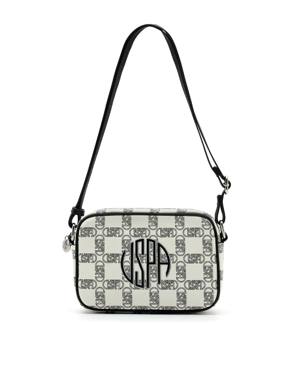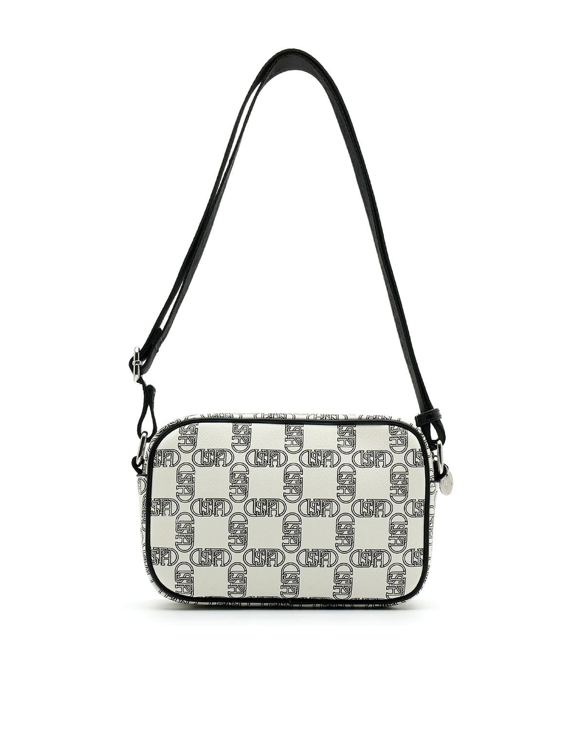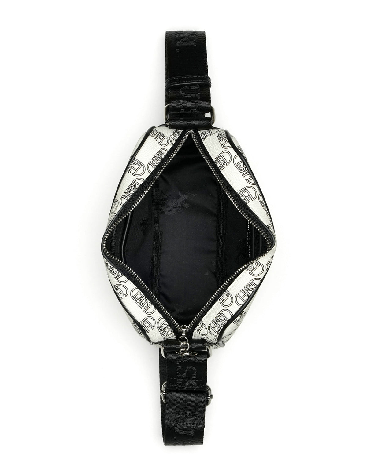 | Adjustable shoulder strap | Metallic logo accent at front | One main compartment with zipper closure | Brand printed pattern |