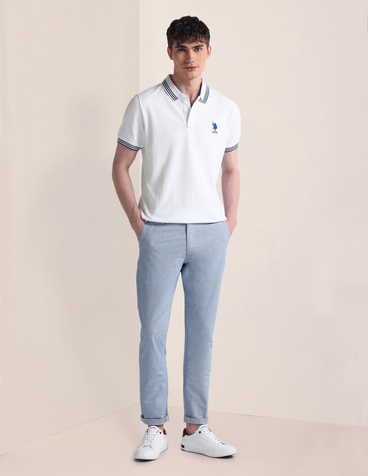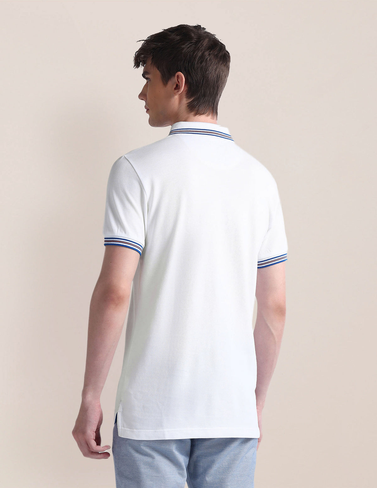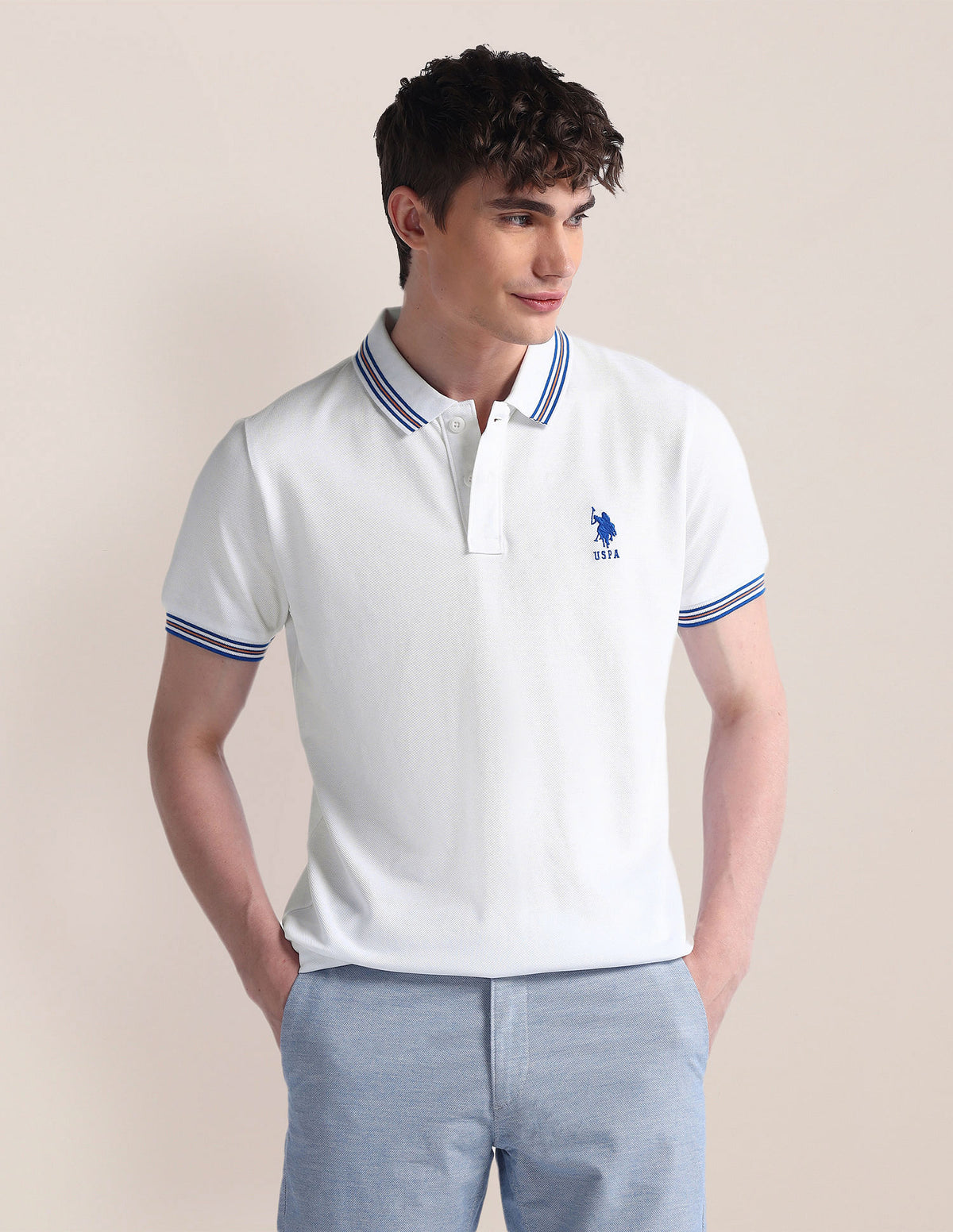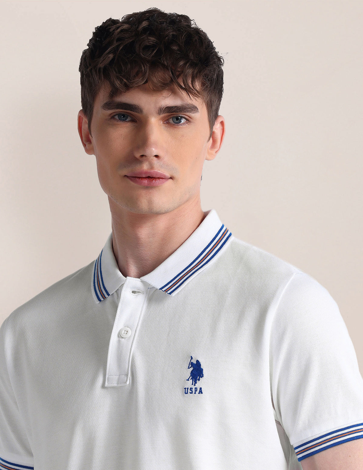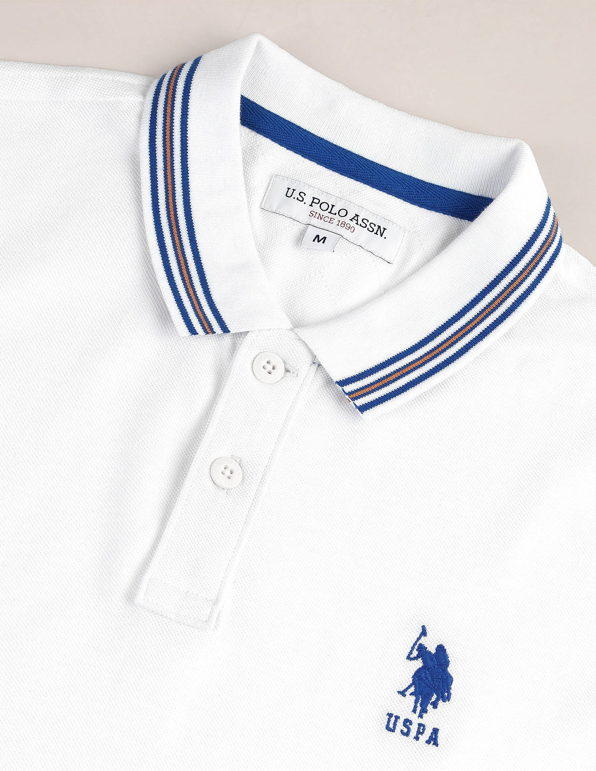 | Polo collar | Logo at chest | Short button placket | Short sleeves with ribbed hems | Uneven vented hem | Solid pattern | Knitted | Slim fit