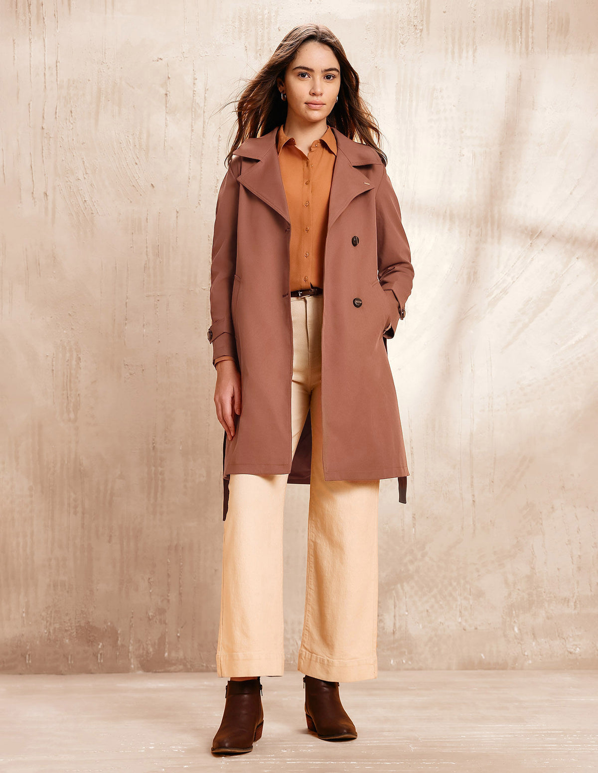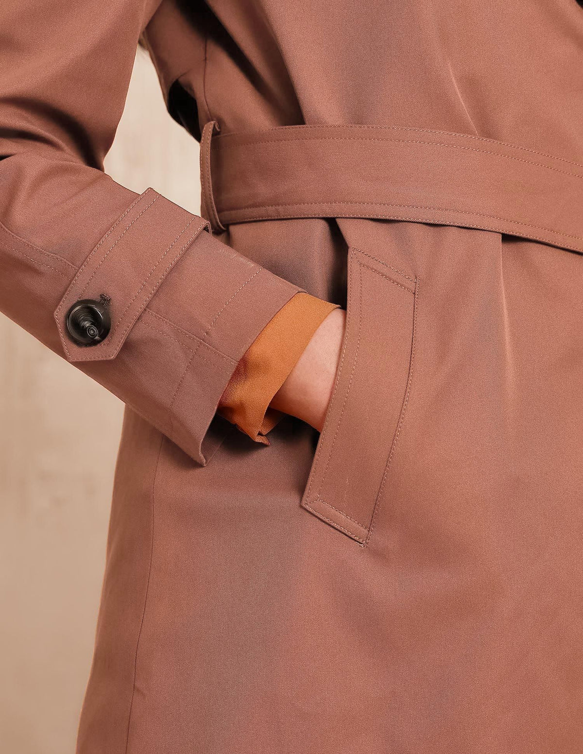 | Notch lapel collar | Single breasted | Long sleeves | Straight hem | Fabric belt at waist | Solid pattern | Regular fit |