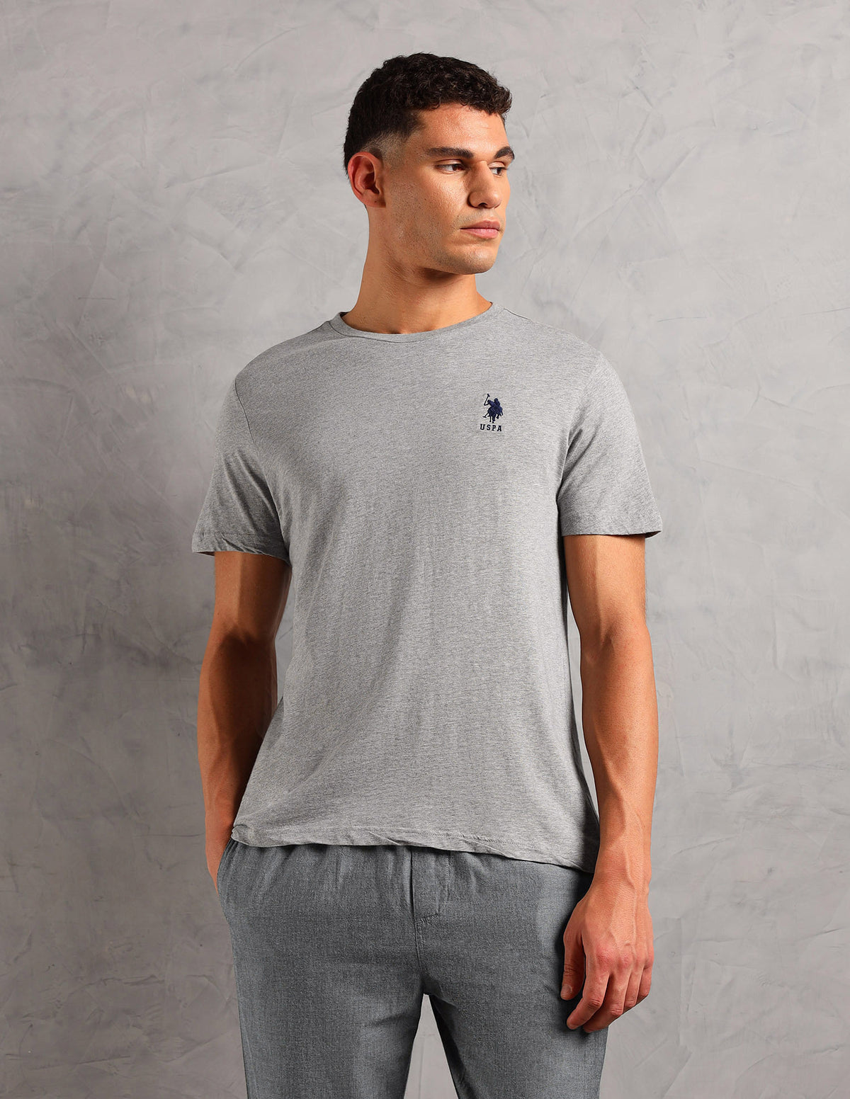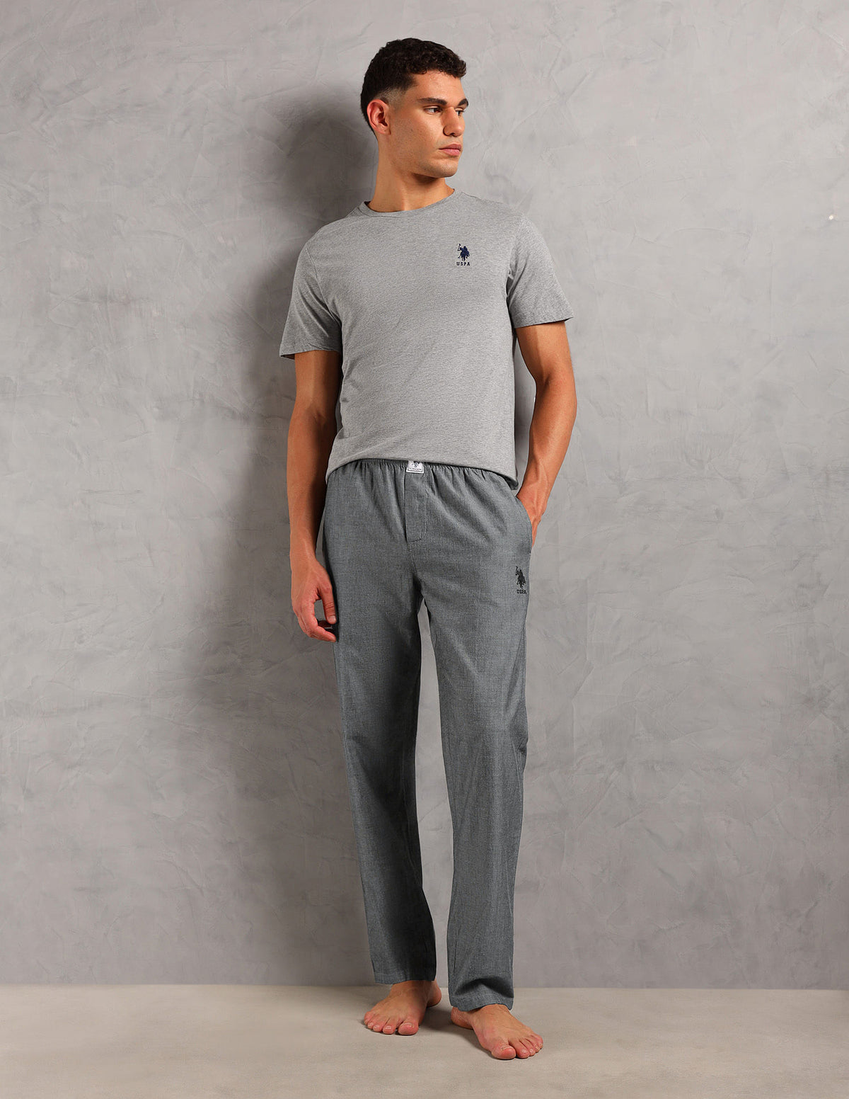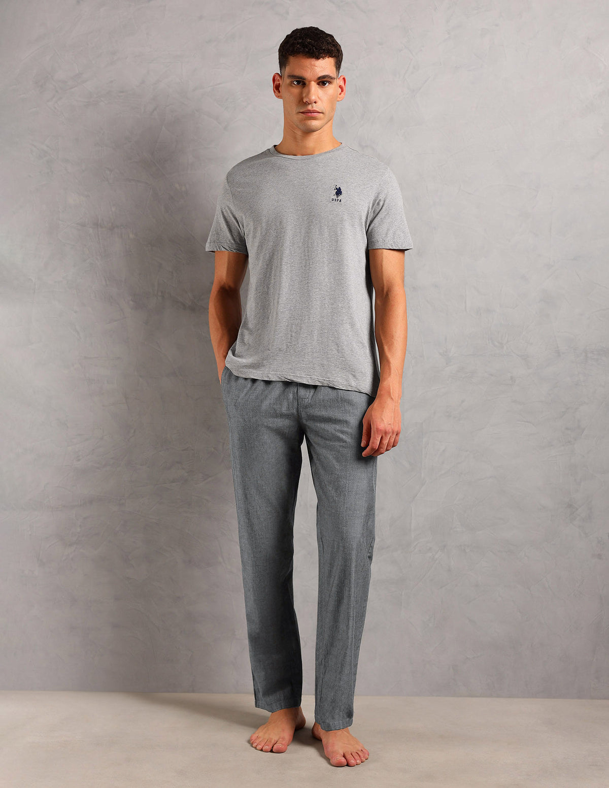 | T-Shirt | Ribbed crew neck | Embroidered logo at chest | Short sleeves | Straight hemline | Solid pattern | Knitted | Trousers | Mid-rise waist | Slip-on closure | Two pockets | Flat front | Solid pattern | Regular fit | Country Of Origin - India