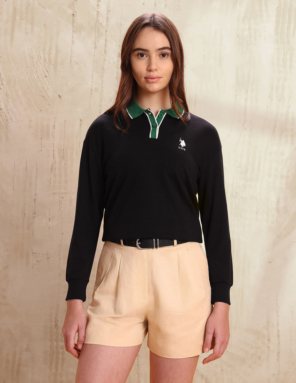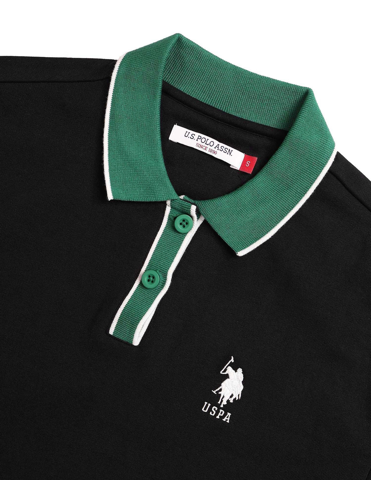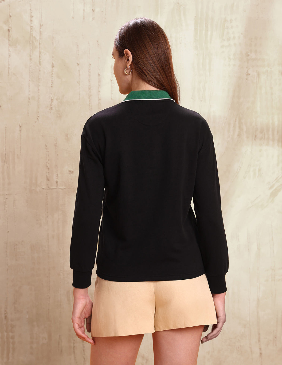 | Polo collar | Button closure | Long sleeves | Ribbed sleeve hems and hemline | Colourblocked pattern | Knitted | Regular fit |
