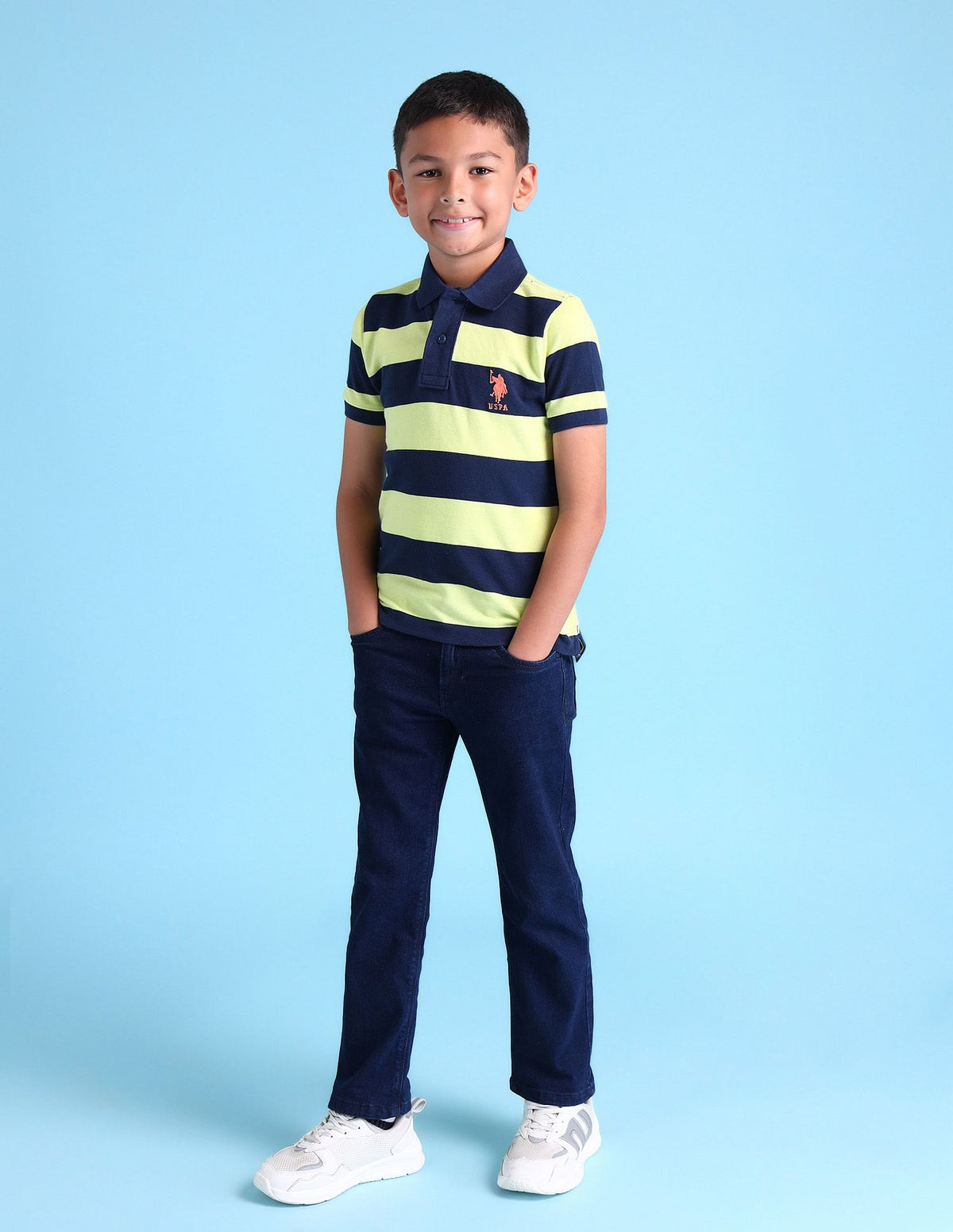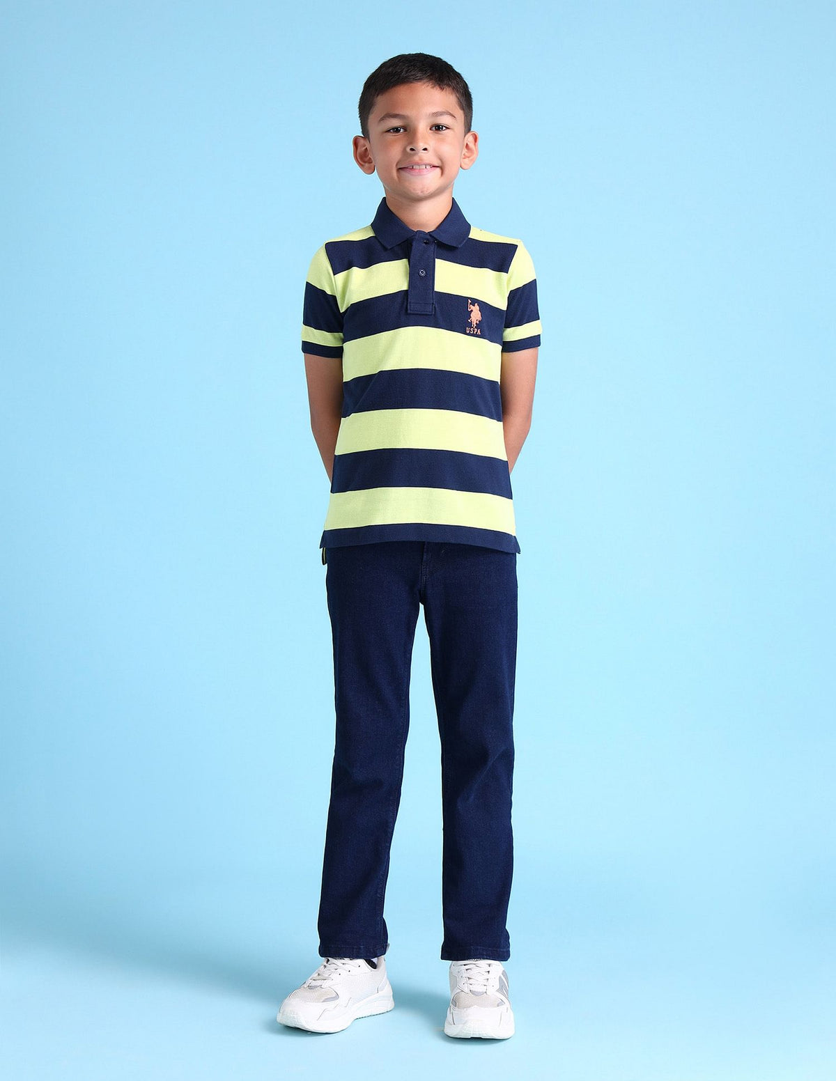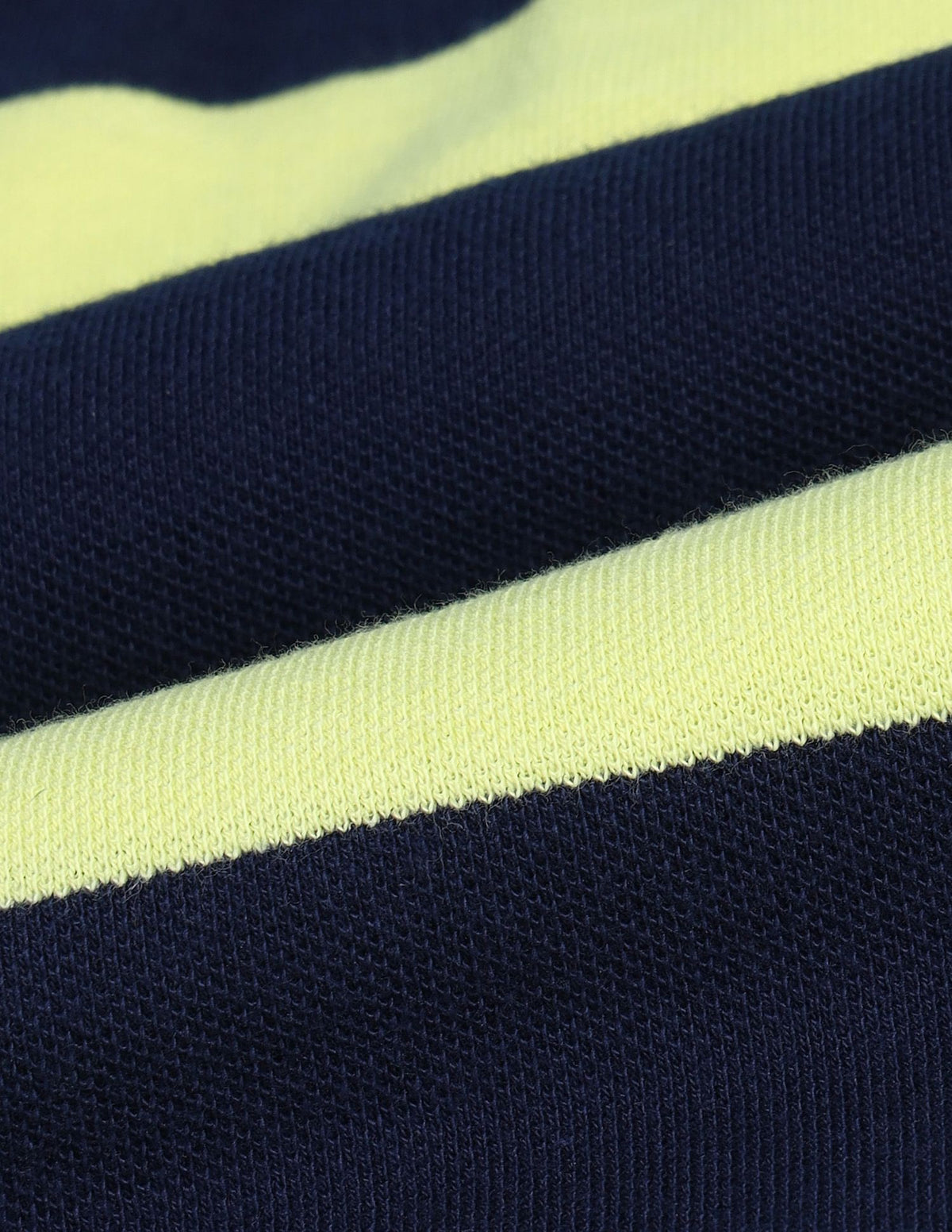 | Polo collar | Short button placket | Short sleeves | Ribbed collar and sleeve hems | Uneven vented hem | Horizontal stripes pattern | Regular fit |