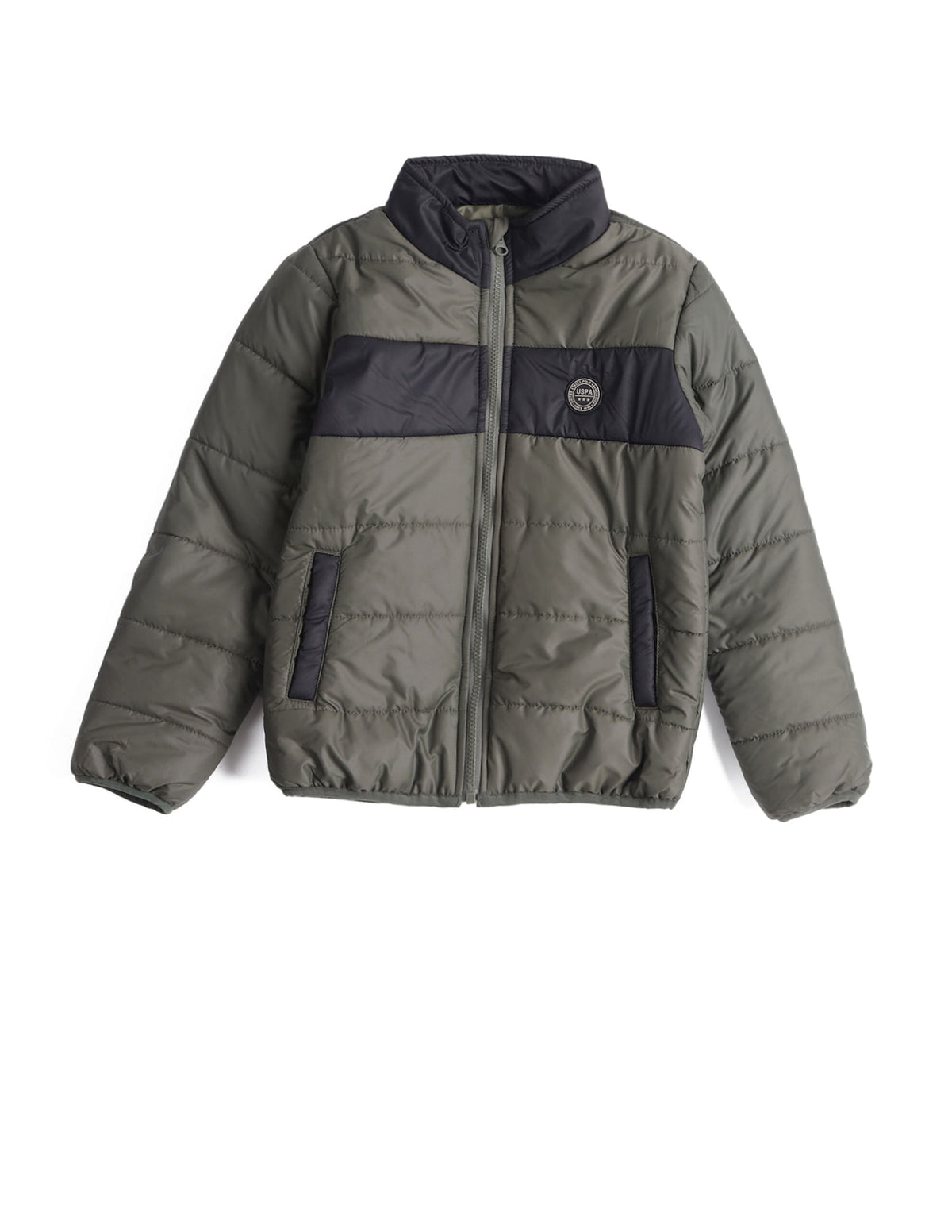 | Stand collar neck | Full zipper closure | Long sleeves | Logo at chest | Regular sleeve hems and hemline | 2 pockets | Solid pattern |