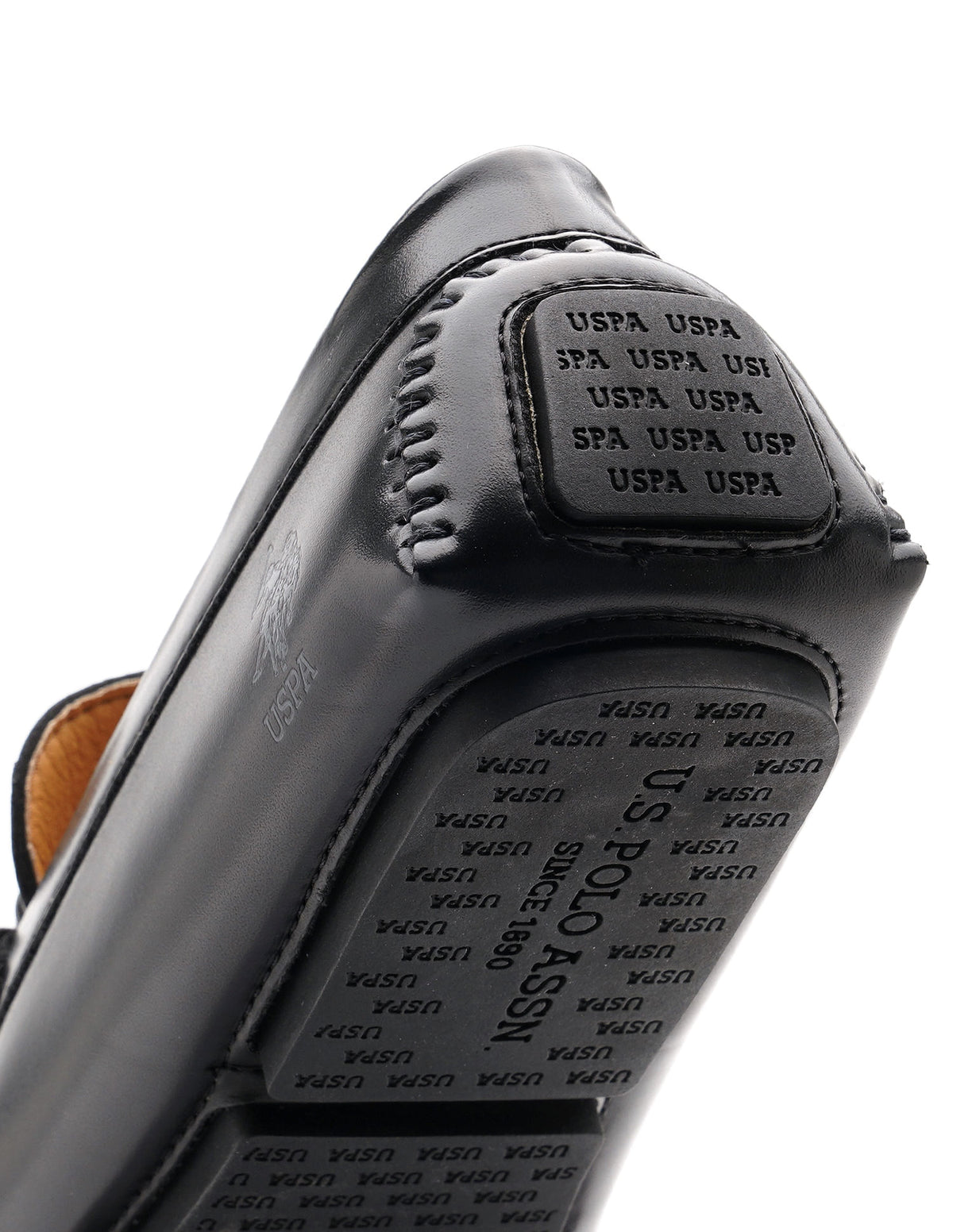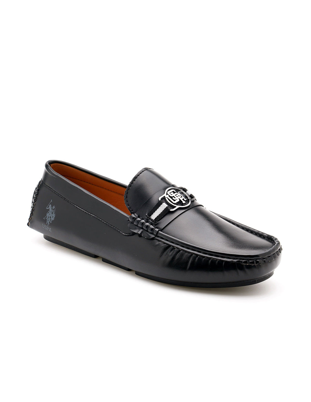 | Round toe | Metallic accent at front | Reinforced heel counter | Cushioned footbed | Textured outsole | Solid pattern |