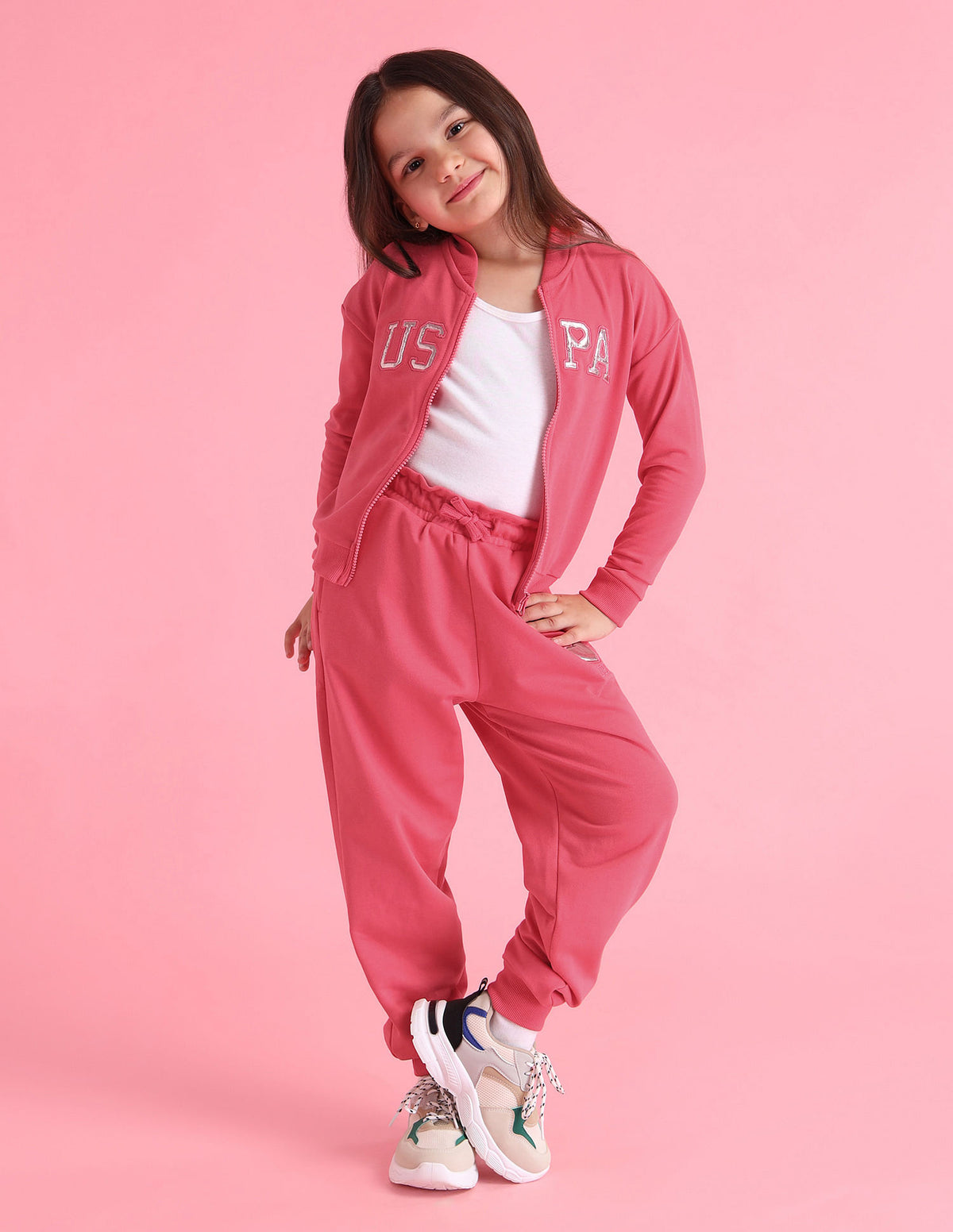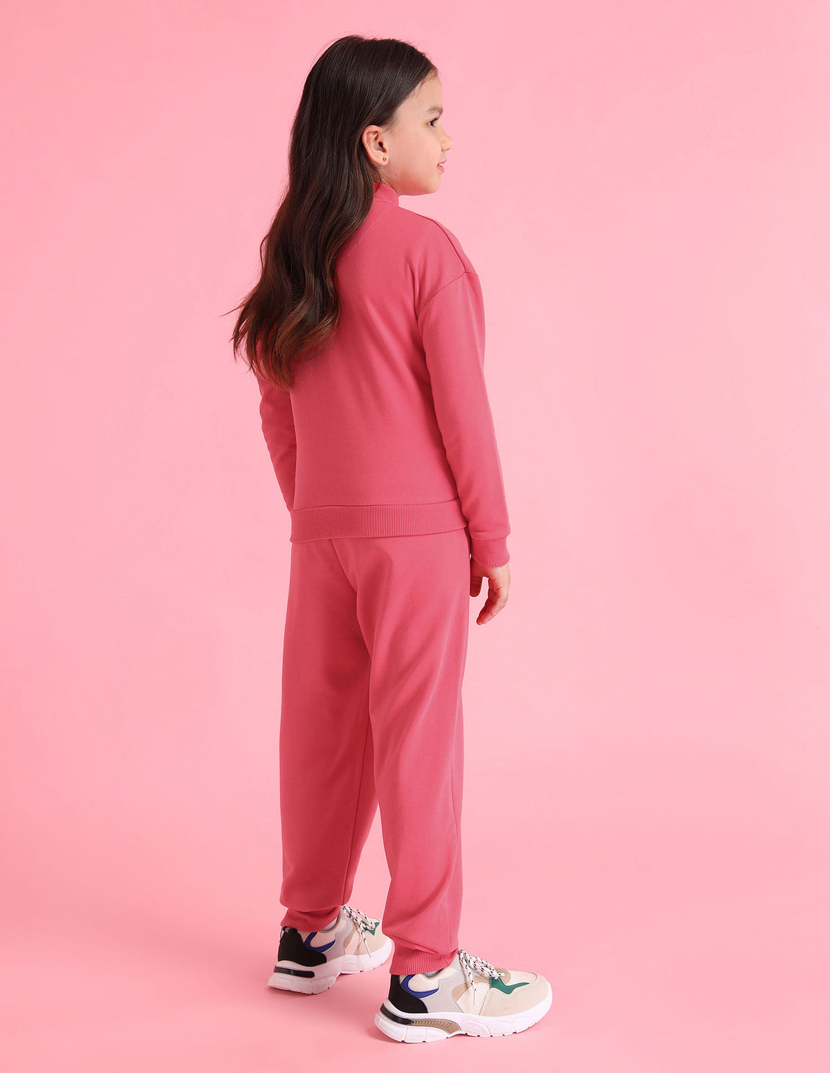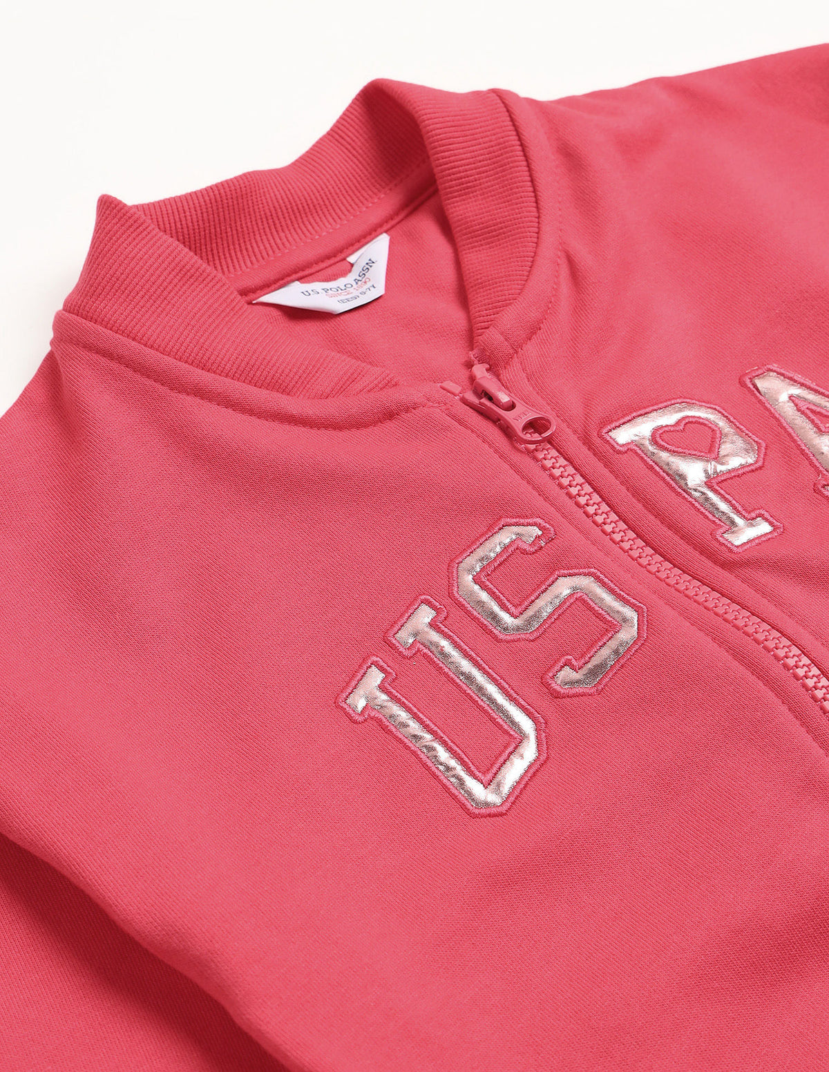 Story: Get your girl ready for any casual outing with this stylish baseball neck sweatshirt. Featuring a trendy logo pattern, it's the perfect blend of comfort and cool for everyday wear.