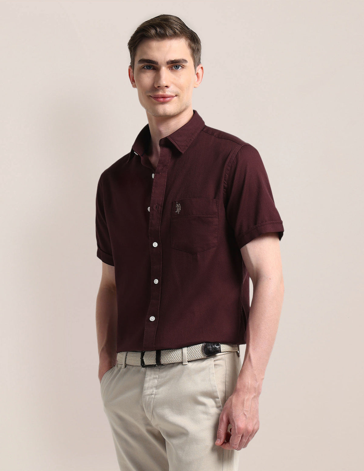 | Cutaway collar | Chest patch pocket | Full button placket | Short sleeves | Curved hemline | Geometric patterned dobby weave | Brand fit: Tailored fit | Fit mapping: Regular fit