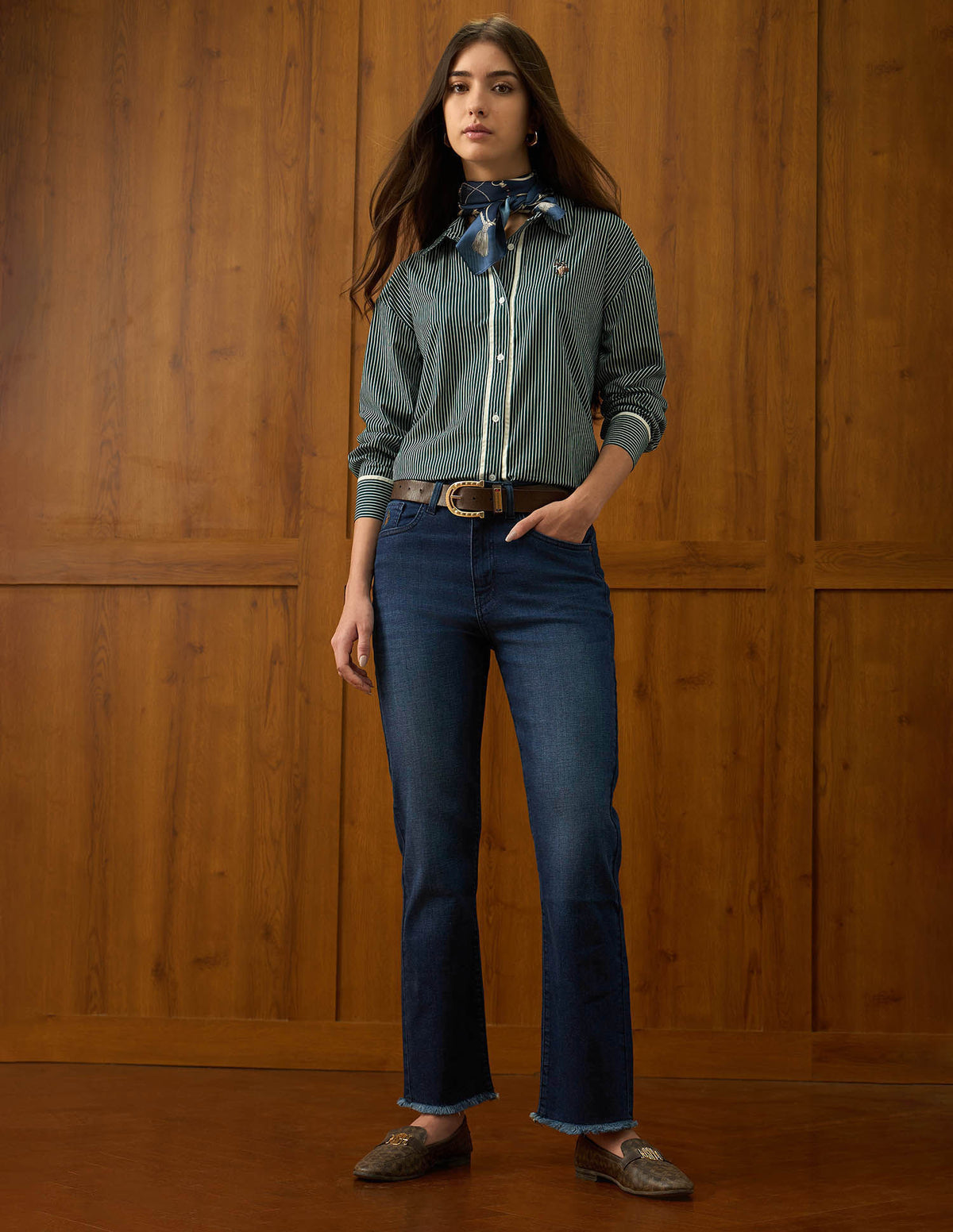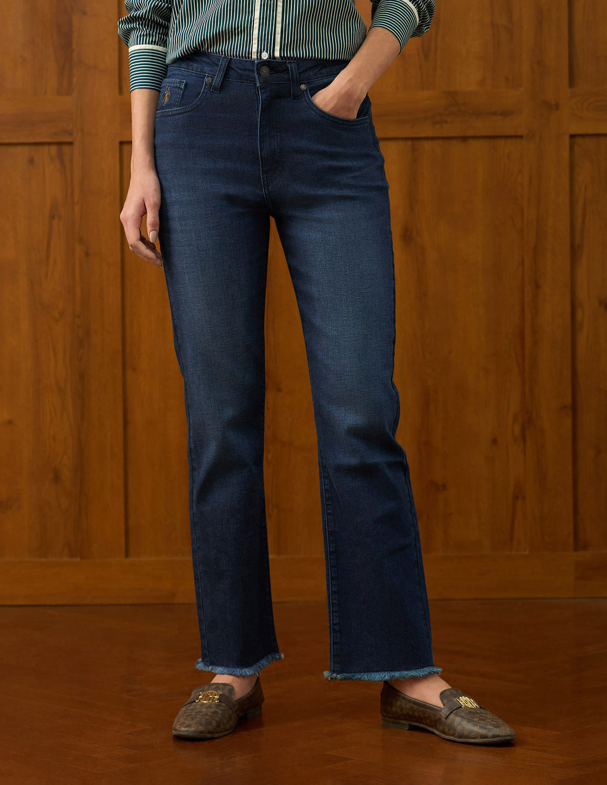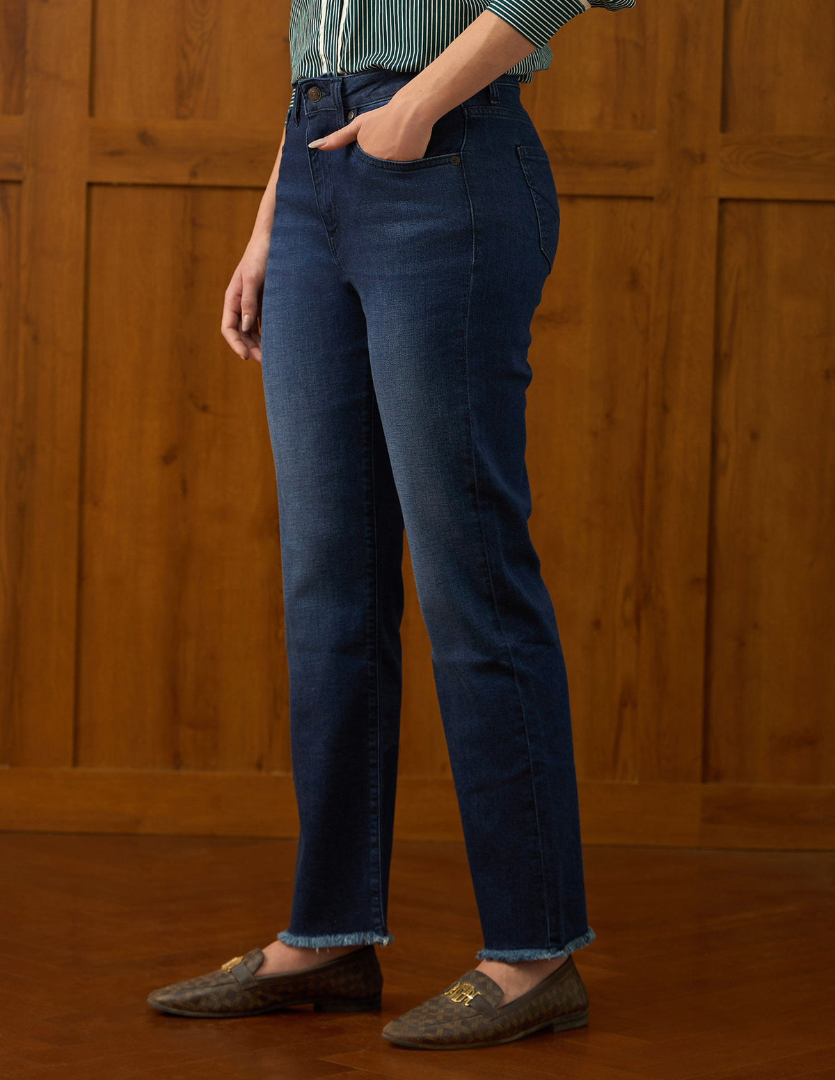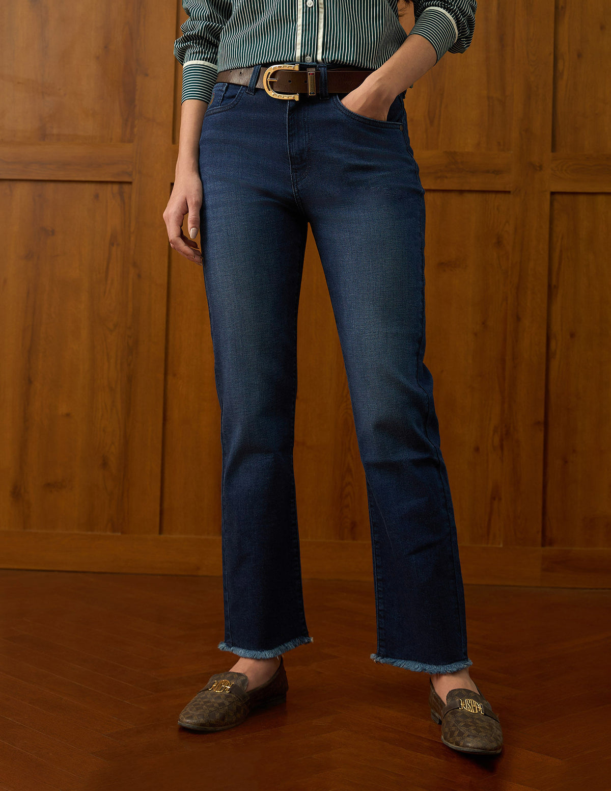 | High-rise waist | Button and zip fly closure | Five pockets | Stonewash | Denim weave | Straight fit |