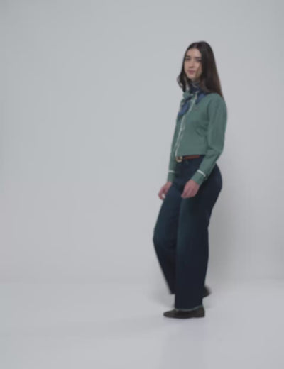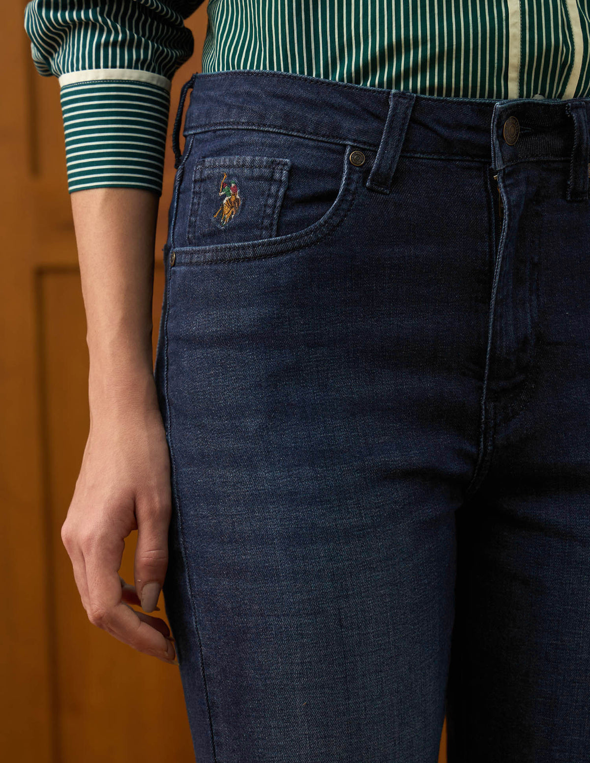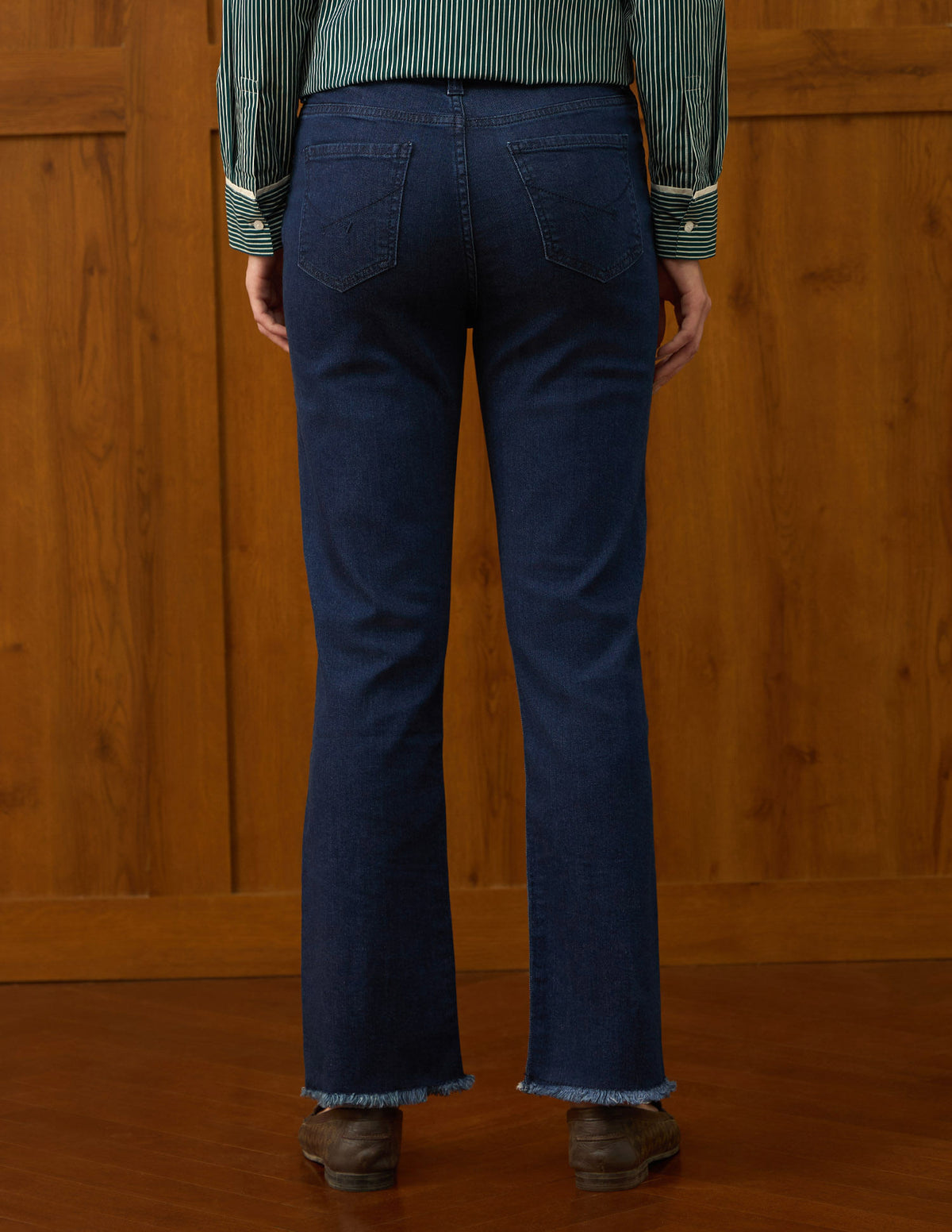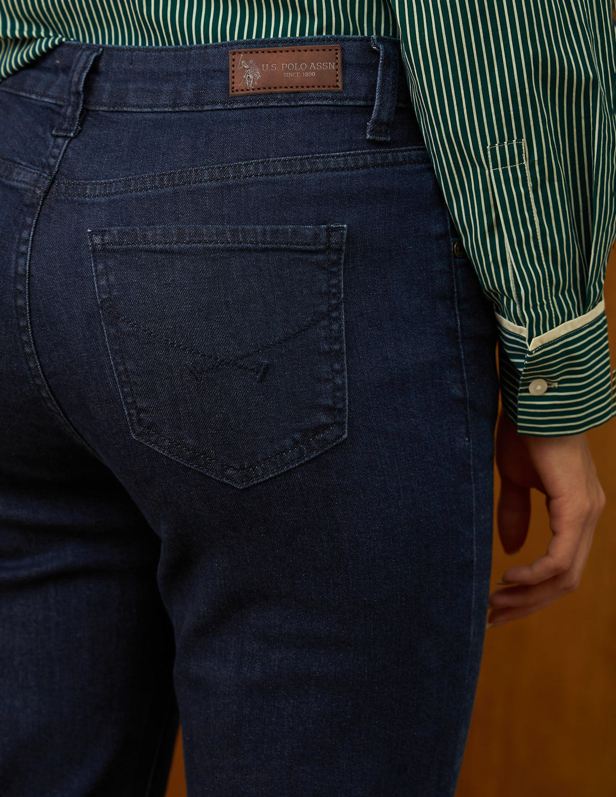| High-rise waist | Button and zip fly closure | Five pockets | Stonewash | Denim weave | Straight fit |