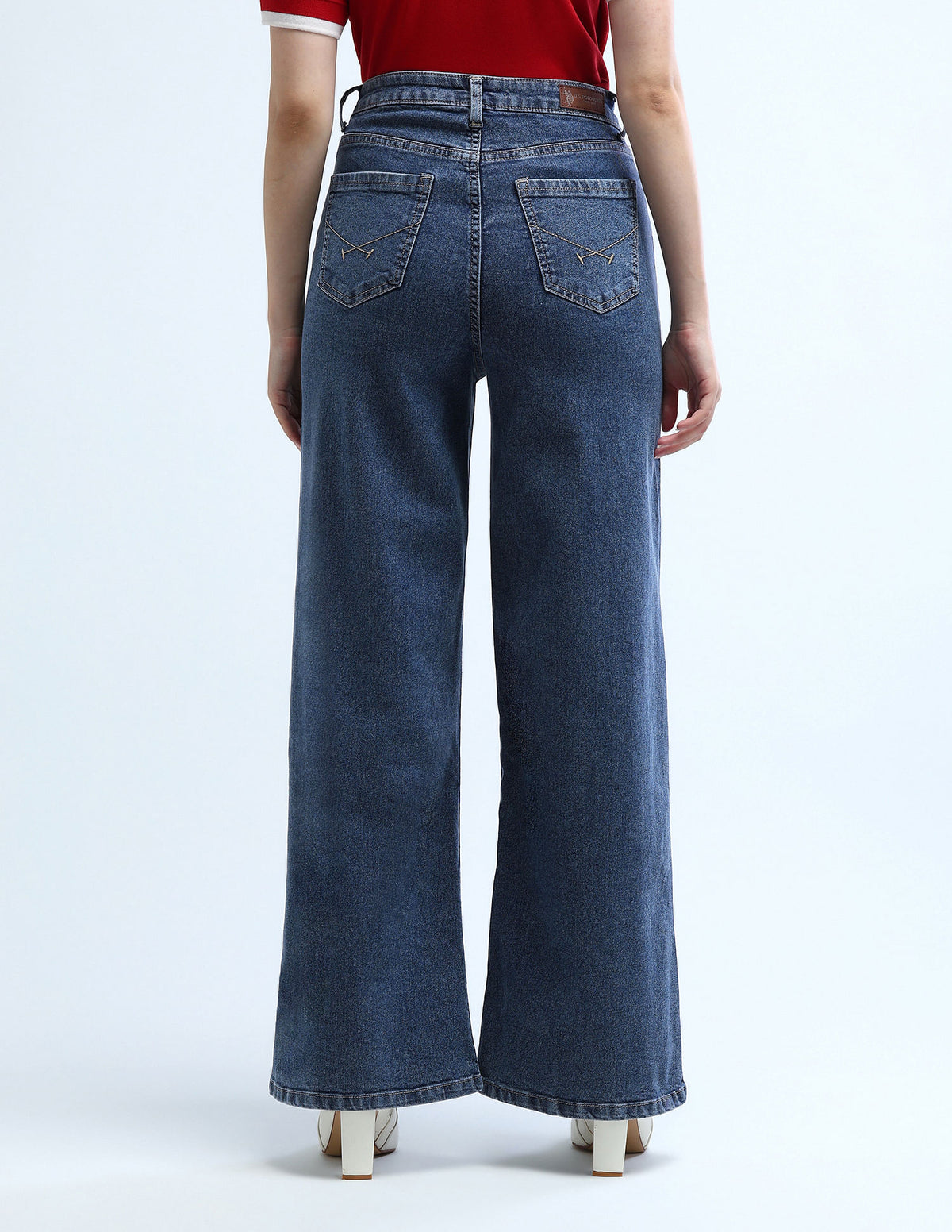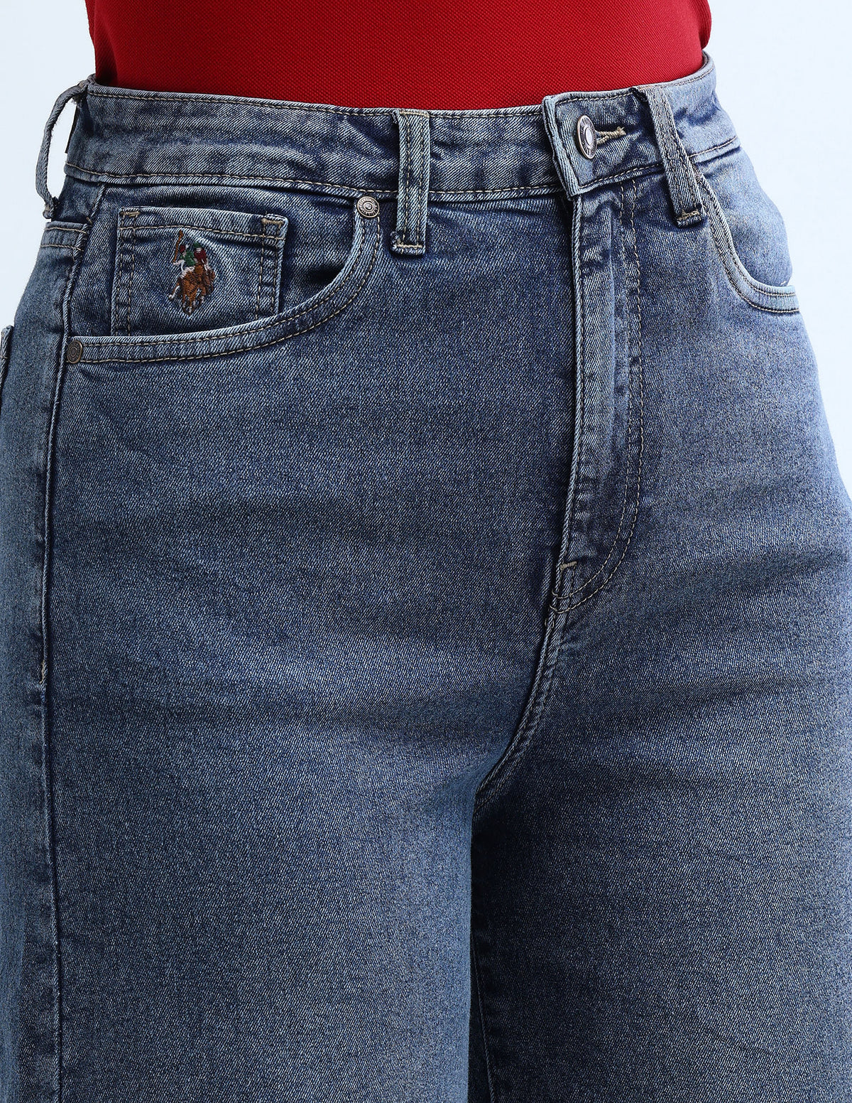 | High-rise waist | Button and zip fly closure | Five pockets | Stonewashed and whiskered | Floor length | Denim weave | Baggy fit