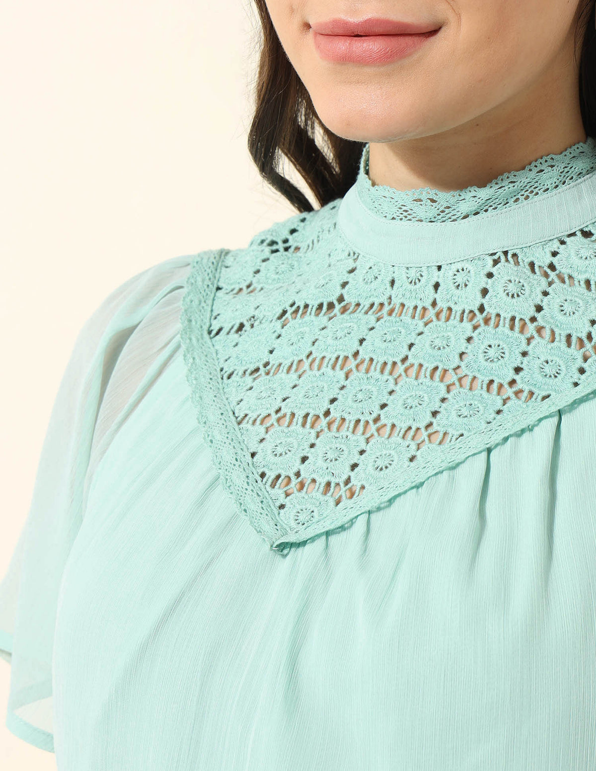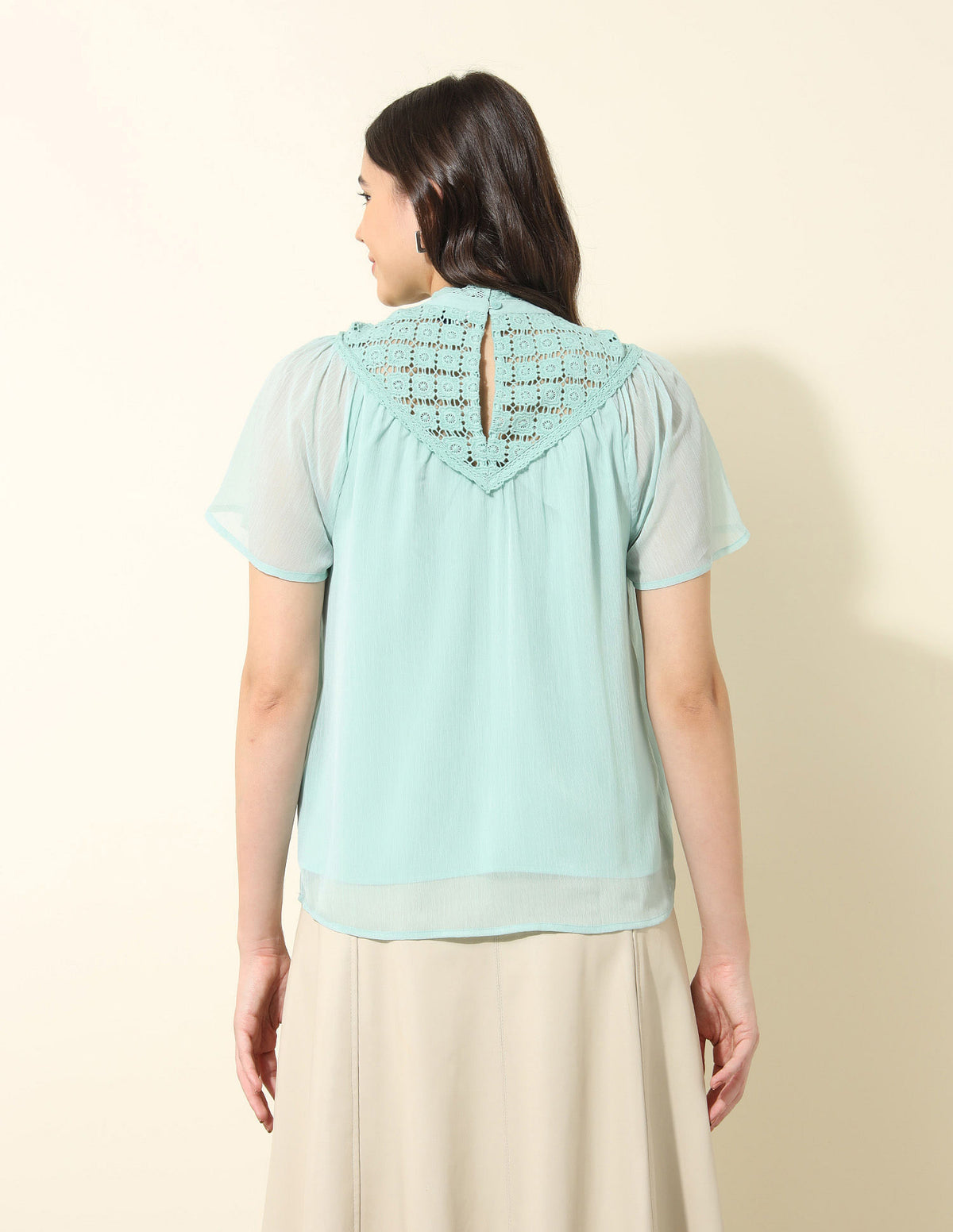 | Round neck | Lace detailed yoke at chest | Gathered near yoke | Button and loop closure at back | Long sleeves with buttoned closure | Straight hemline | Solid pattern | Regular weave | Regular fit |