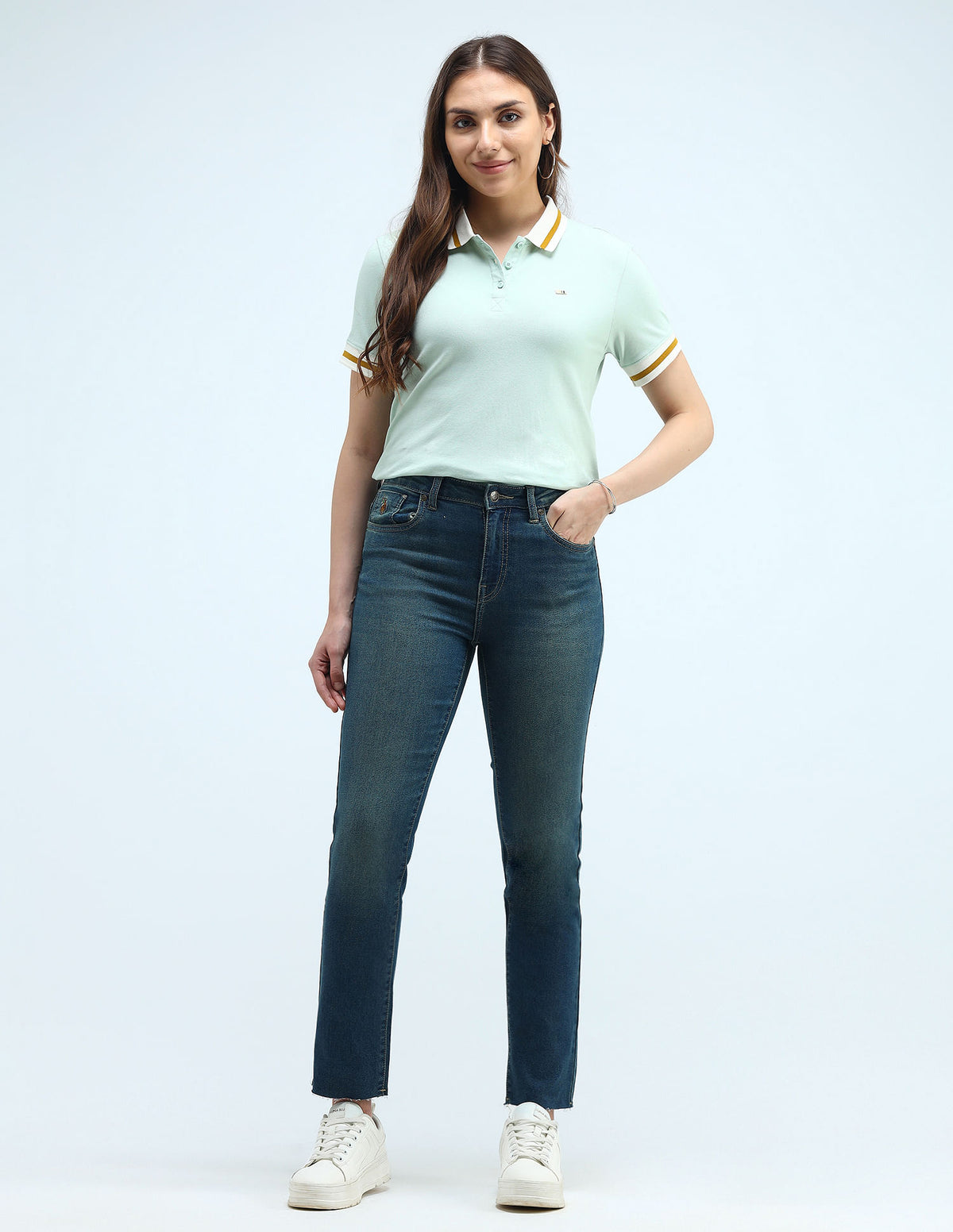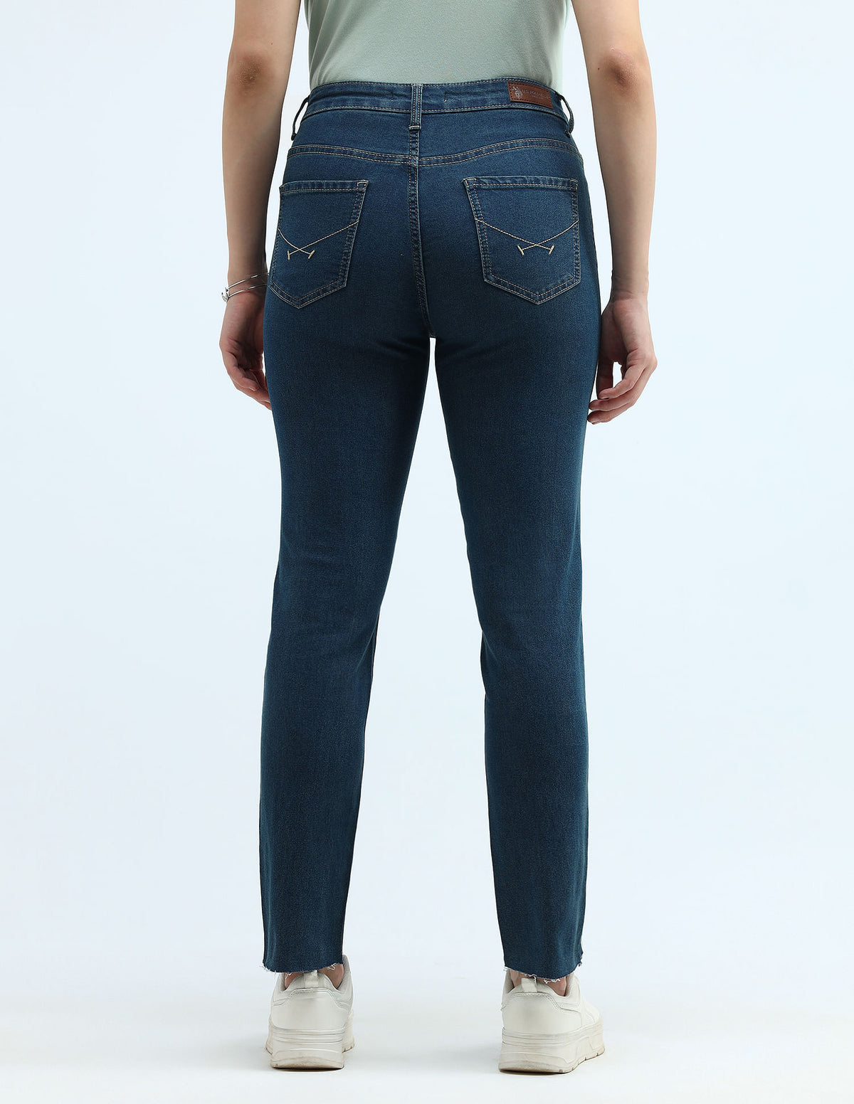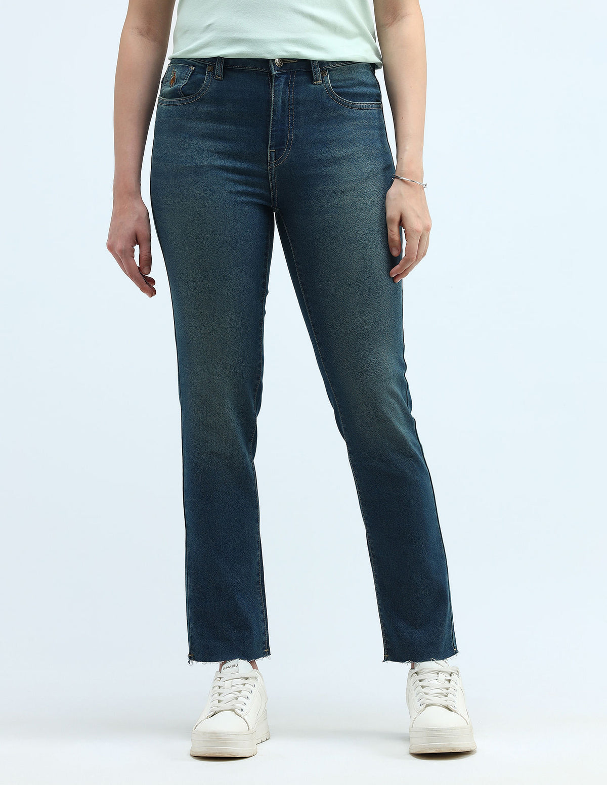 | Mid-rise waist | Button and zip fly closure | Five pockets | Tinted | Unfinished hems | Denim weave | Slim fit
