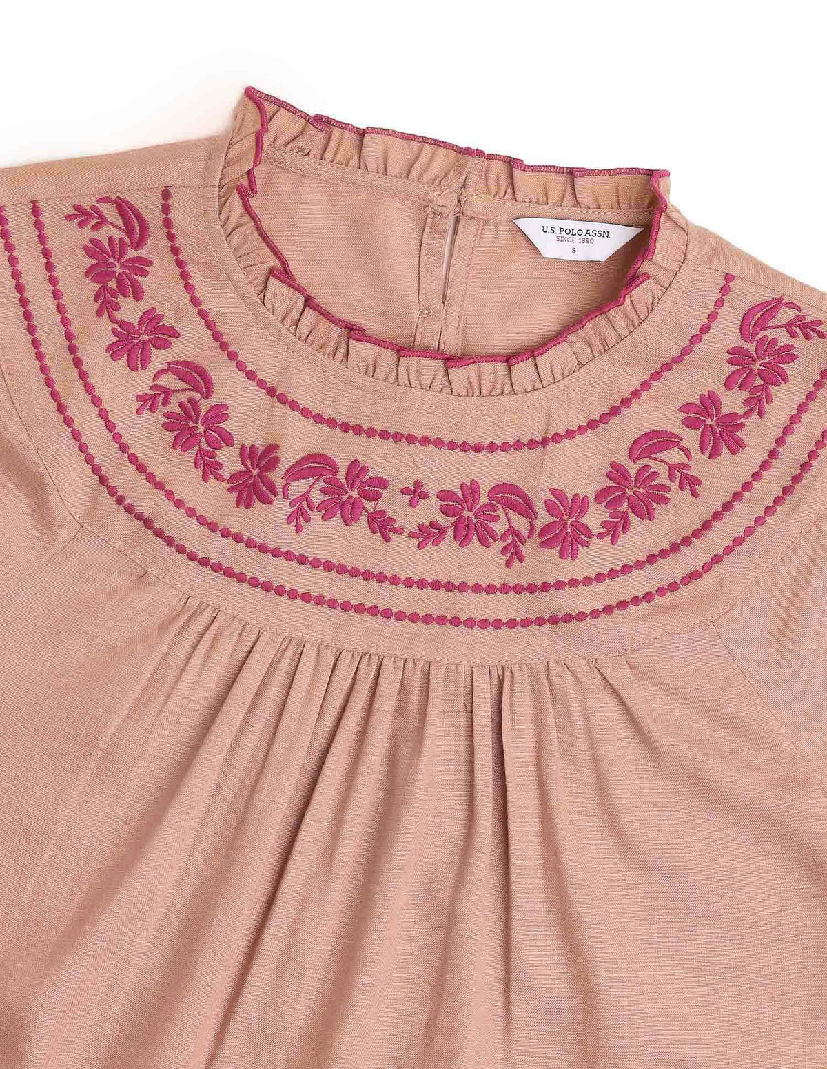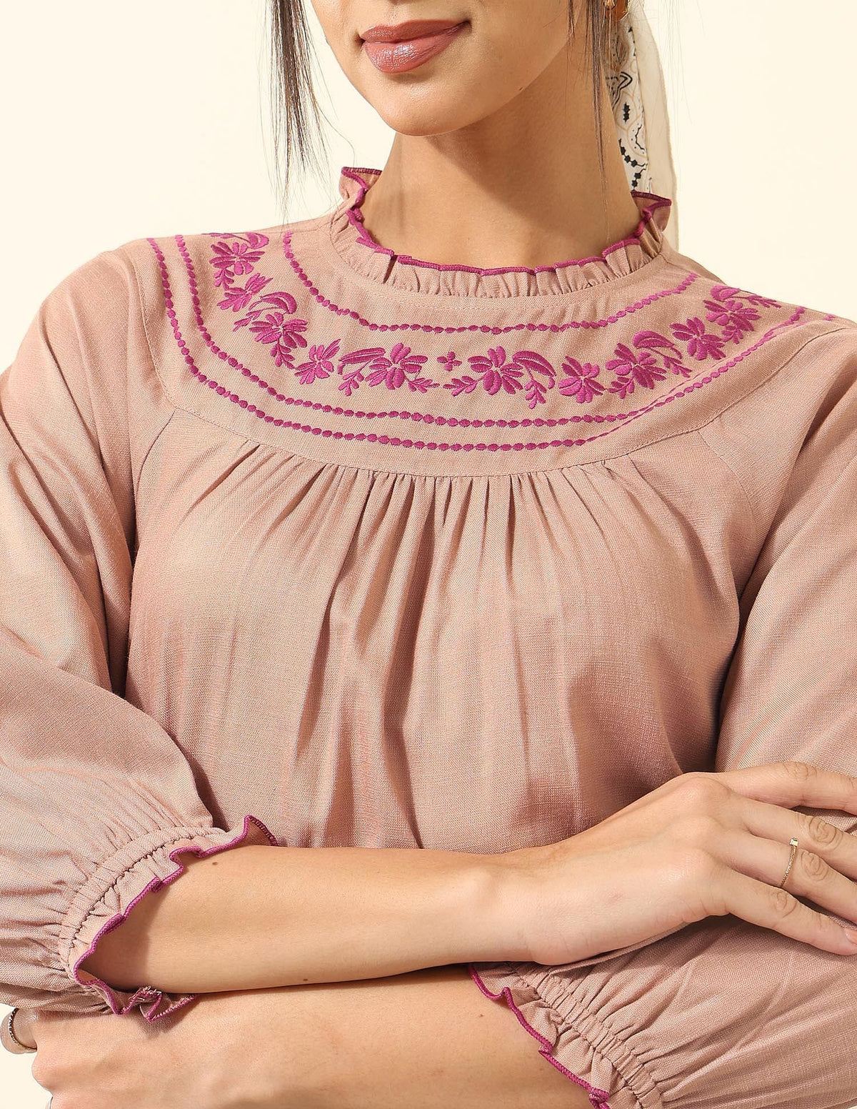 | Round neck | Frill detailed at yoke | Gathered near yoke | Button and loop closure at back | Three-quarter sleeves with elasticized hems | Straight hemline | Solid pattern | Regular weave | fit |