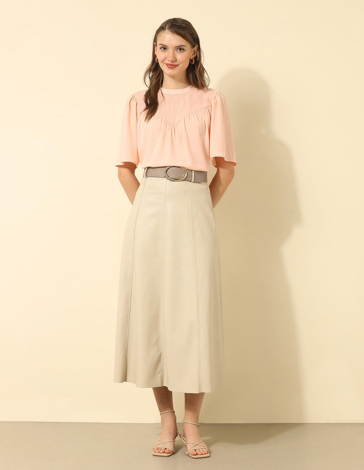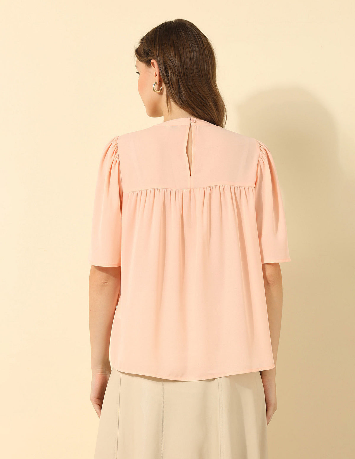 | Round neck | Gathered near yoke | Button and loop closure at back | Short sleeves | Curved hemline | Floral embroidered pattern | Regular weave | Regular fit |