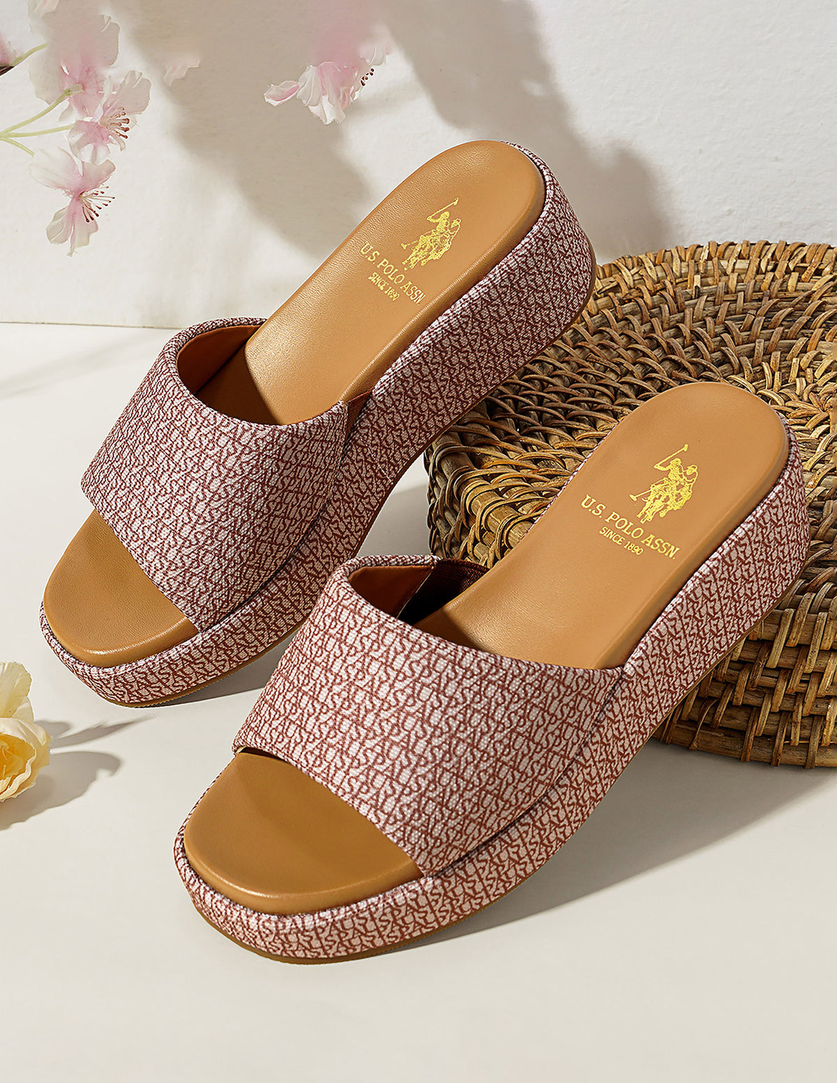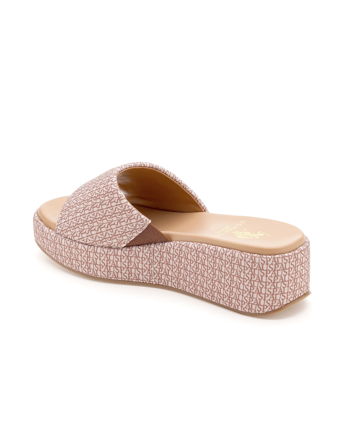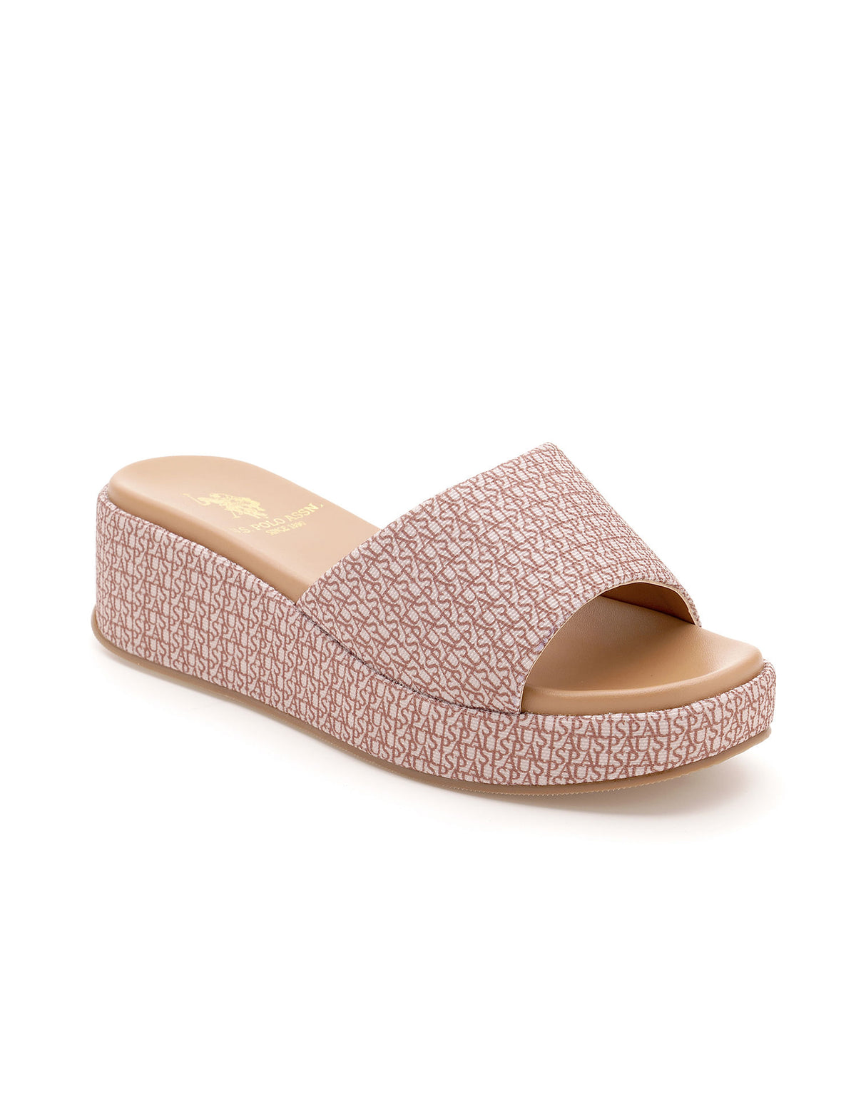 | Open toe | Vamp strap with elasticized detail | Cushion footbed with branding | Textured outsole | Monogram printed pattern