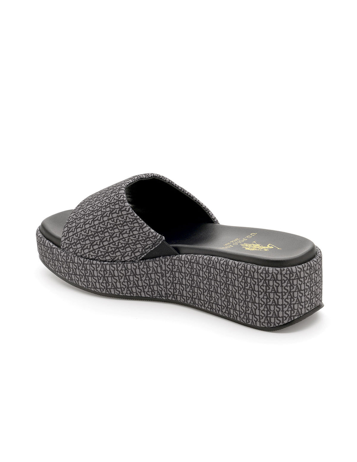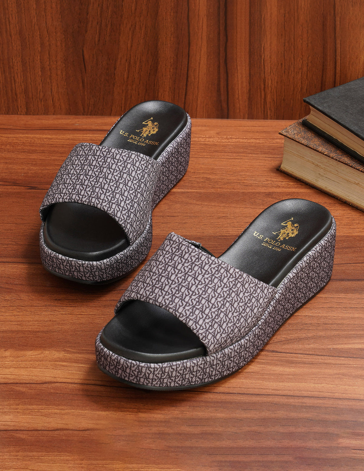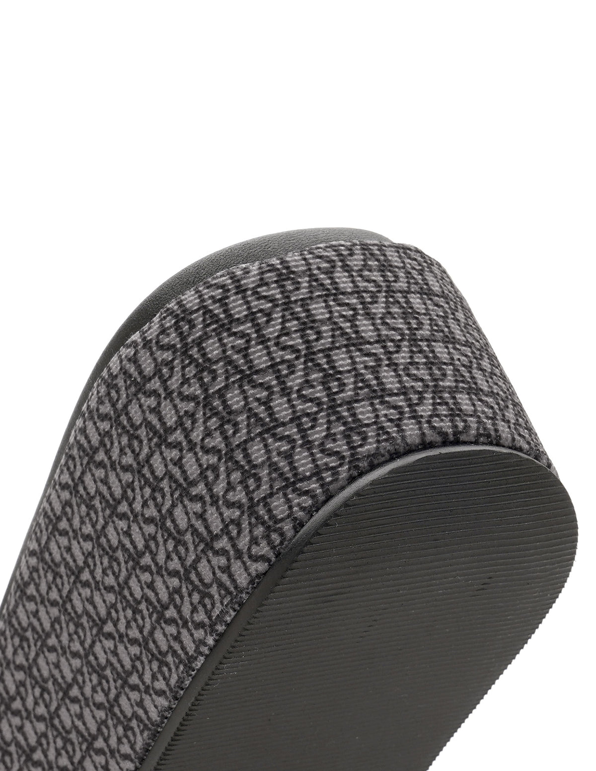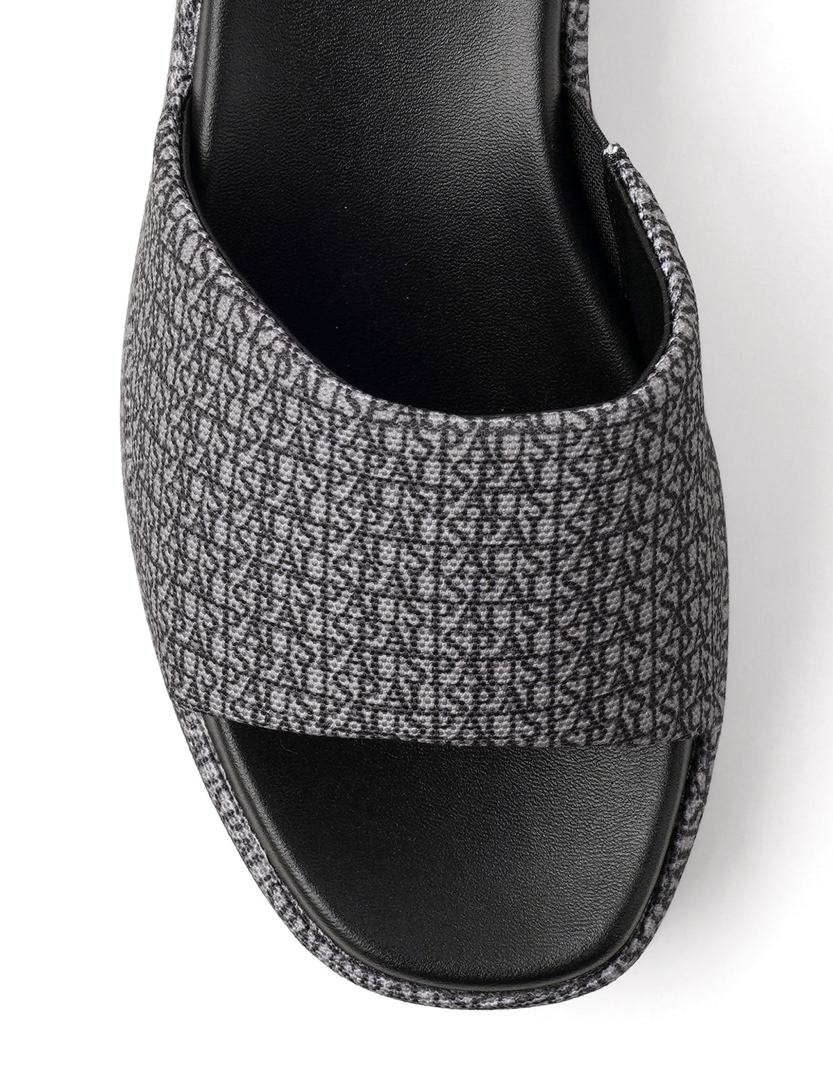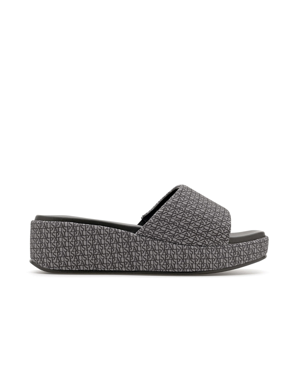 | Open toe | Vamp strap with elasticized detail | Cushion footbed with branding | Textured outsole | Monogram printed pattern