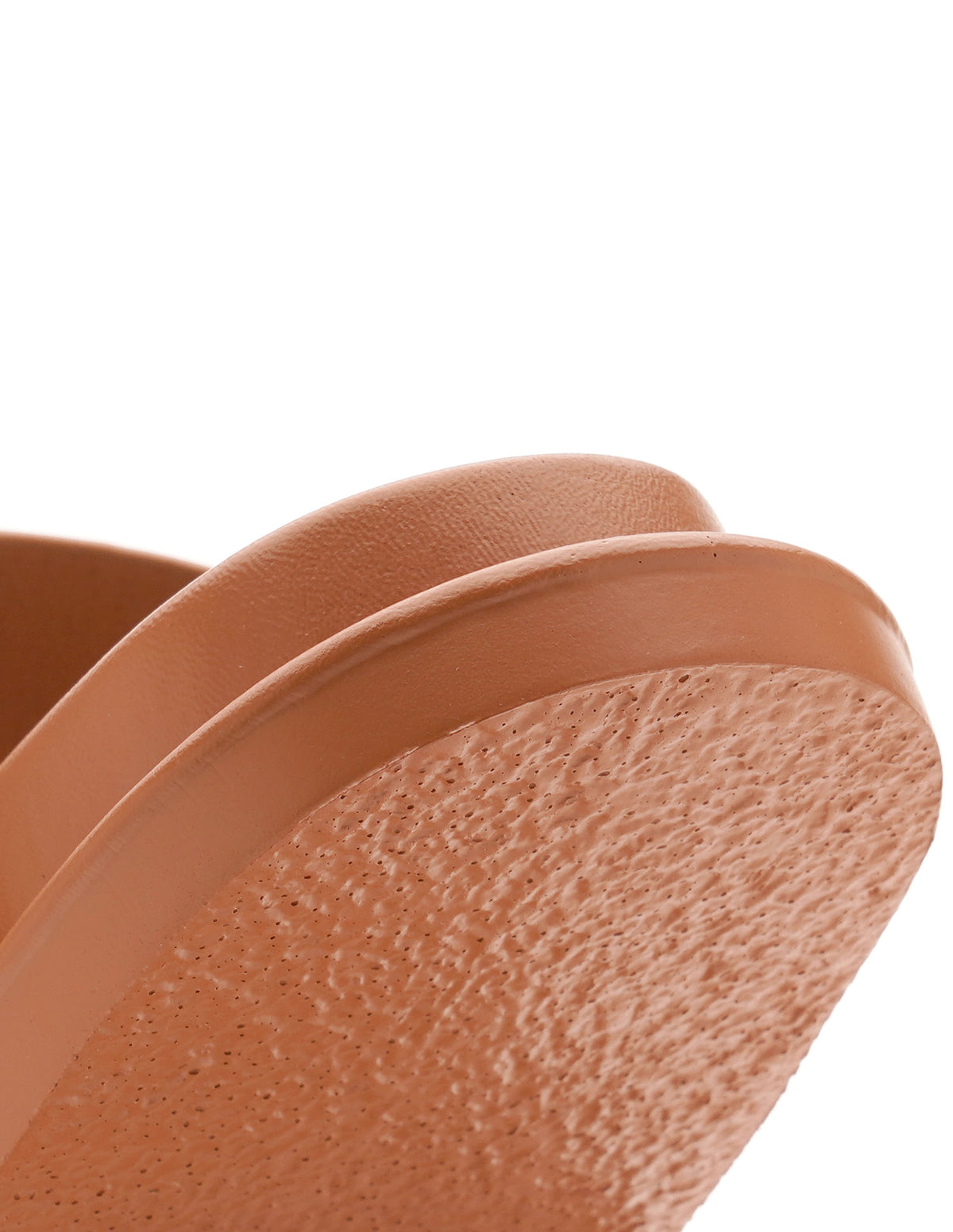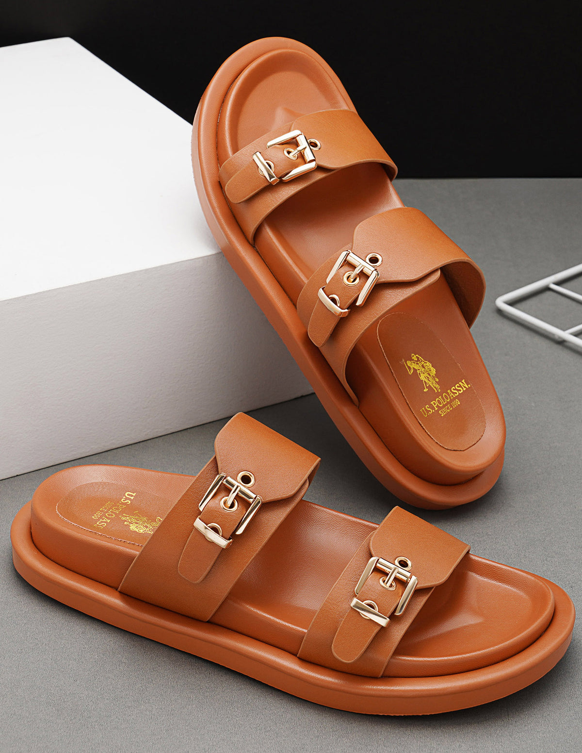 | Open toe | Top adjustable buckle strap | Cushioned footbed with branding | Textured outsole | Solid pattern