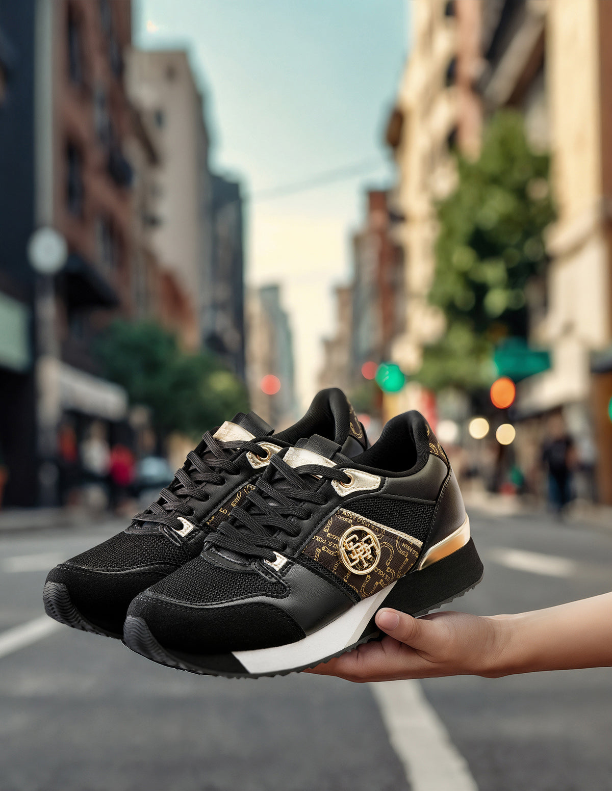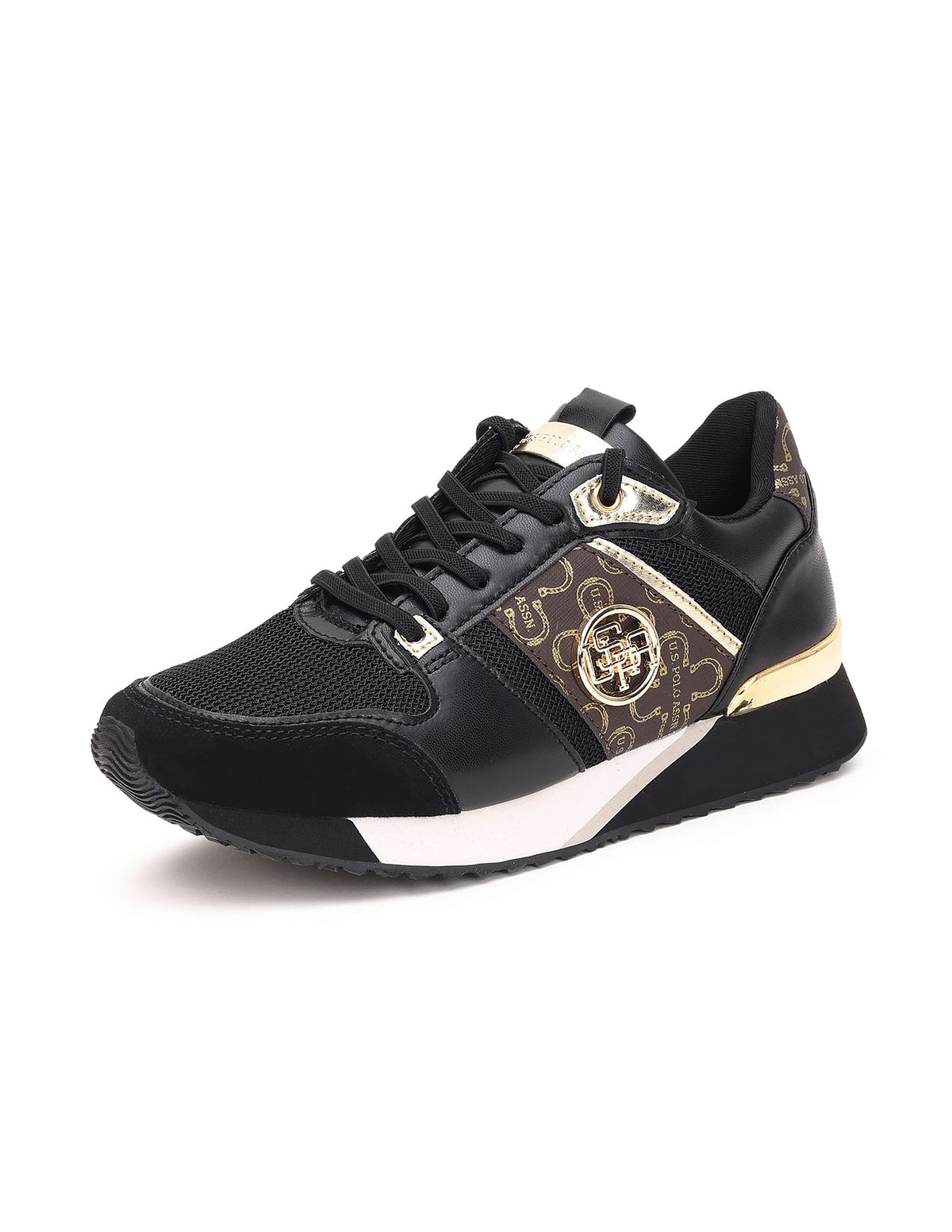 - Panelled upper with brand print and metallic logo