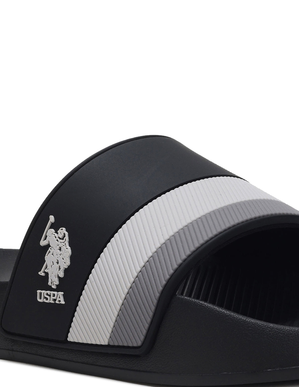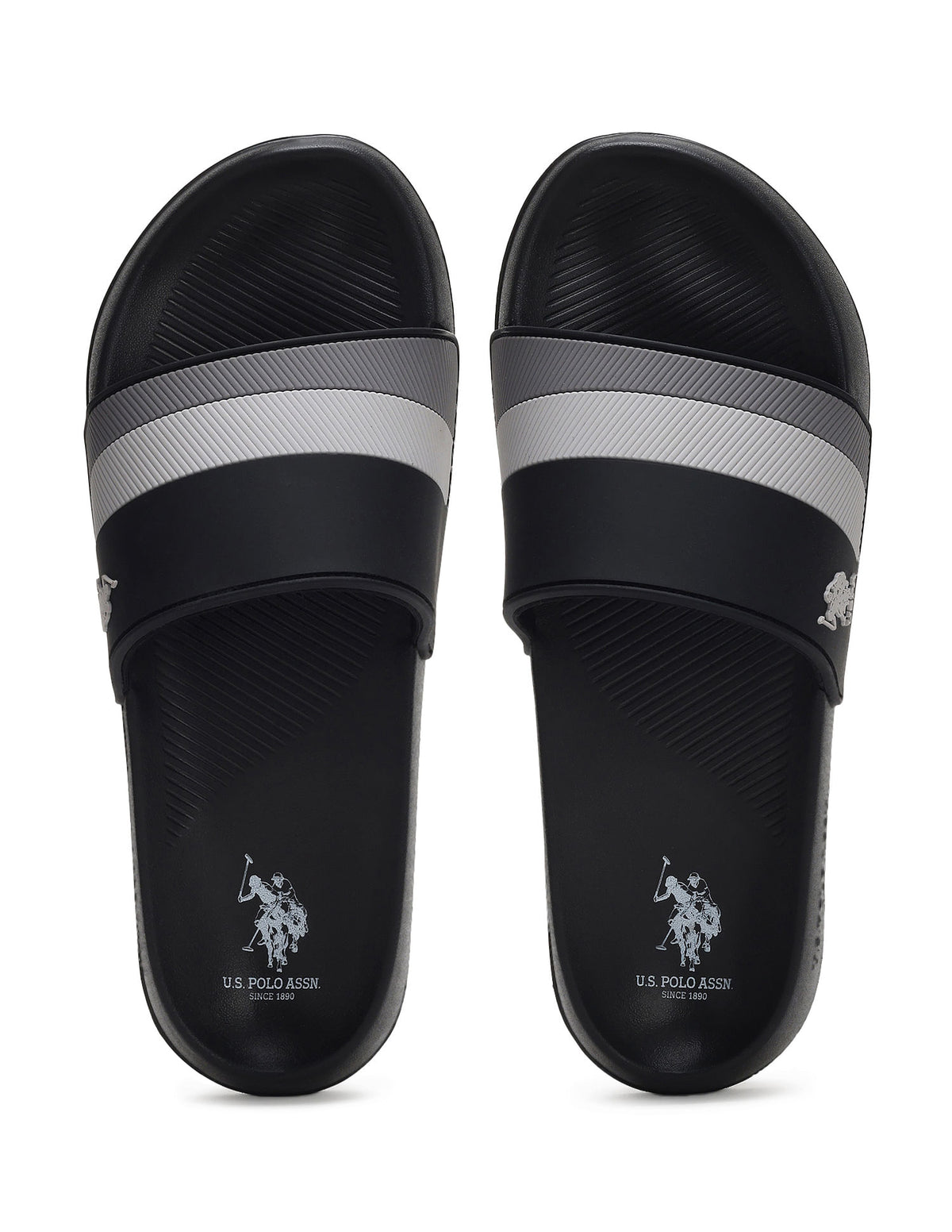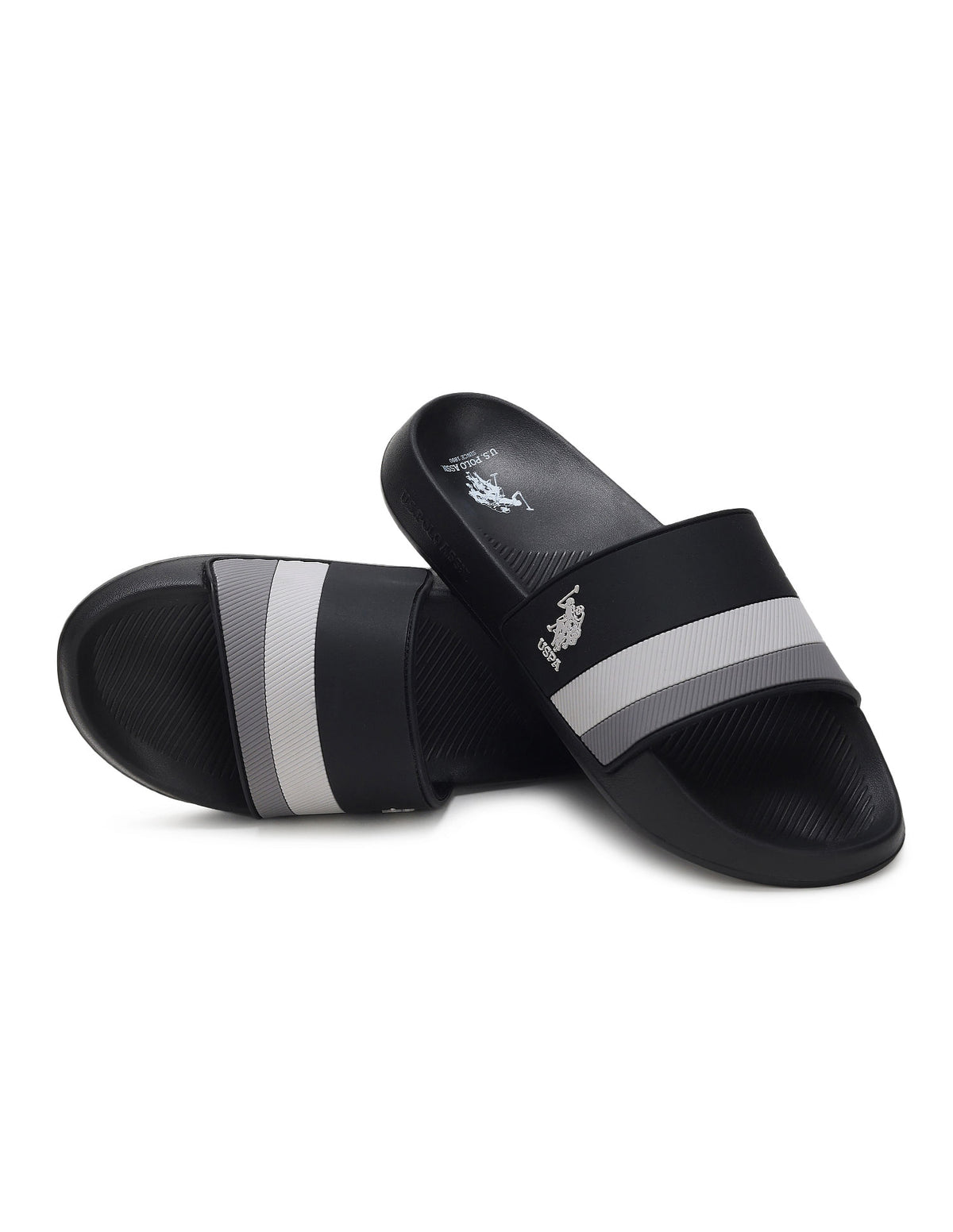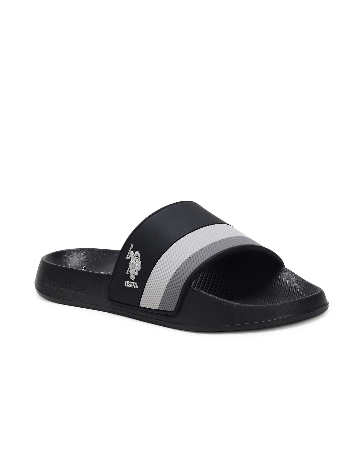 | Open toe | Striped pattern on vamp strap | Cushioned footbed | Textured outsole | Country Of Origin - India