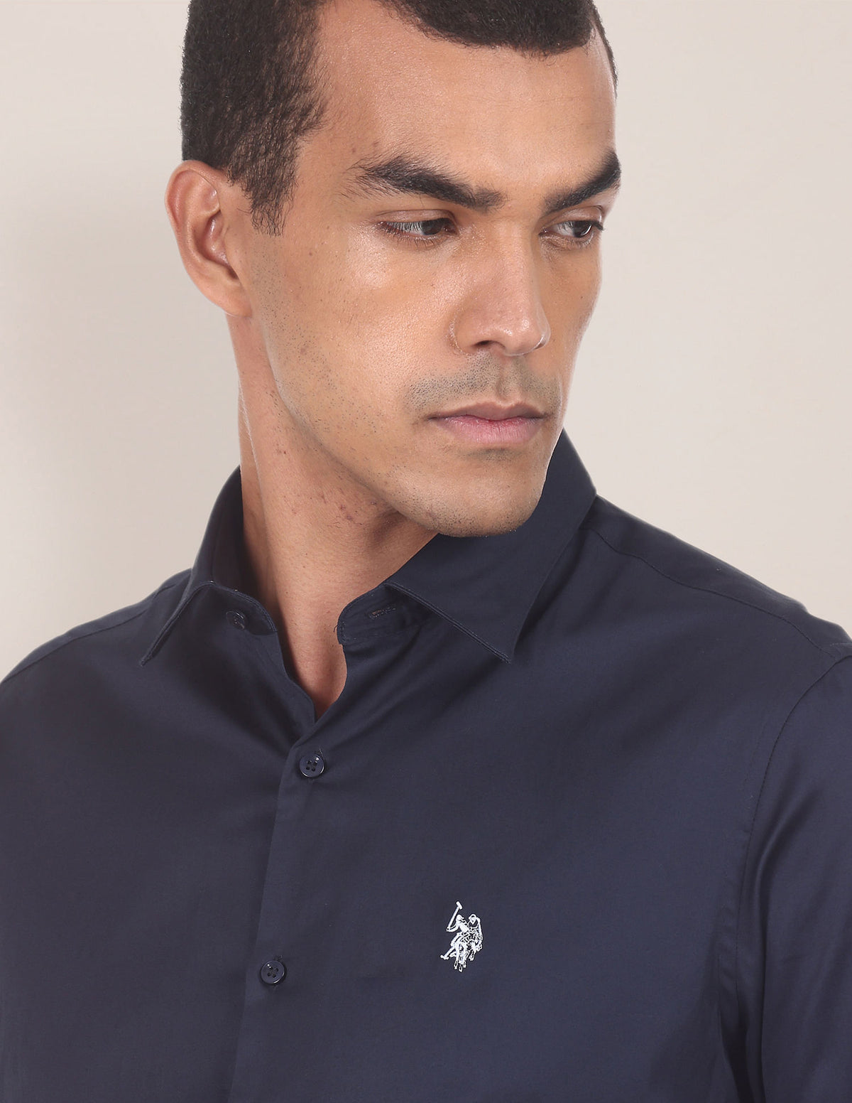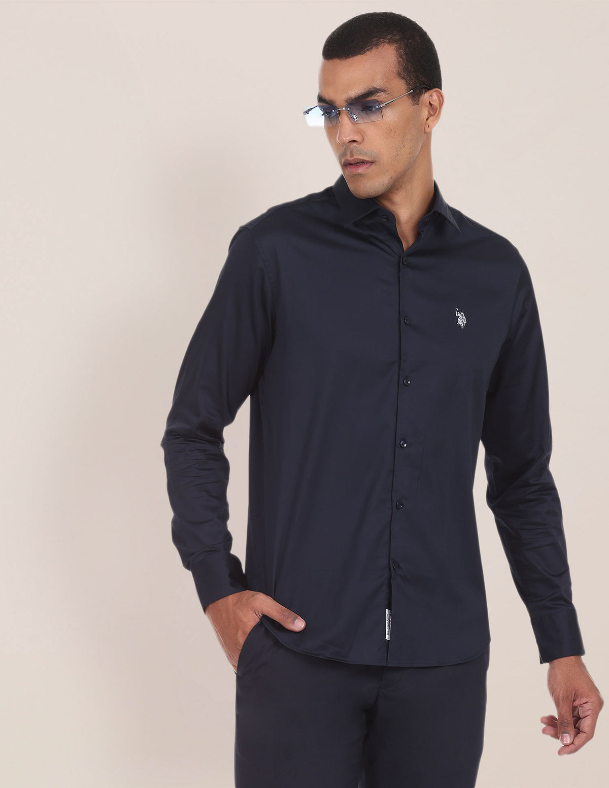 | Spread collar | Logo at chest | French button placket | Long sleeves with barrel cuffs | Curved hemline | Solid pattern | Satin weave | Tailored fit |