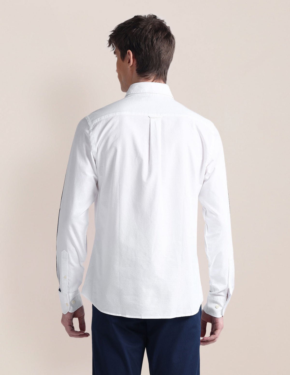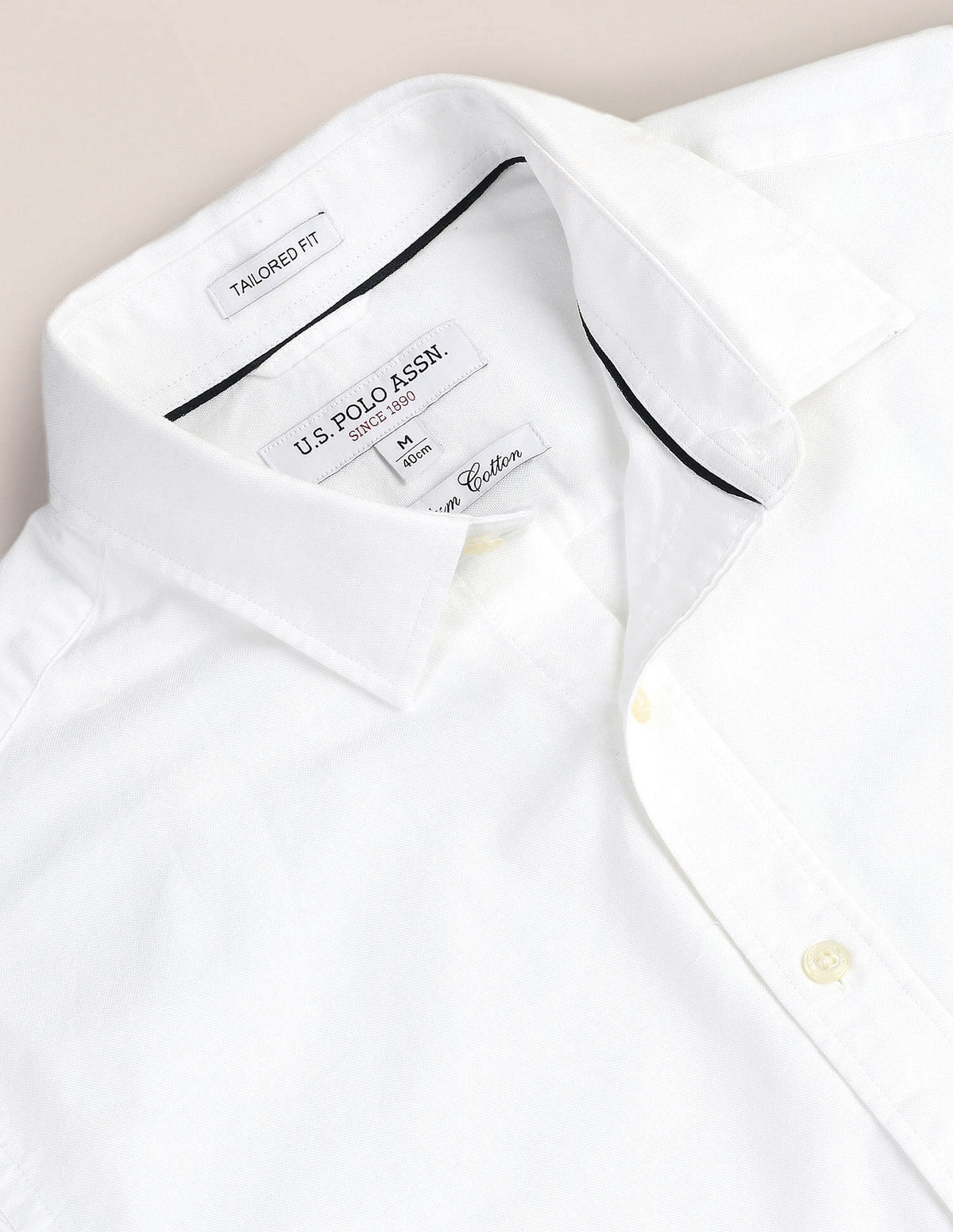| Semi-cutaway collar | Logo at chest | Full button placket | Long sleeves with rounded cuffs | Contrast taping at sleeves | Curved hemline | Solid pattern | Regular weave | Brand fit: Tailored fit | Fit mapping: Regular fit
