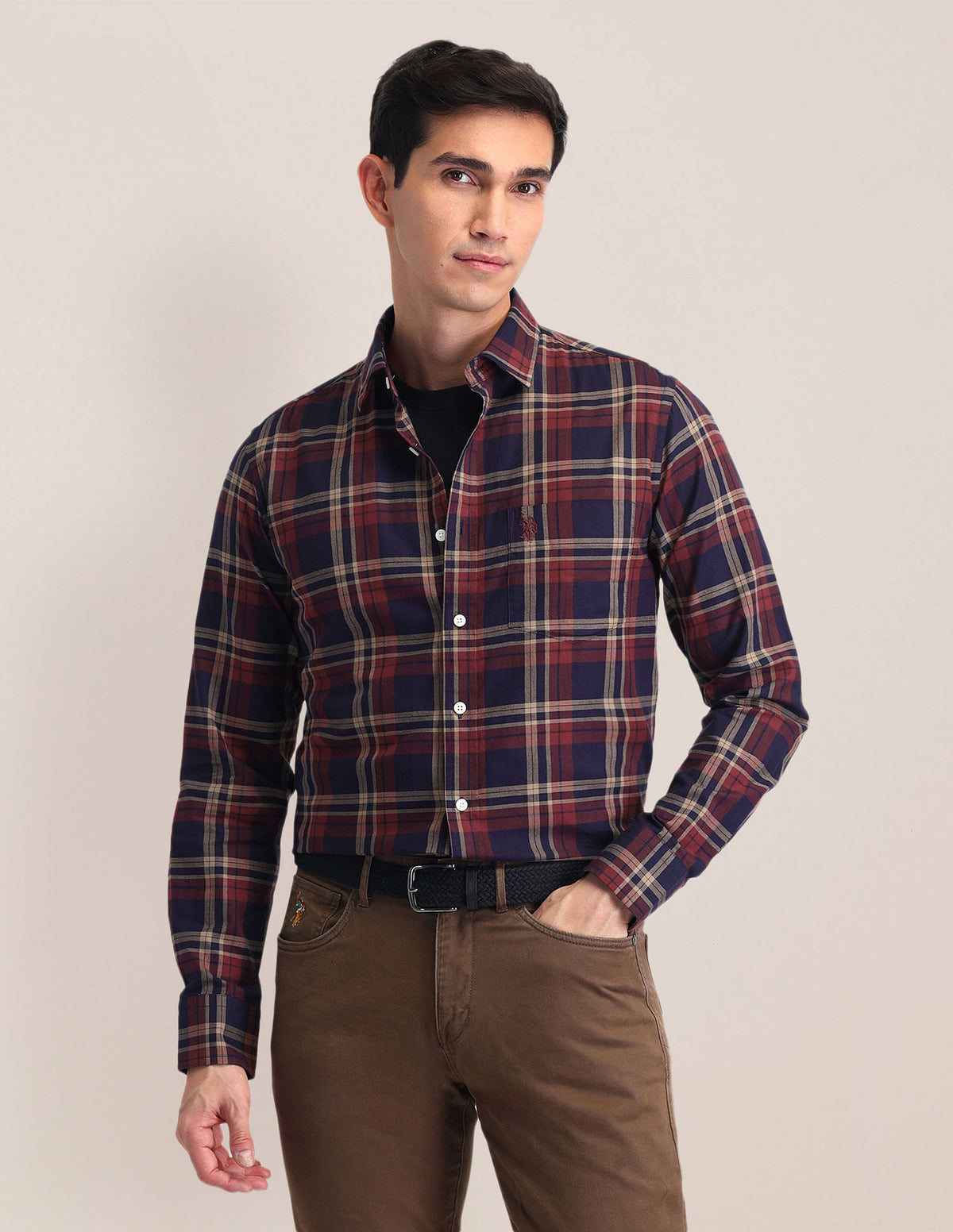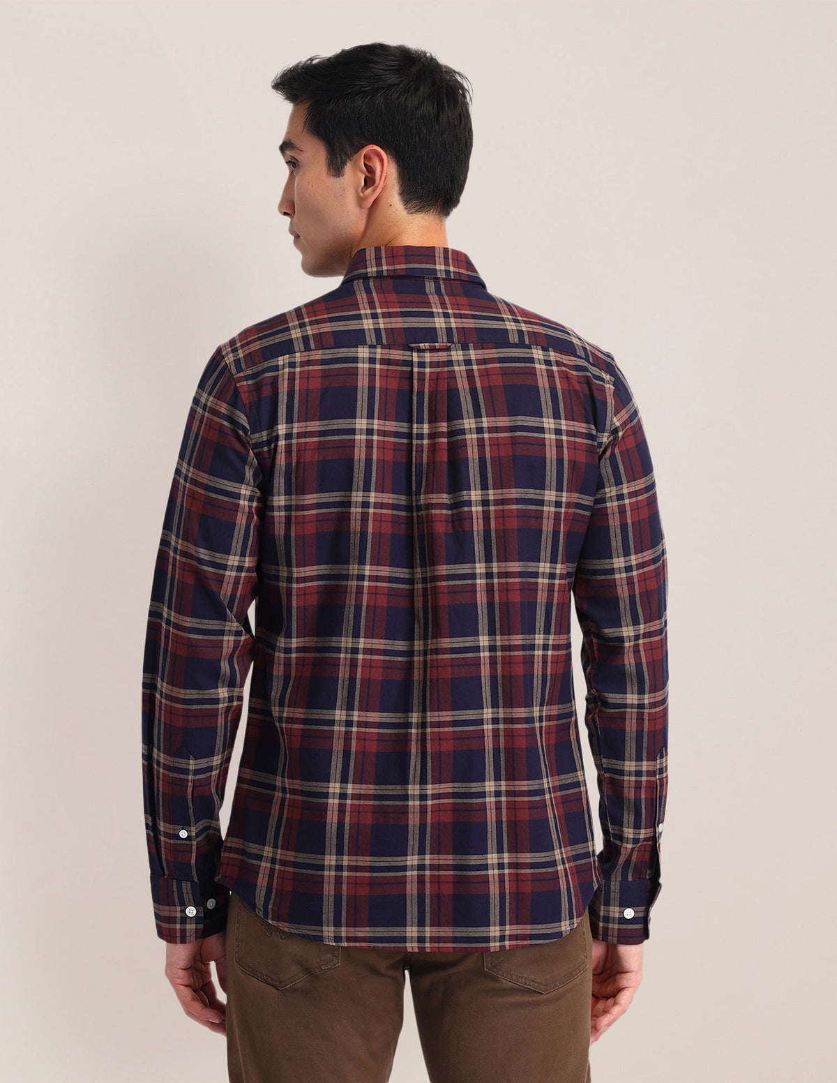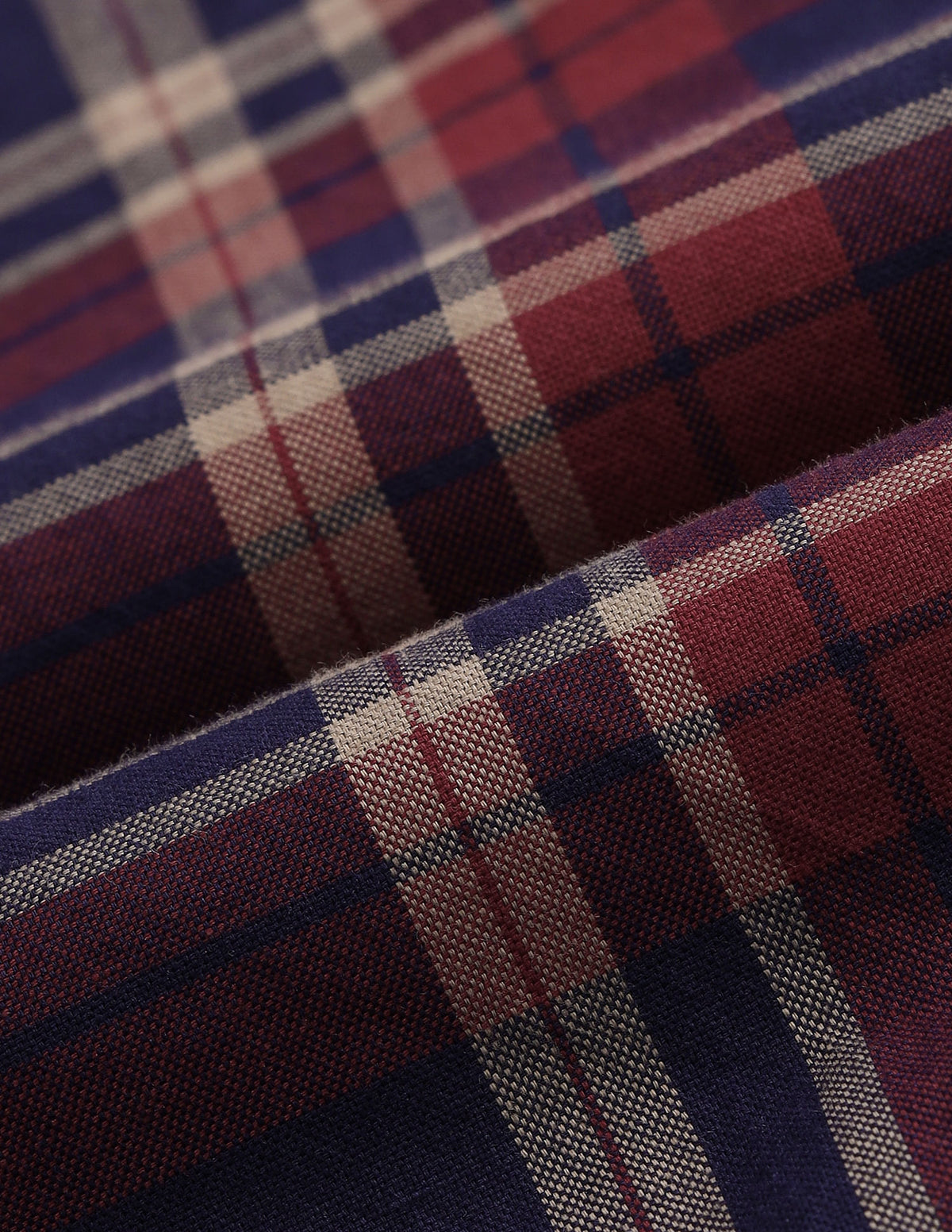 | Semi-spread collar | Logo at chest | Full button placket | Long sleeves with rounded cuffs | Curved hemline | Tartan checked pattern | Dobby weave | Tailored fit |