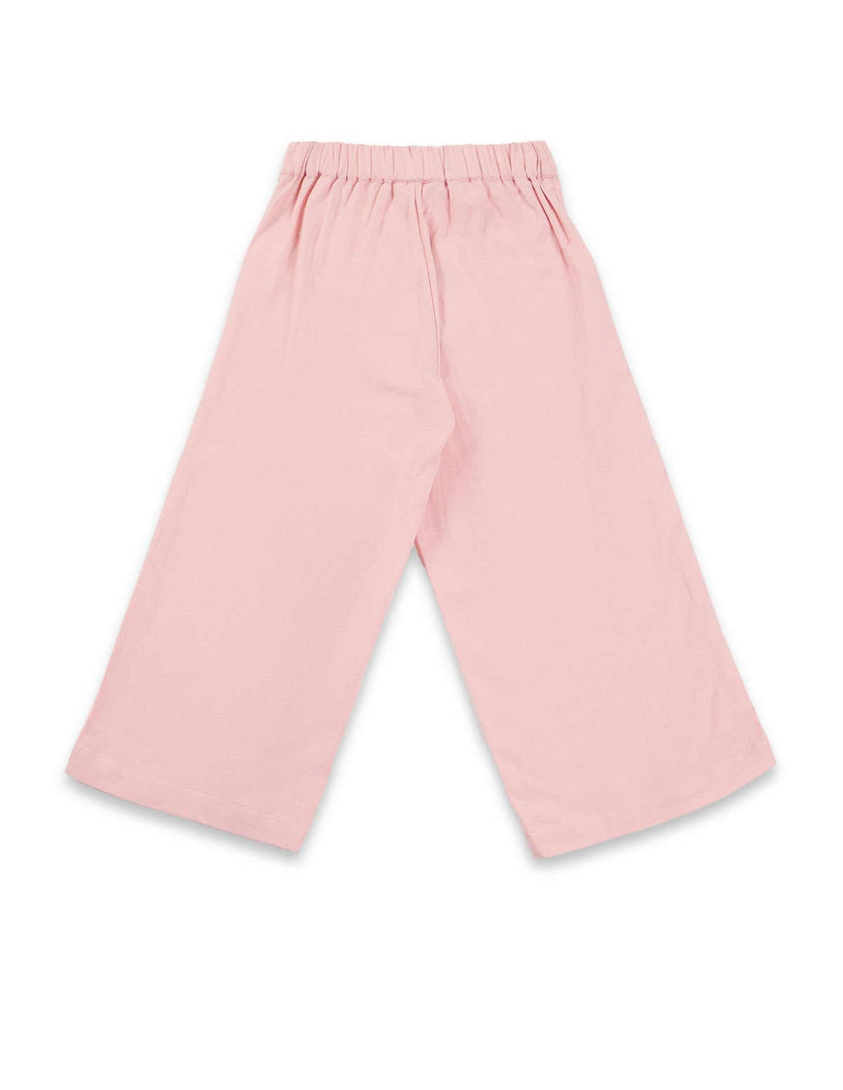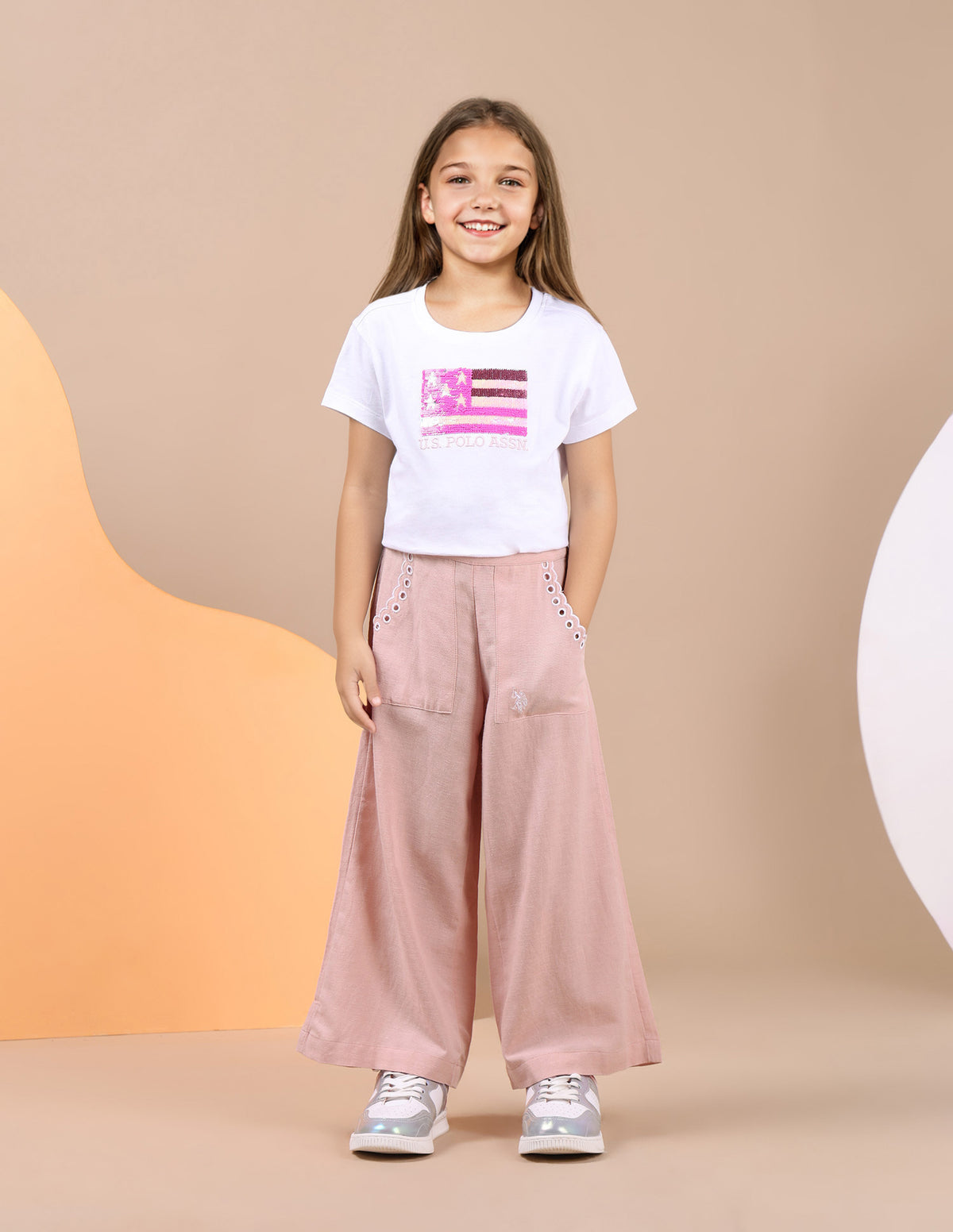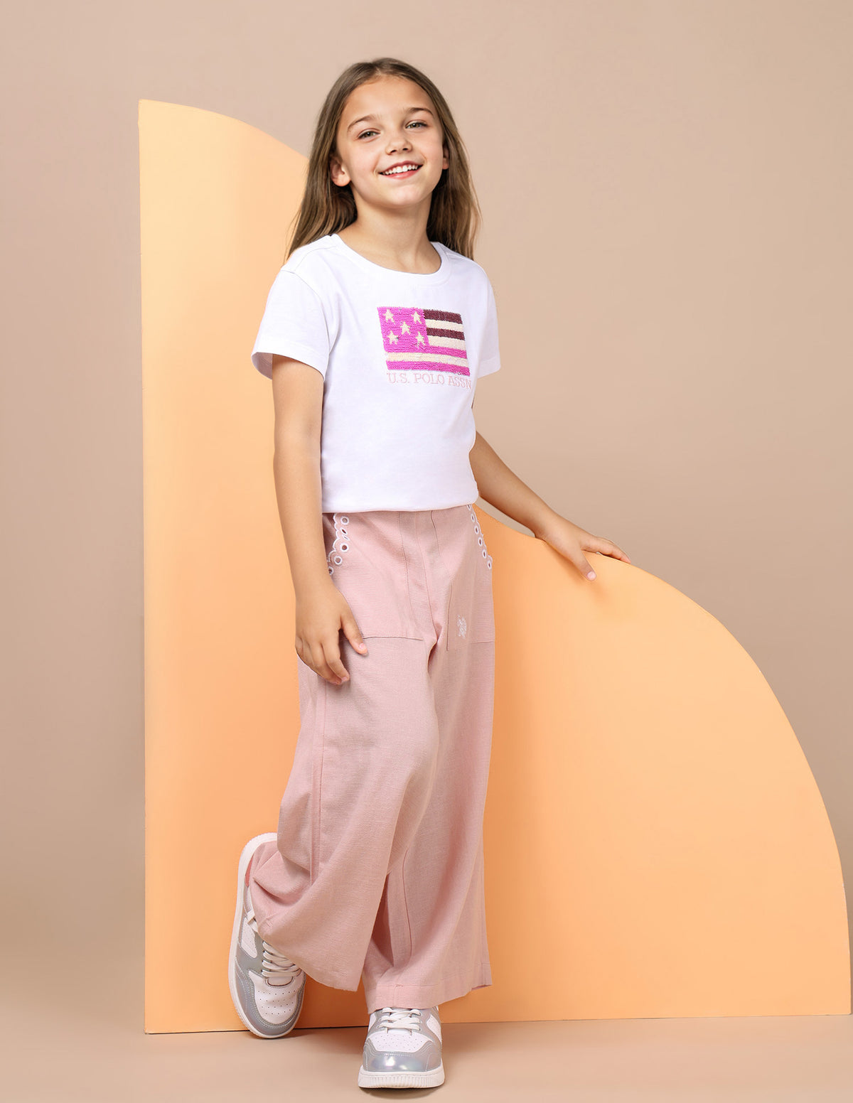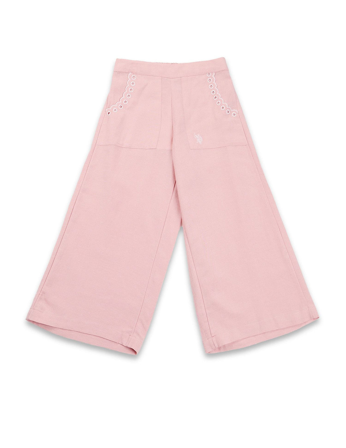 | Mid-rise waist with elastic at back | Button and zip fly closure | Two pockets | Flat front | Solid pattern | Regular weave | Wideleg |