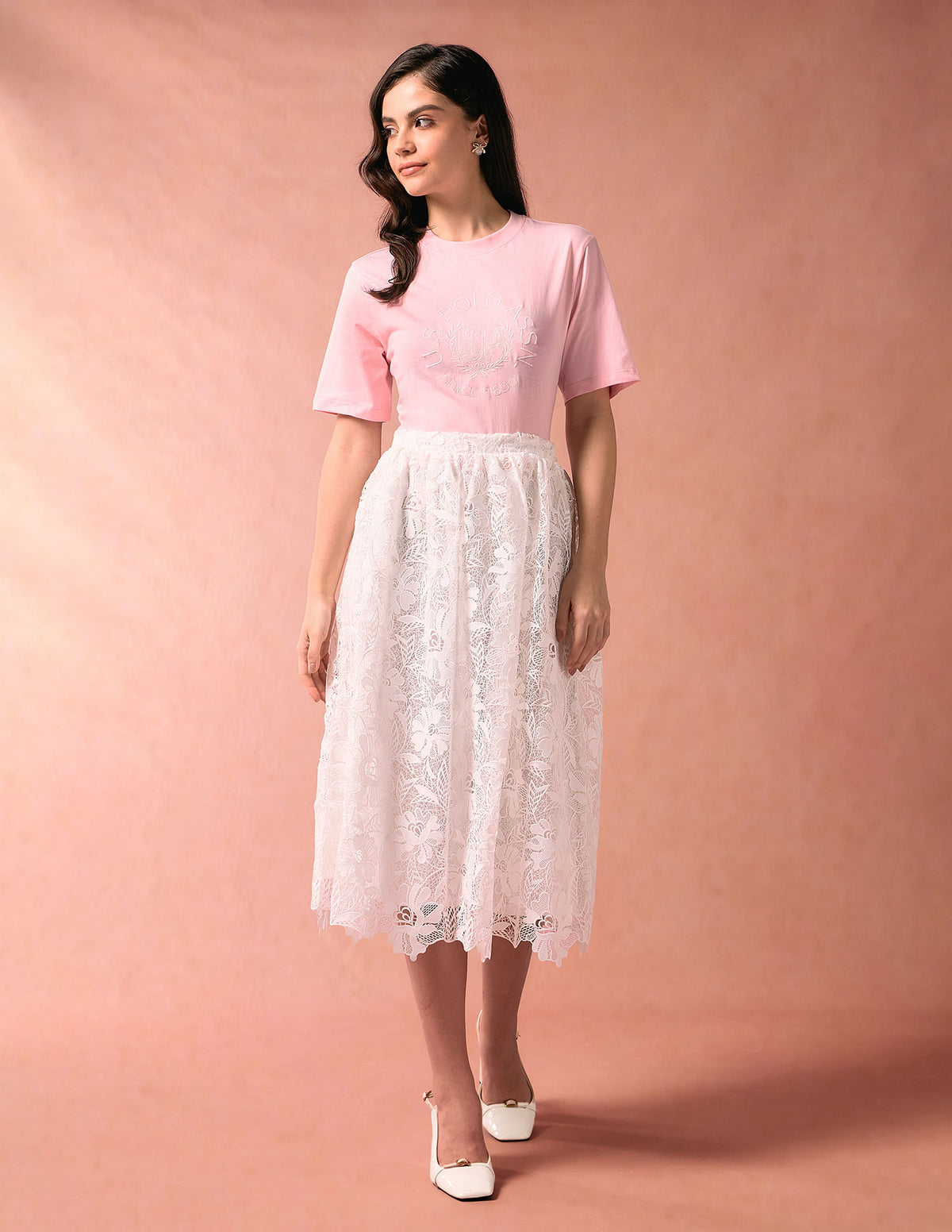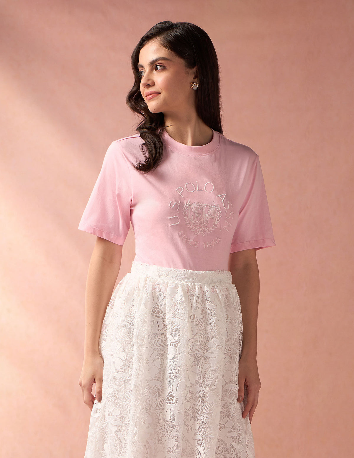 | Ribbed crew neck | Short sleeves | Straight hemline | Brand embroidered pattern | Single jersey knit | Boxy fit | Country Of Origin - India