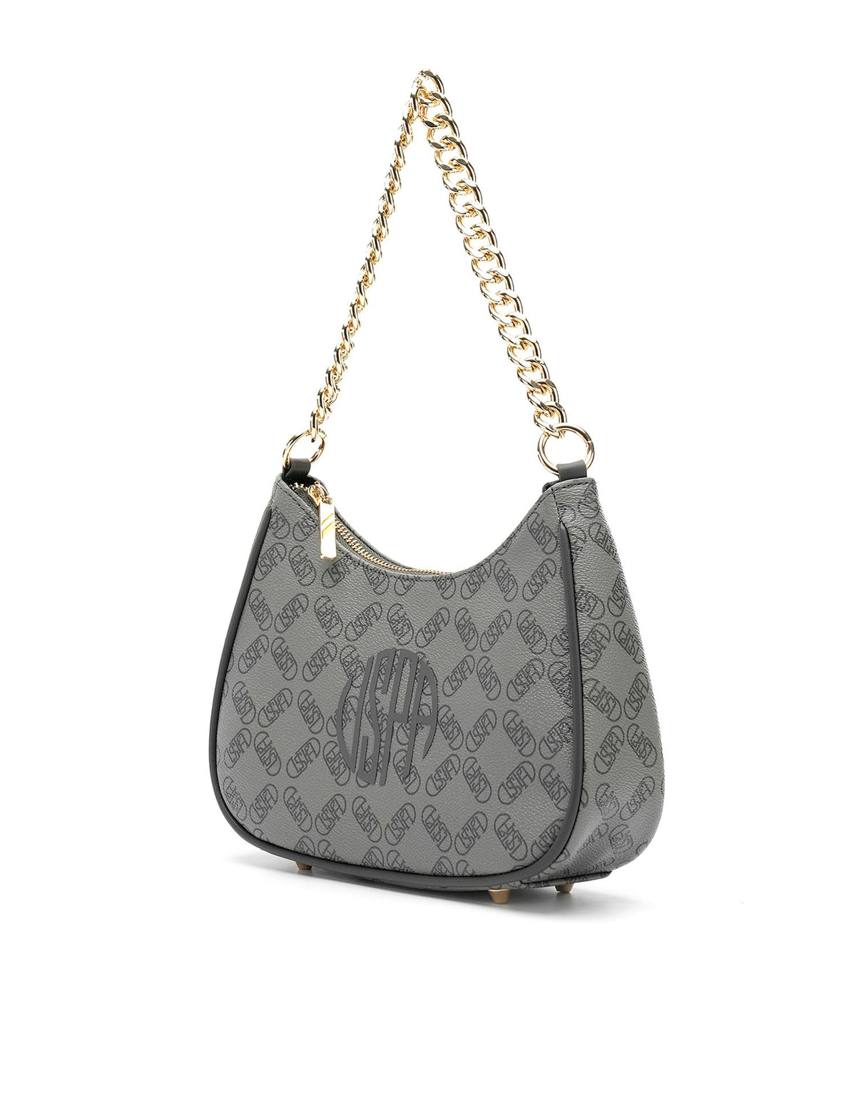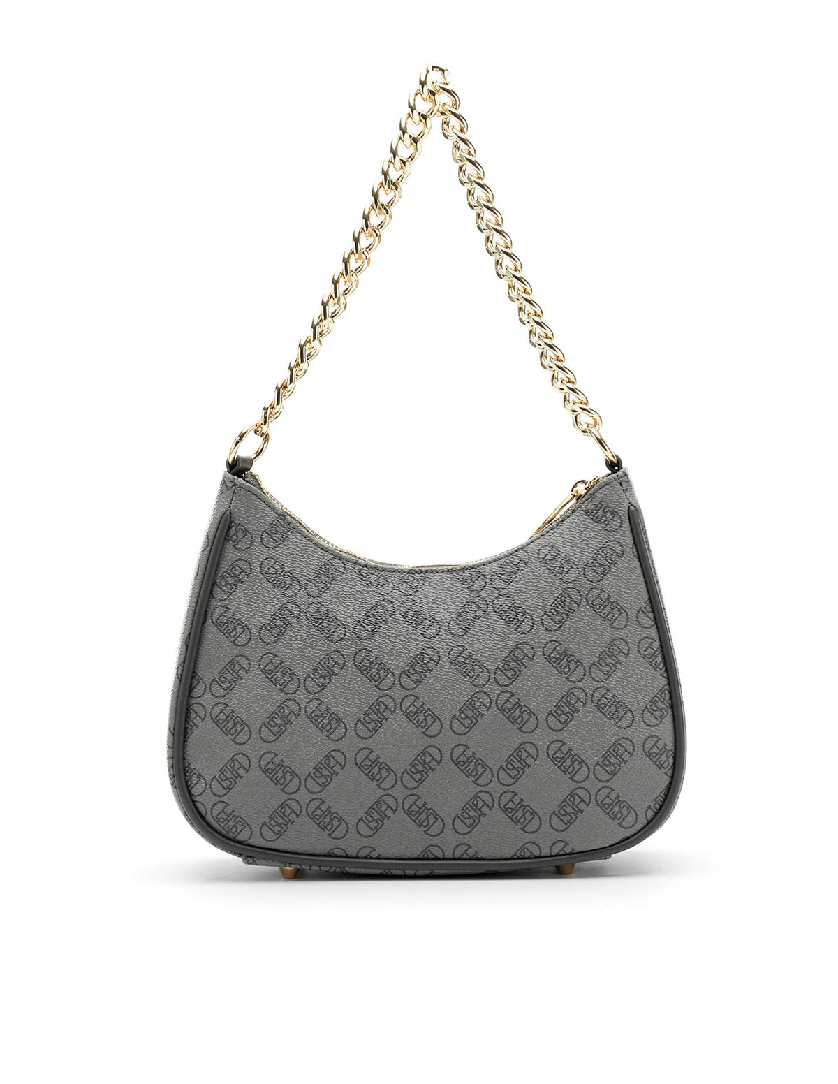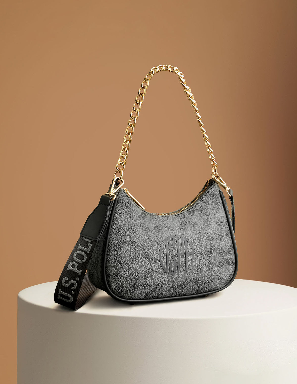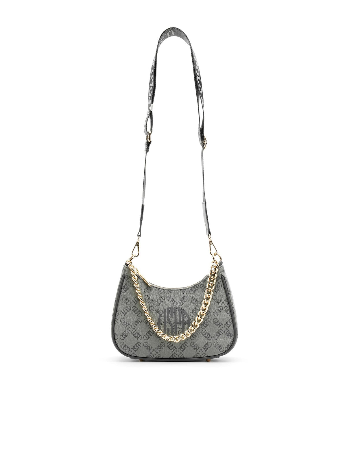 | Adjustable shoulder strap with woven branding | Metallic logo accent at front | One main compartment with flap closure | One inner pocket with zipper closure | Brand printed pattern |