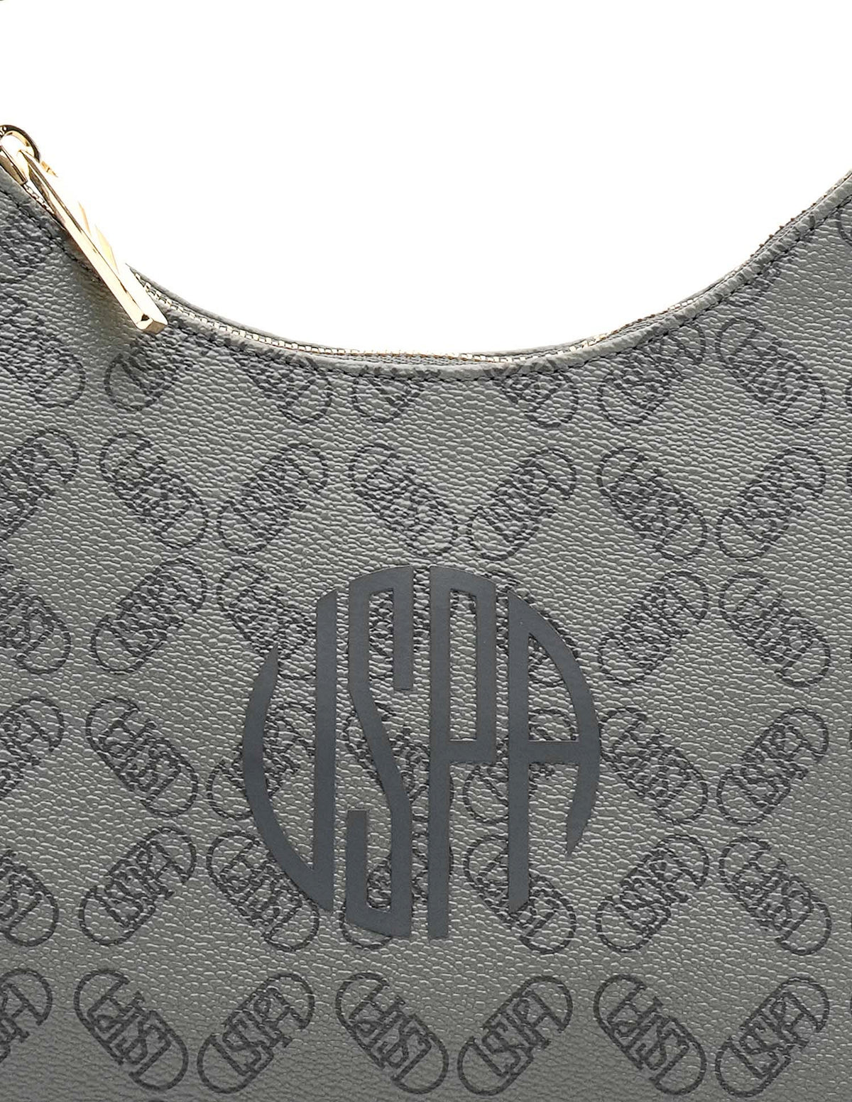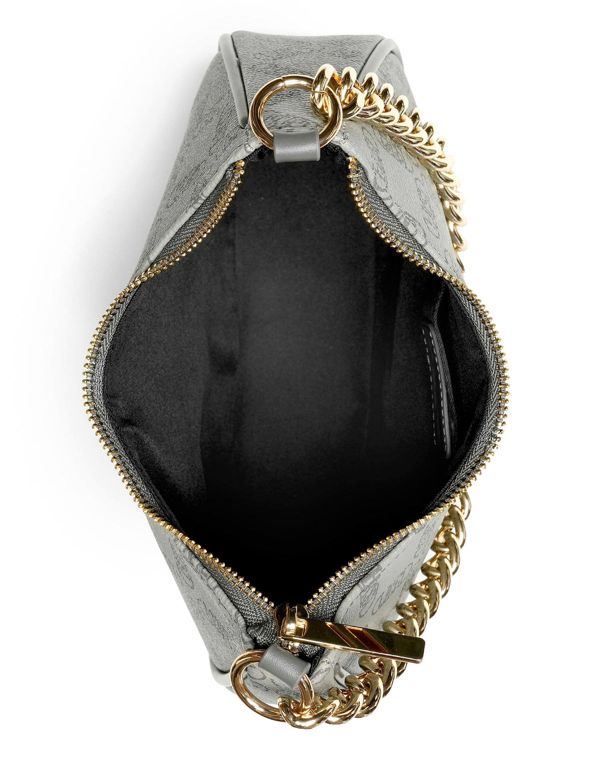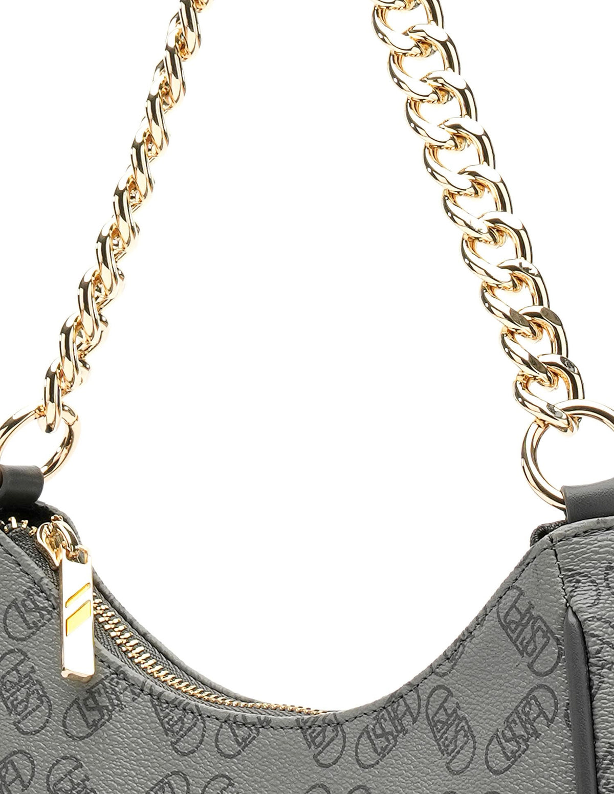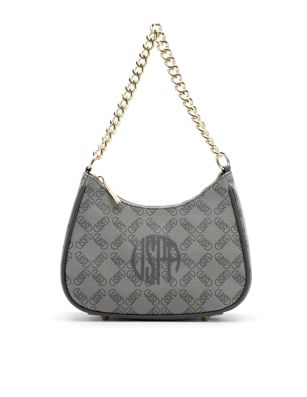 | Adjustable shoulder strap with woven branding | Metallic logo accent at front | One main compartment with flap closure | One inner pocket with zipper closure | Brand printed pattern |