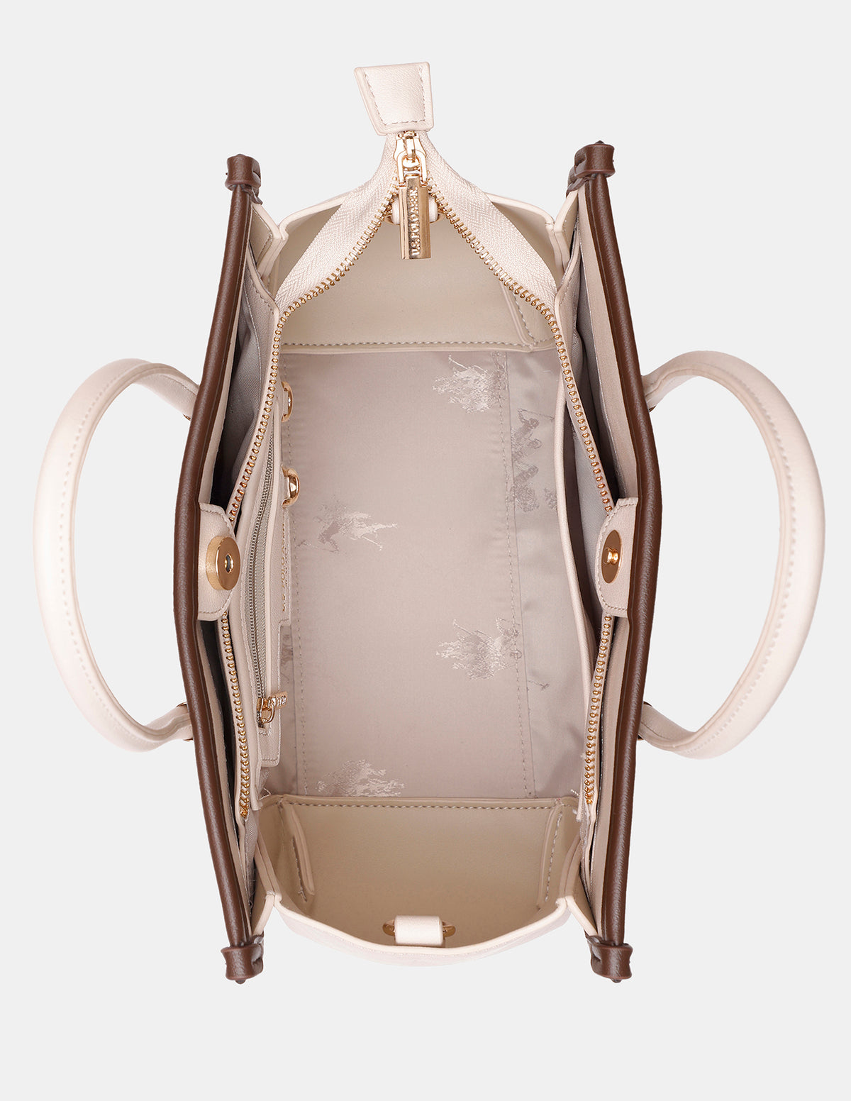 - Metallic monogram accent at front