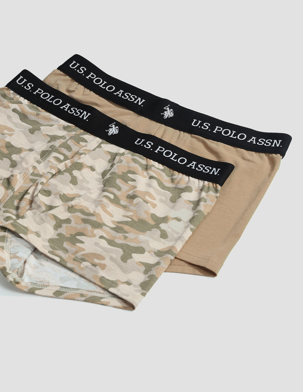 | Pack of 2: | Mid-rise sits comfortably at your waist | Soft stretch elasticised waistband with branding | Double-layered pouch provides enhanced support | Full front and rear coverage | Elastane ribbed with logo at hem | One is solid pattern | One is printed pattern | Country Of Origin - India