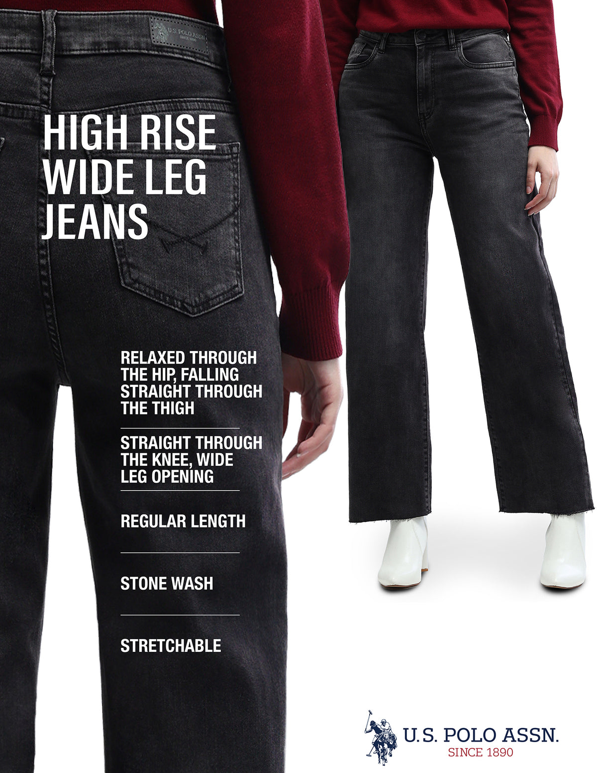 | High-rise waist | Button and zip fly closure | Five pockets | Stonewashed and whiskered | Twill weave | Wideleg fit