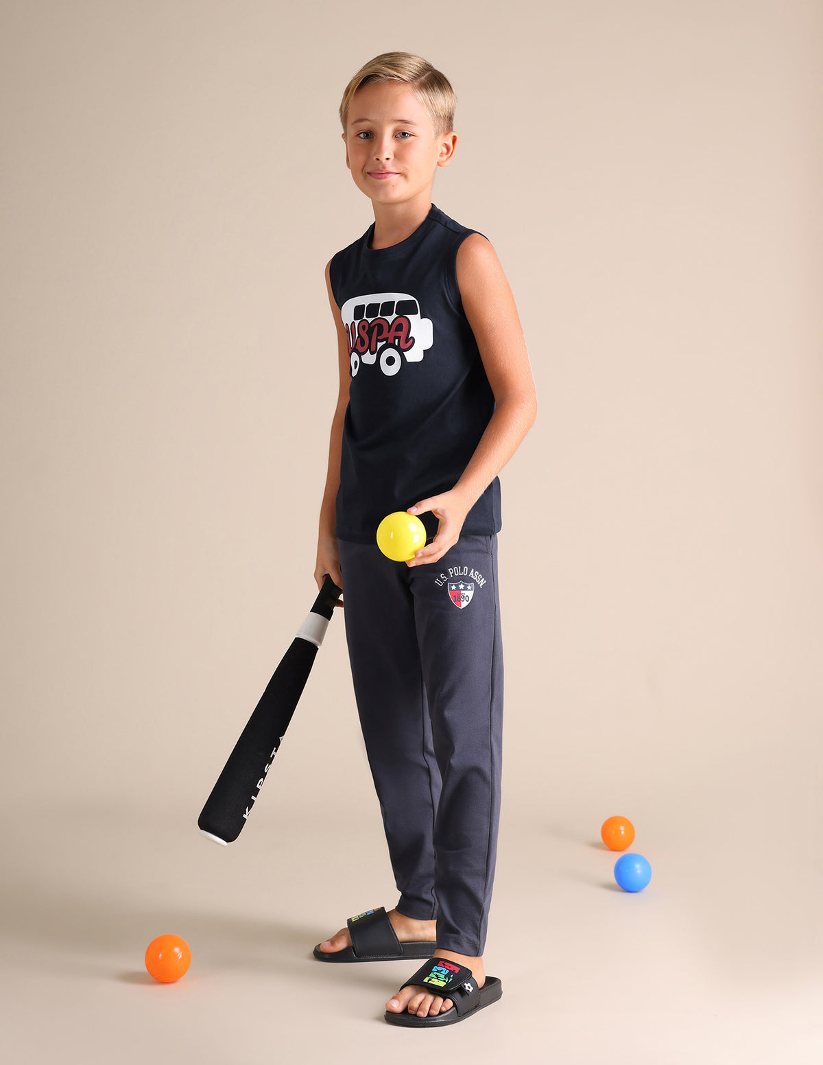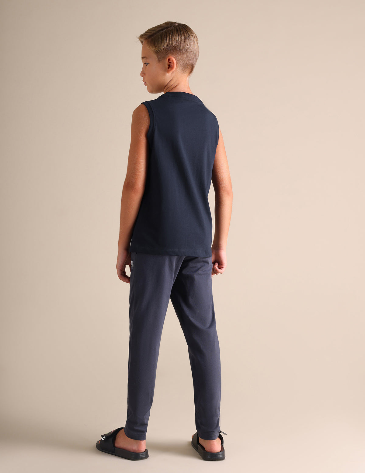 | Pack of 1: | Crew neck ensures shape retention that withstands repeated wash and wear | Sleeveless to keep him comfortable | Straight hemline | Tag-less design for zero irritation | Light and airy cotton fabric | Graphic printed pattern | Knit construction ensures the material is lightweight and comfortable | The pure cotton fabric has better breathability and absorbency | Country Of Origin - India- New Season
