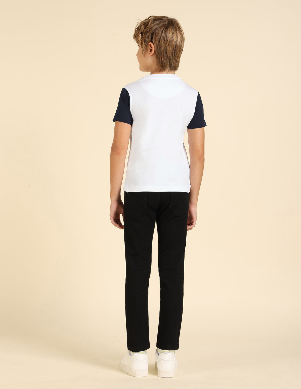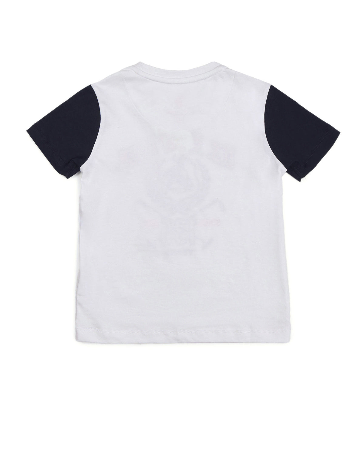 Story: Boys will love this casual t-shirt with front logo and contrast sleeve, perfect for expressing their style.