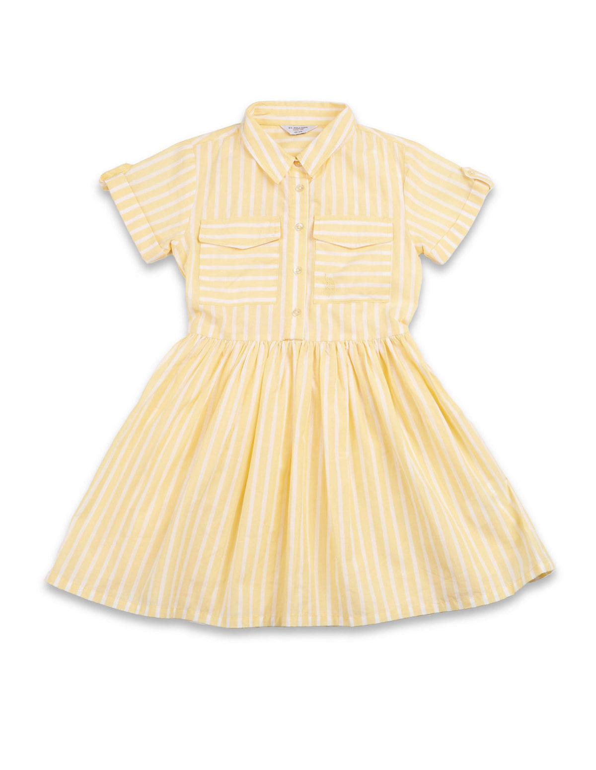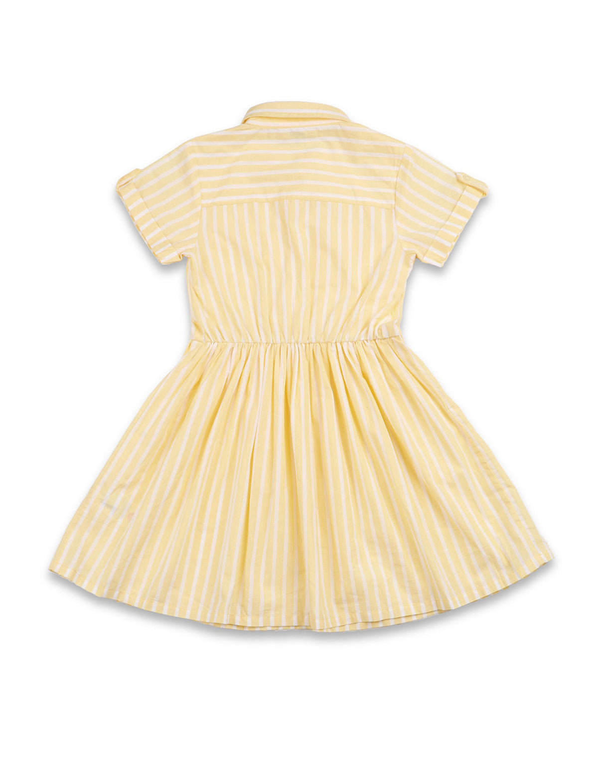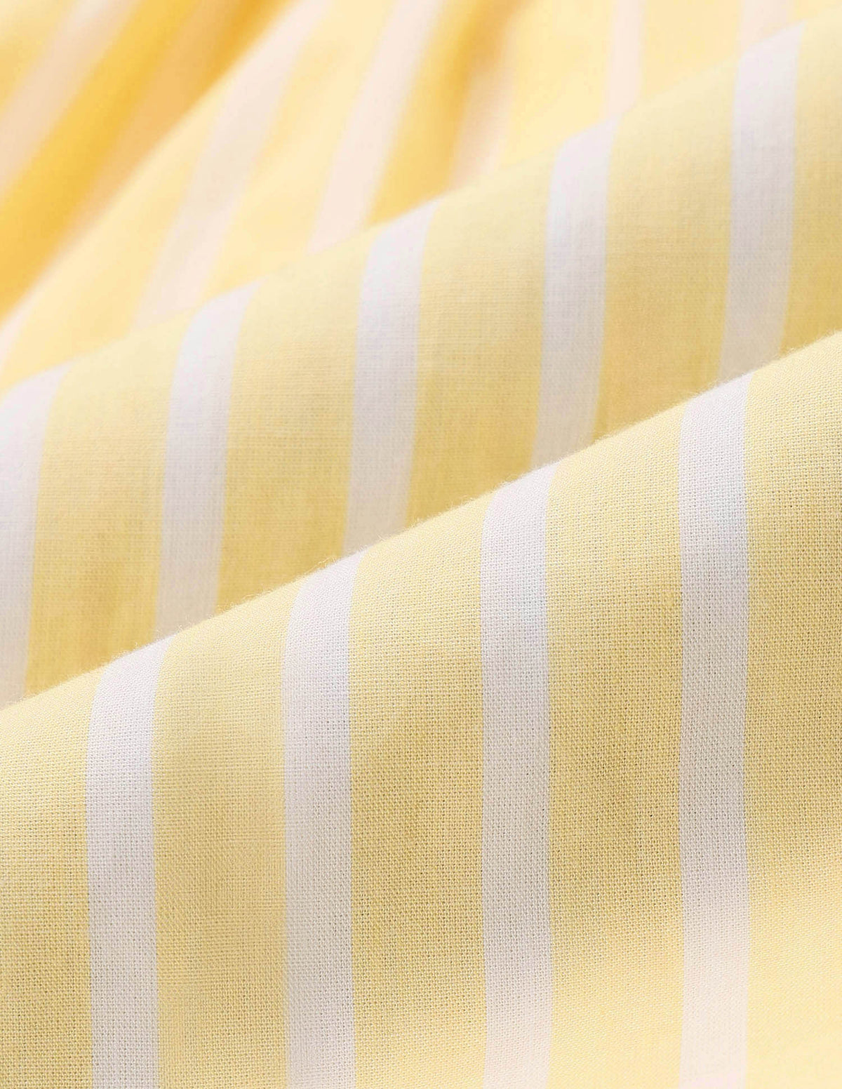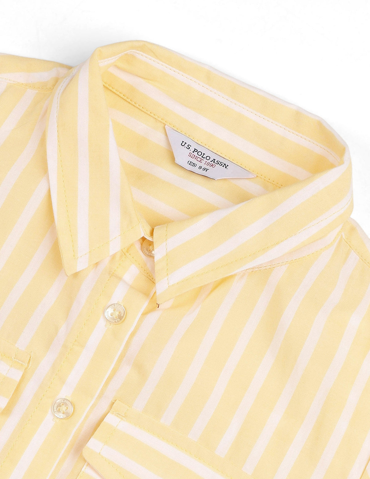 | Shirt collar | Full placket button closure | Short sleeves | Vertical striped pattern | Regular fit |