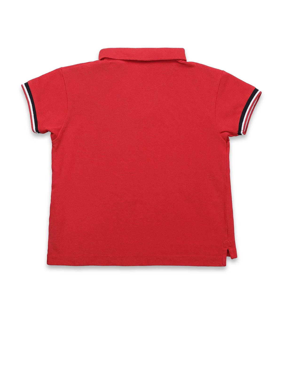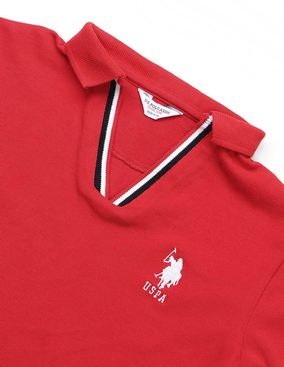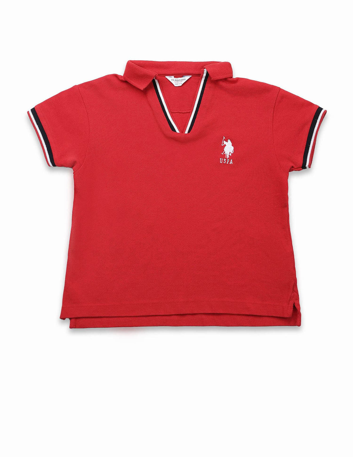 | Polo collar | Logo at chest | Short open placket with stripes | Short sleeves with striped hems | Uneven vented hem | Solid pattern | Knitted | Regular fit |