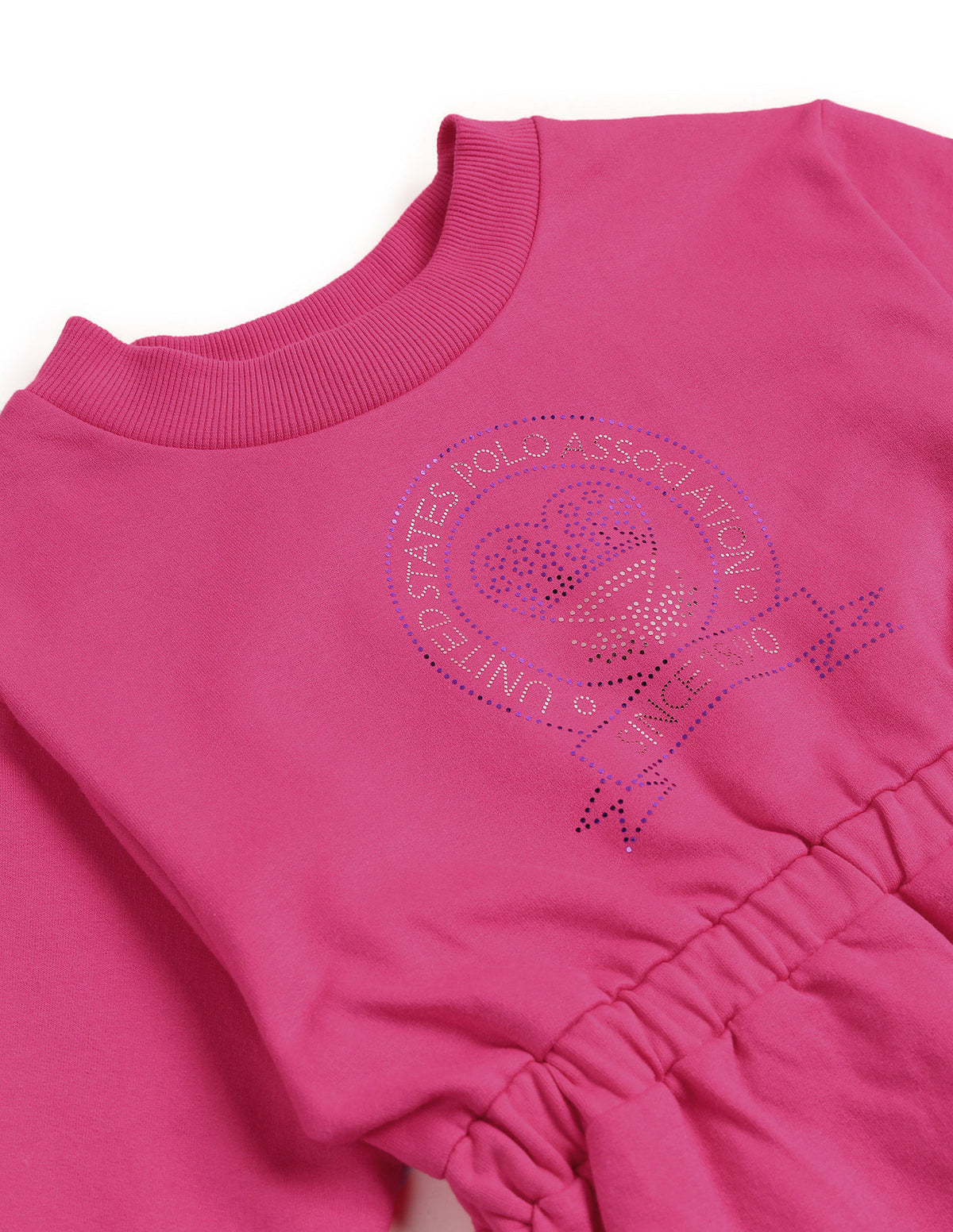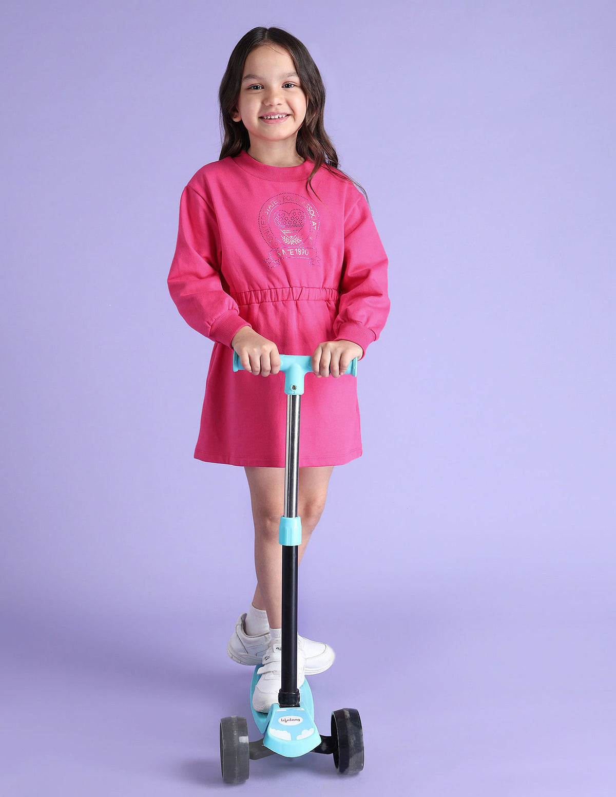 | Round neck | Long sleeves | Elasticized waist | Flared hem | Brand printed pattern | Knitted | Regular fit |