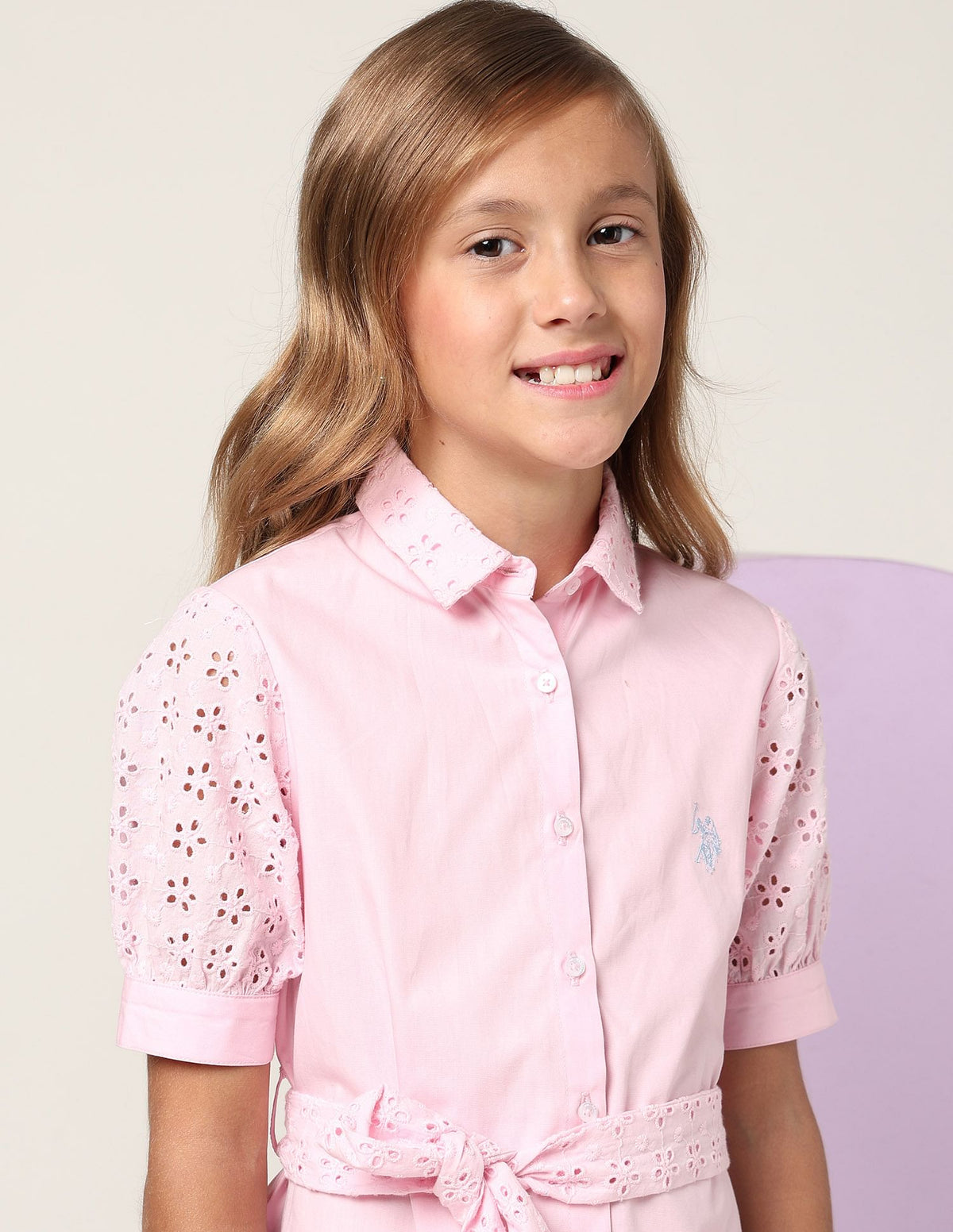 | Shirt collar | Button closure | Short sleeves | Schiffli pattern | Regular fit |