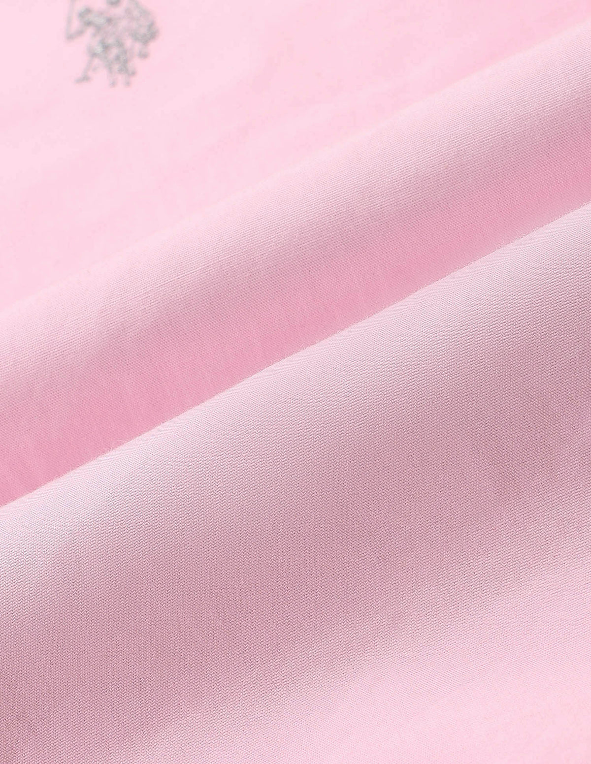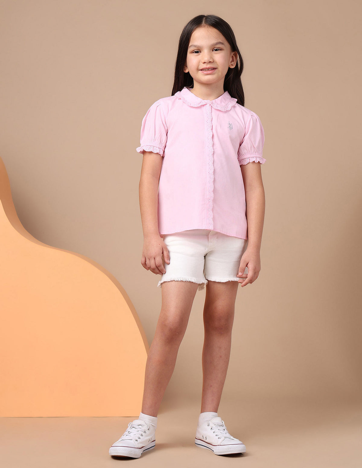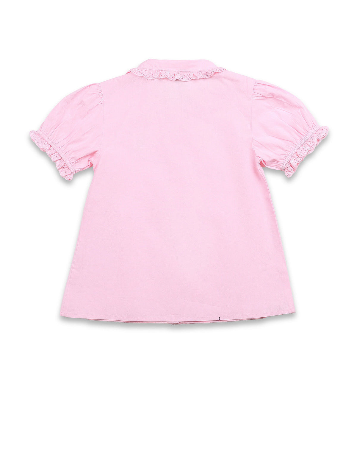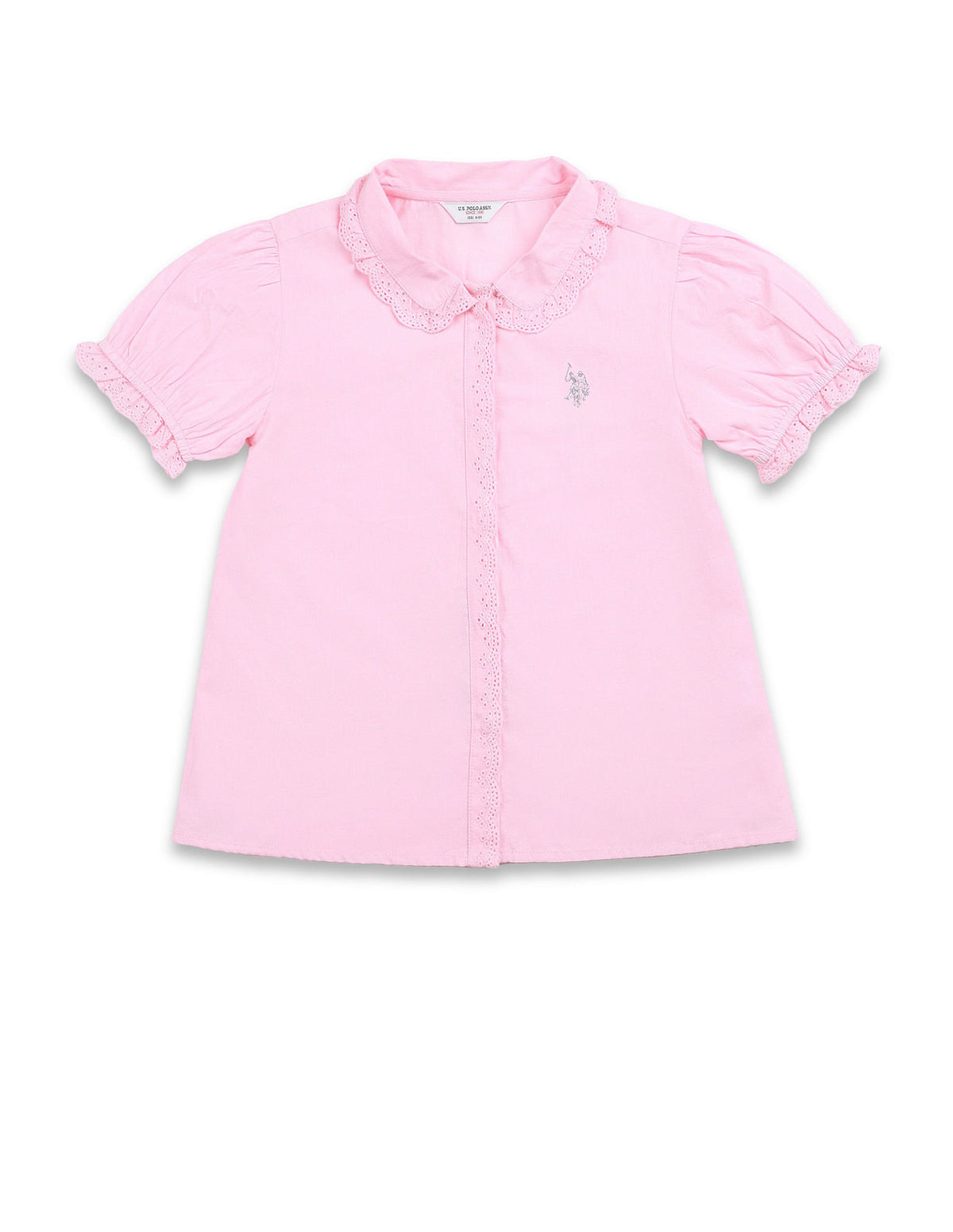 | Spread collar with schiffli | Logo at chest | Full button placket | Short sleeves | Straight hemline | Solid pattern | Regular fit |