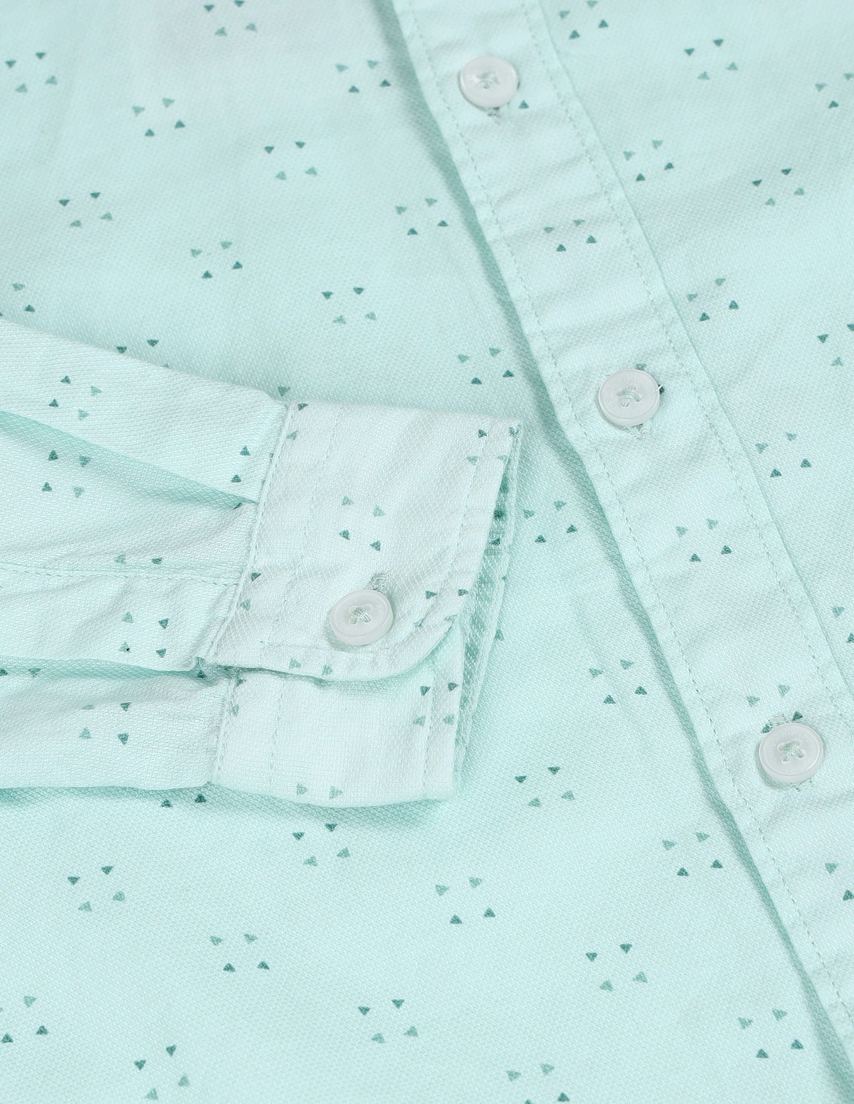 | Spread collar | Logo at chest | Full button placket | Long sleeves with mitered cuffs | Curved hemline | Geometric printed pattern | Dobby weave | Regular fit |