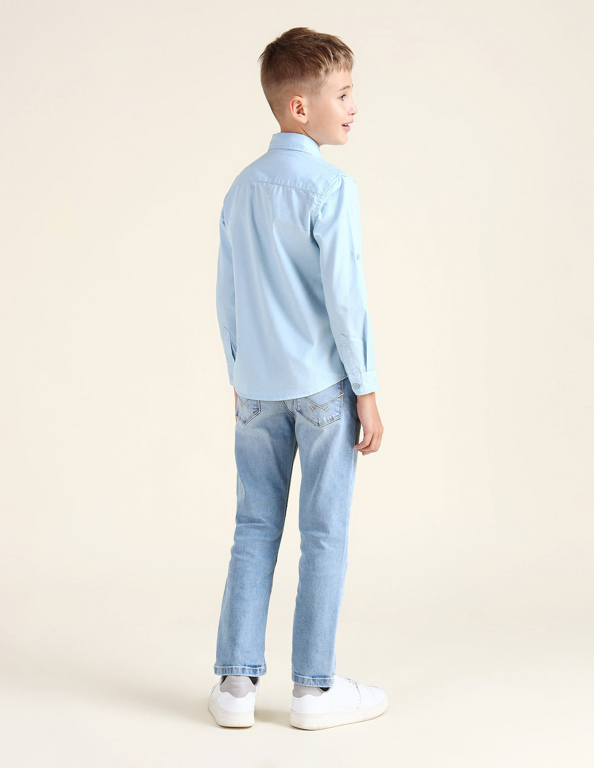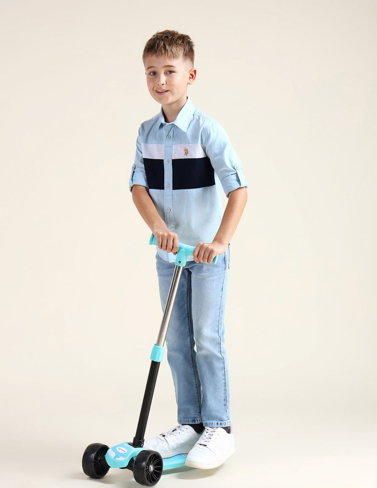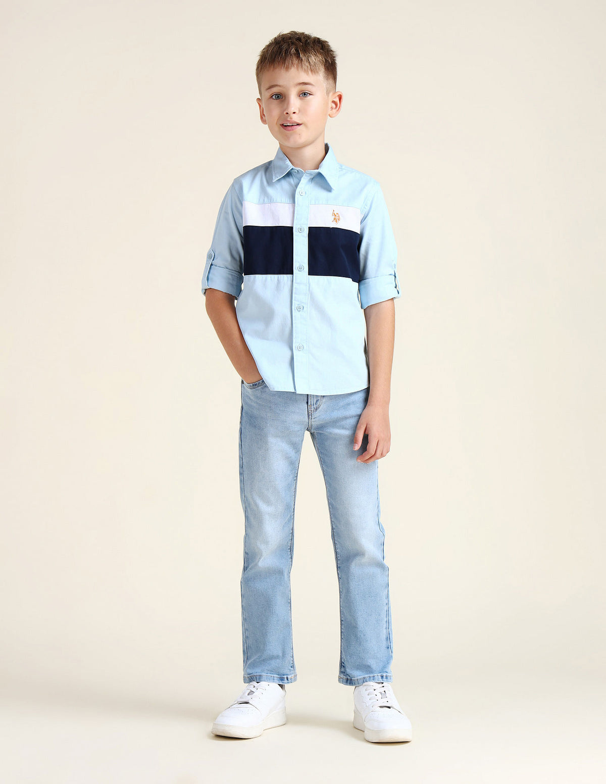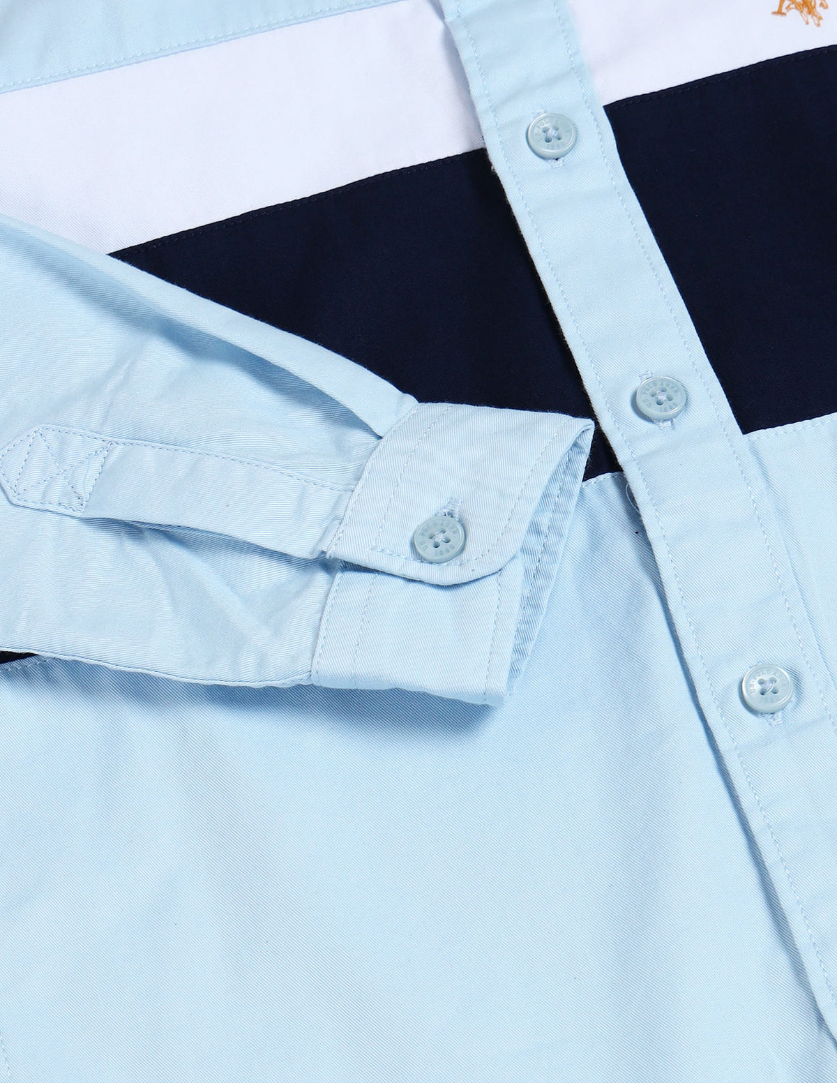 | Spread collar | Embroidered logo at chest | Full button placket | Long sleeves with rounded cuffs | Curved hemline | Colourblocked pattern | Twill weave | Regular fit |