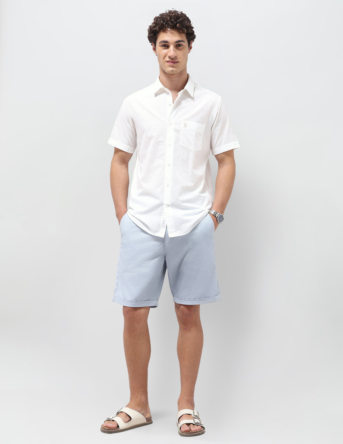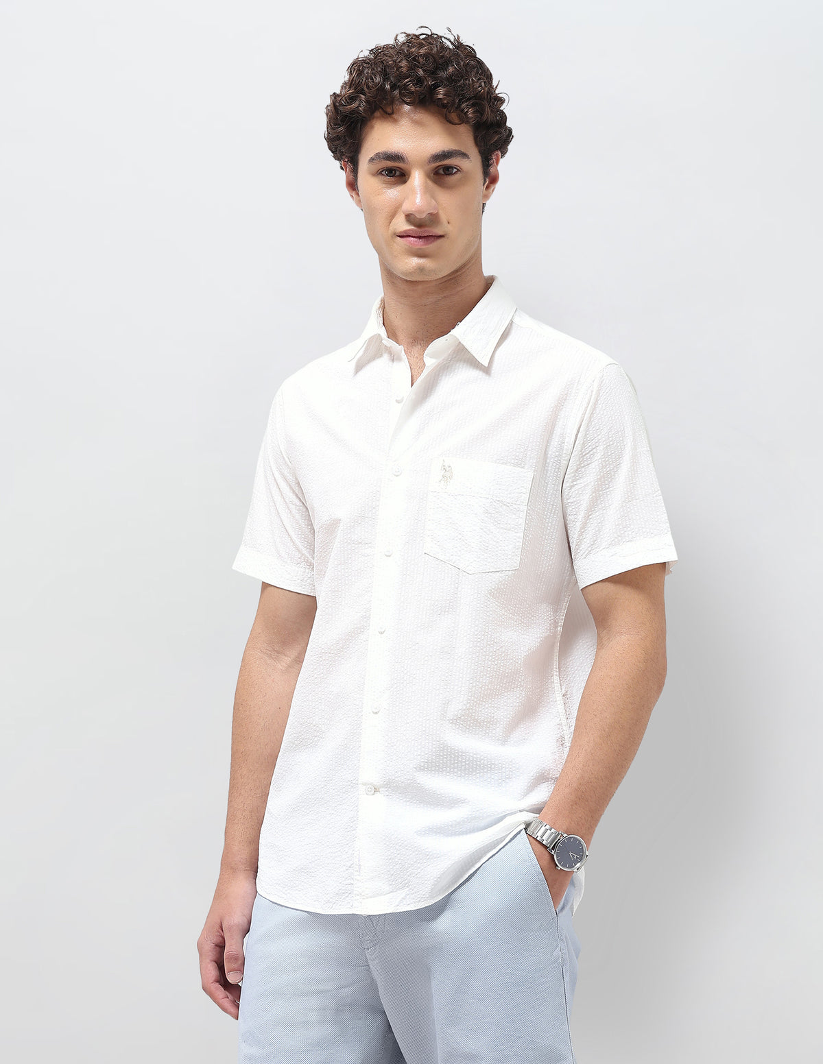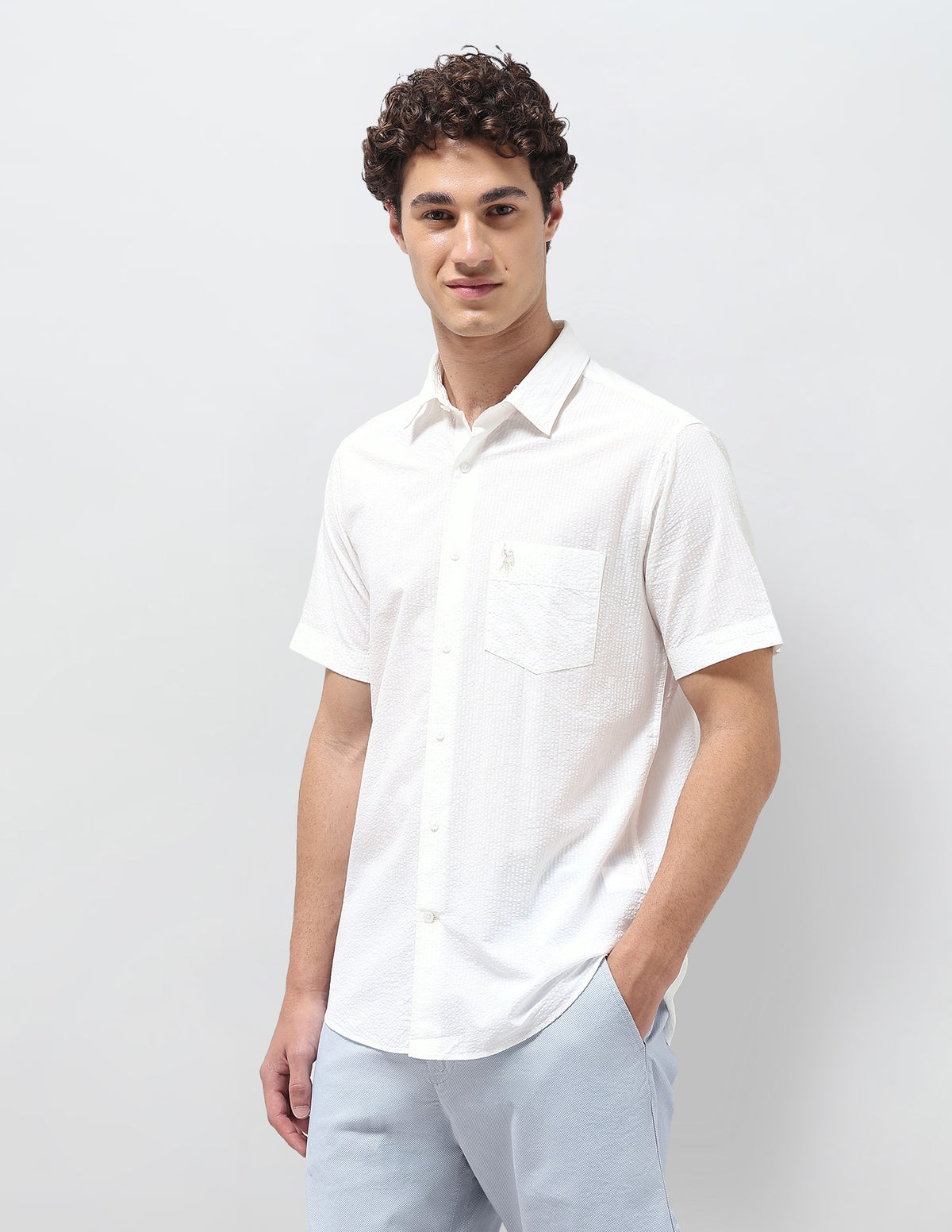 Story: Crafted in yds seersucker fabric, this men's shirt features vertical pinstripes that bring textured comfort and breezy sophistication to casual wear with effortless style.